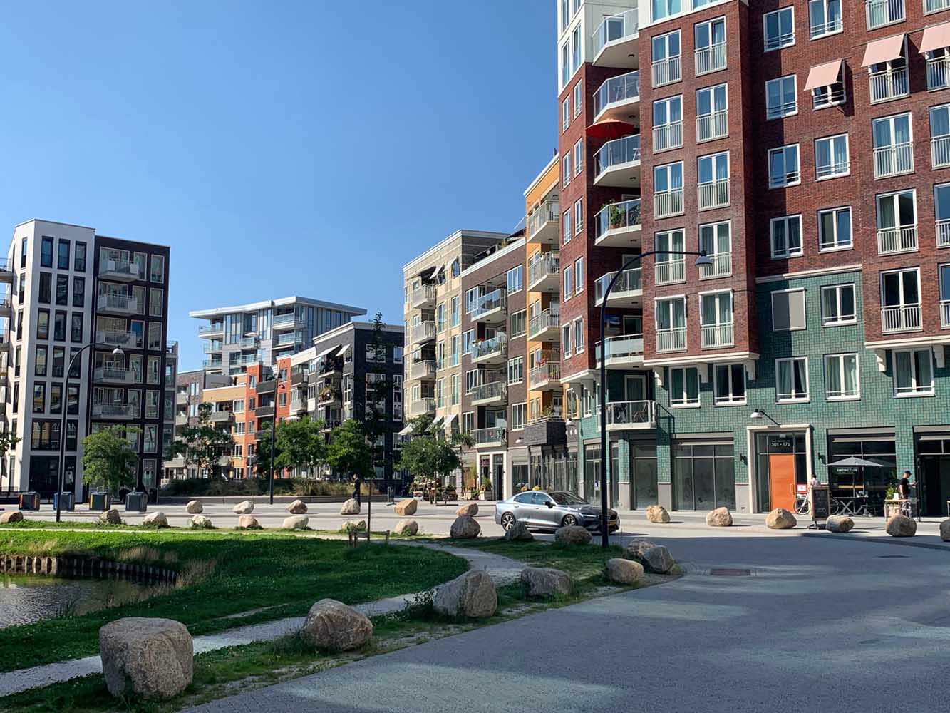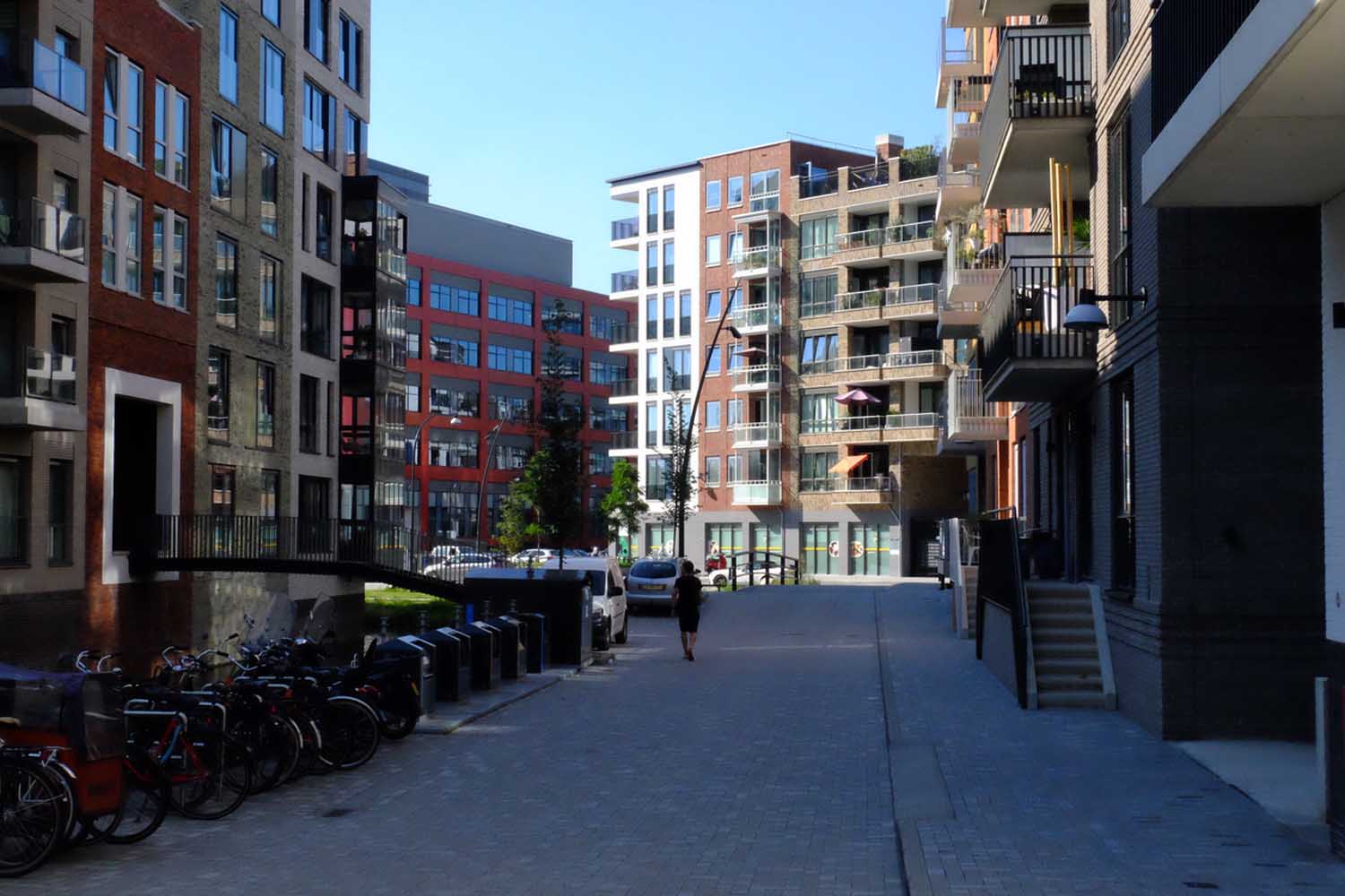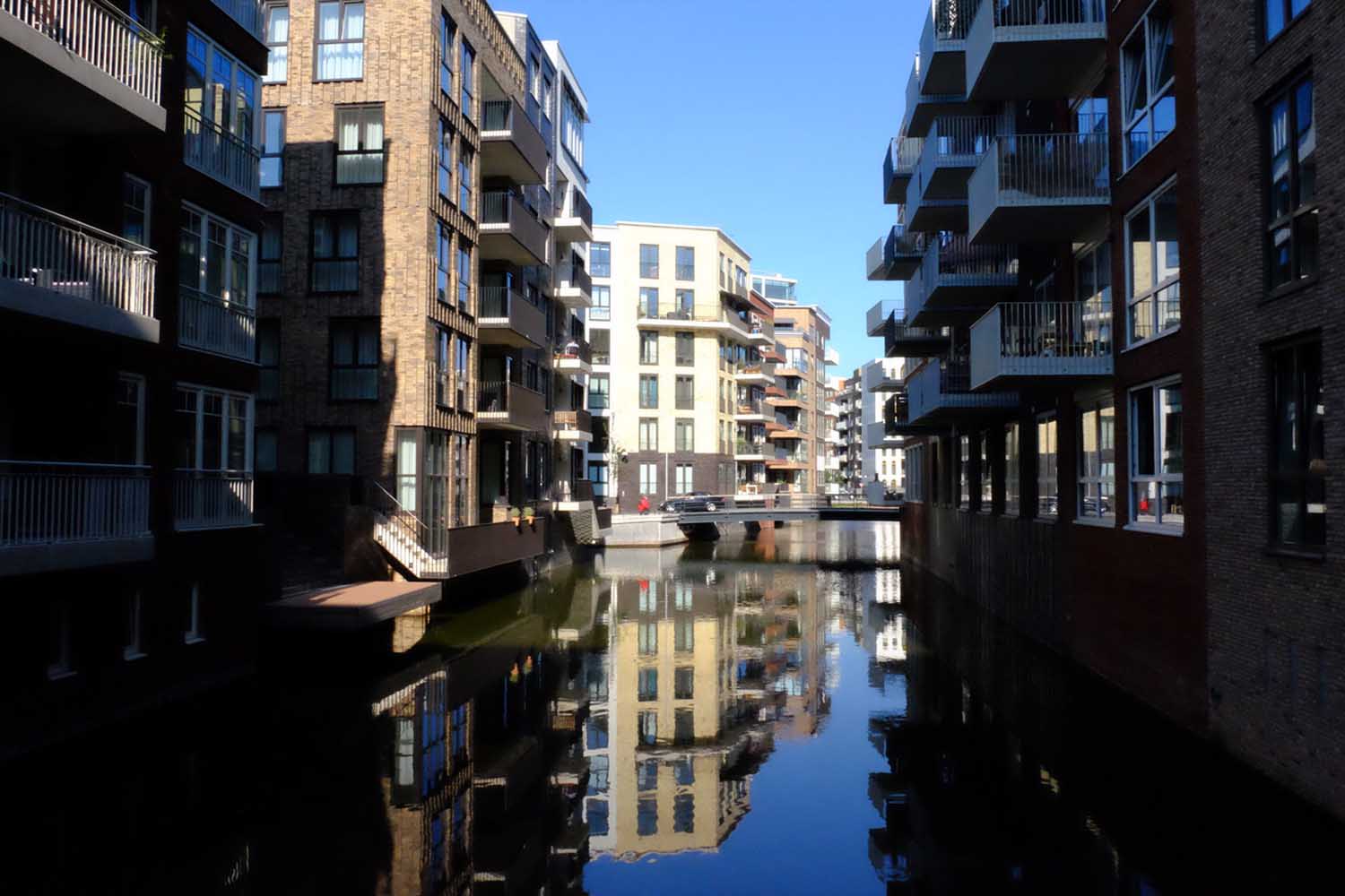 We lopen door de wijk Holland Park en die is al een flink eind op streek. De appartementen zijn verkocht, de wijk wordt bewoond, de laatste bouw wordt gerealiseerd. Er zijn grachtjes en licht gebogen straatwanden, zes tot acht lagen hoog, met hier en daar een hoger accent.