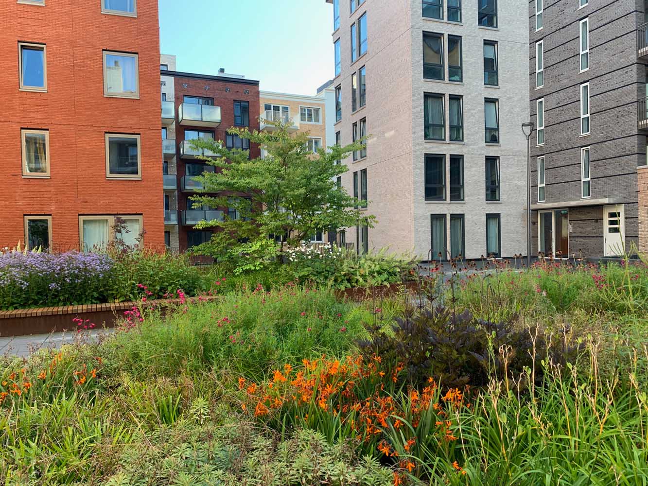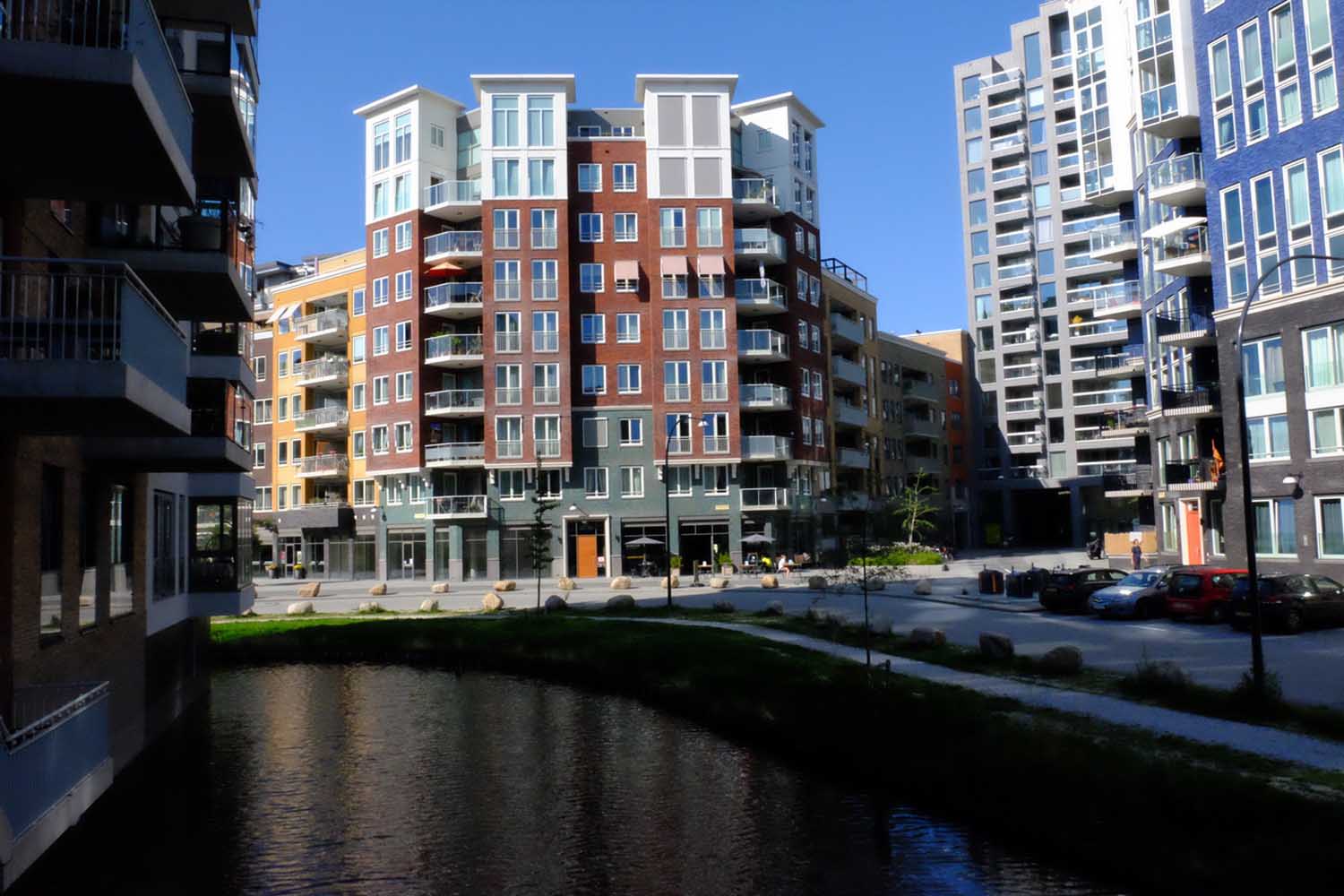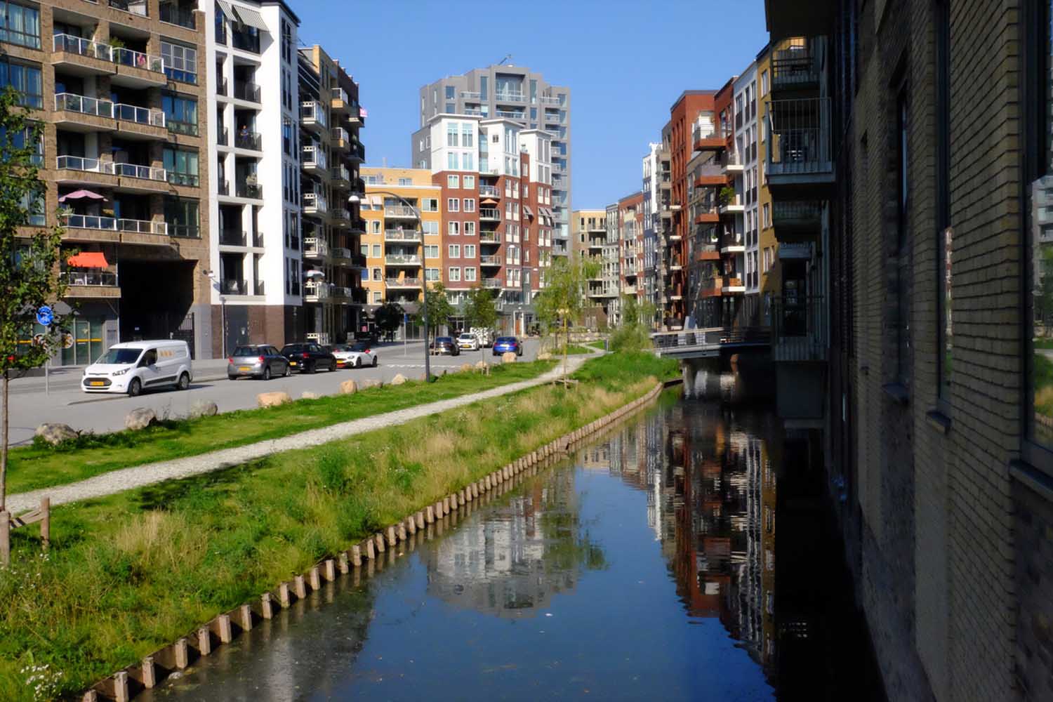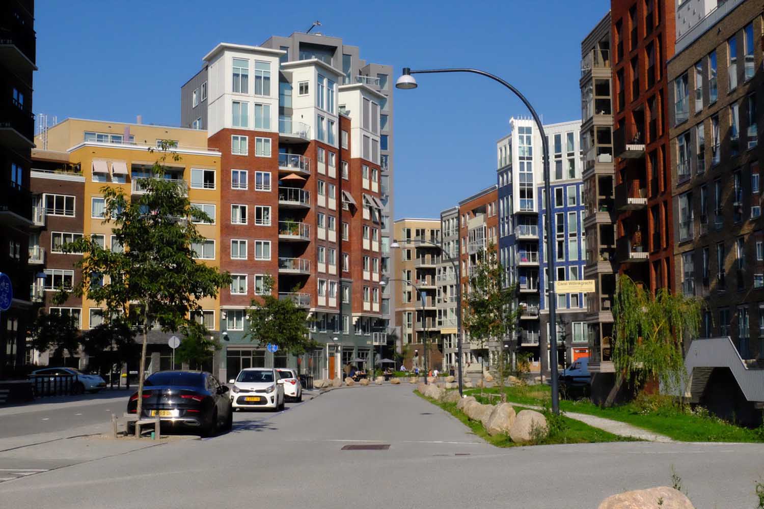 We lopen door de wijk Holland Park en die is al een flink eind op streek. De appartementen zijn verkocht, de wijk wordt bewoond, de laatste bouw wordt gerealiseerd. Er zijn grachtjes en licht gebogen straatwanden, zes tot acht lagen hoog, met hier en daar een hoger accent.
