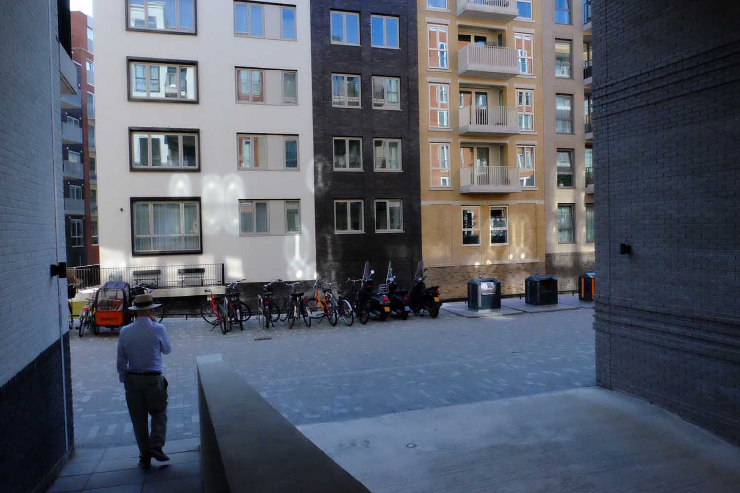 Wandelend ontvouwt de wijk zich met gevels, grachtjes, bestrating en voetgangerroutes door binnenterreinen. Bosse vindt het effect van de parkeergarages en het water wonderbaarlijk.