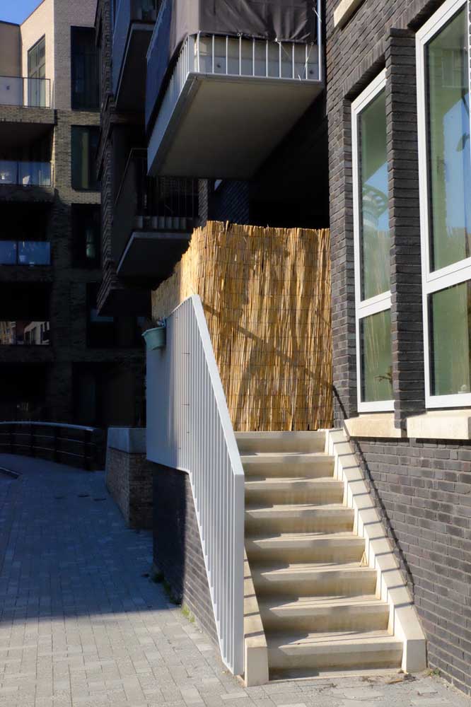 Bosse komt terug op de organisatie van de plattegrond, op de wisselwerking tussen huis en straat. De begane grond appartementen hebben een trapje naar de straat, en die sluit aan op de privé buitenruimte en niet op een voordeur.