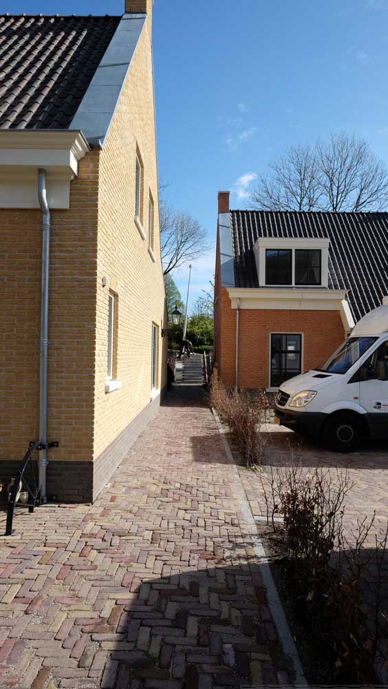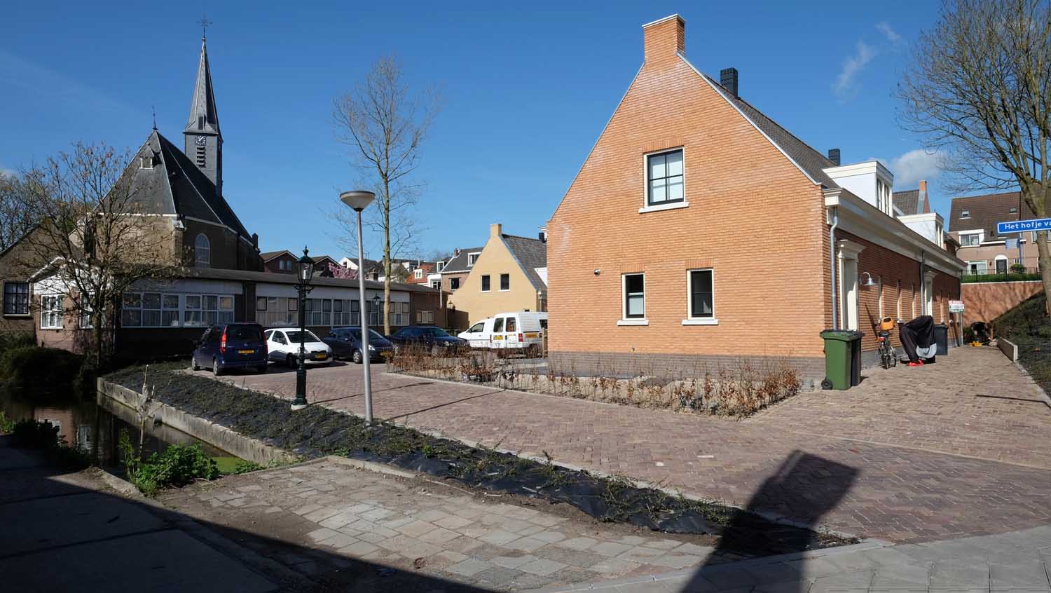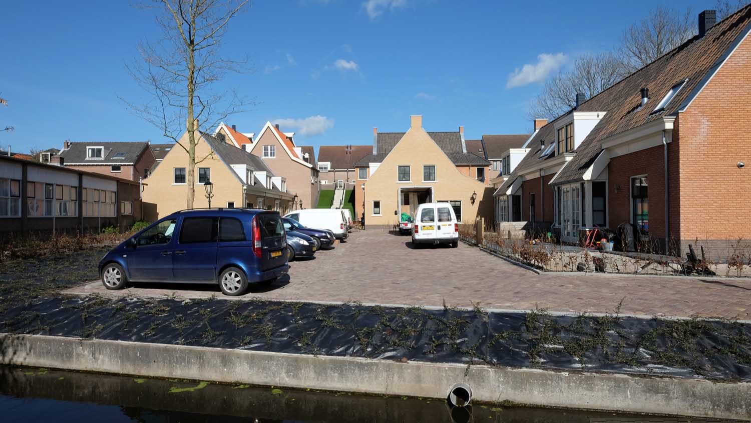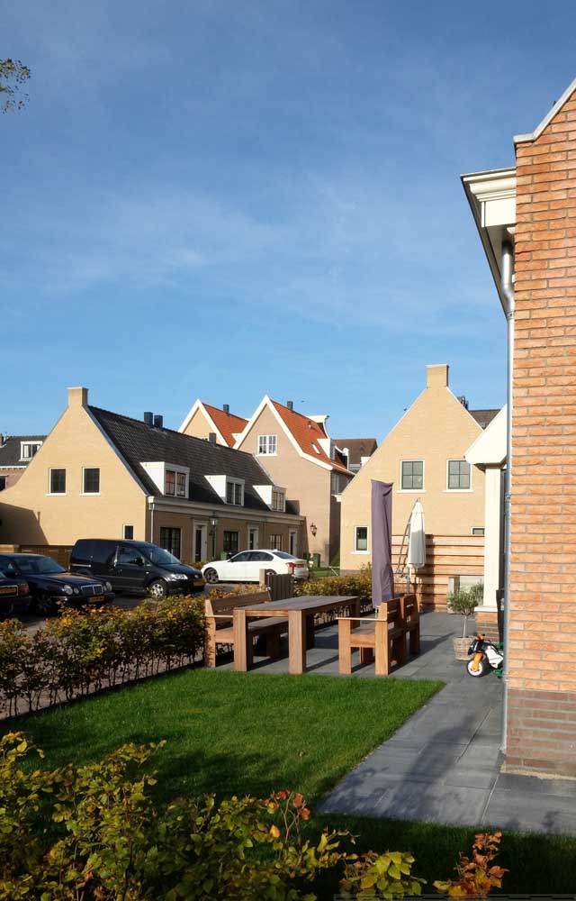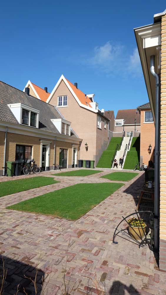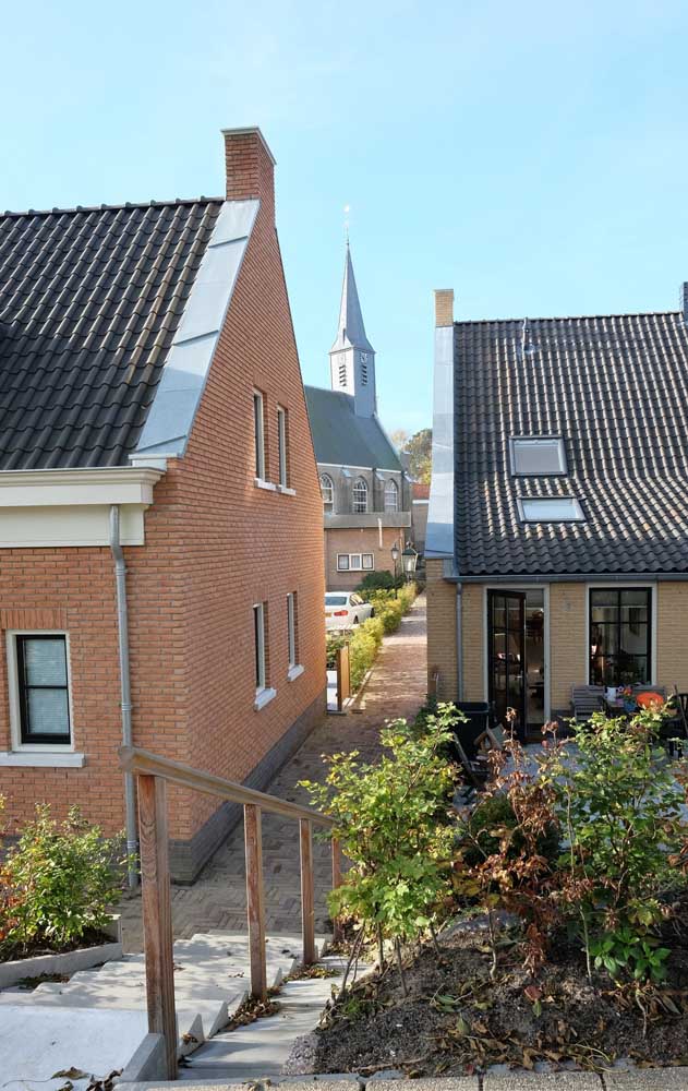 Hiertussenin een dijktrap eindigend in een kleine hof tussen 2x 3 woningen. Langs de Essendreef als afscherming van de parkeerkofer een tweetal langgerekte woningen. Een drietal woningen tegenover de kerk konden helaas niet tijdig worden gerealiseerd.