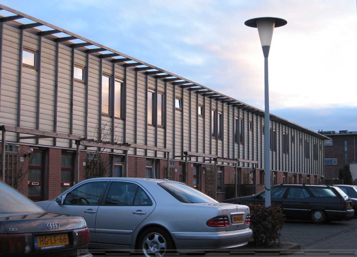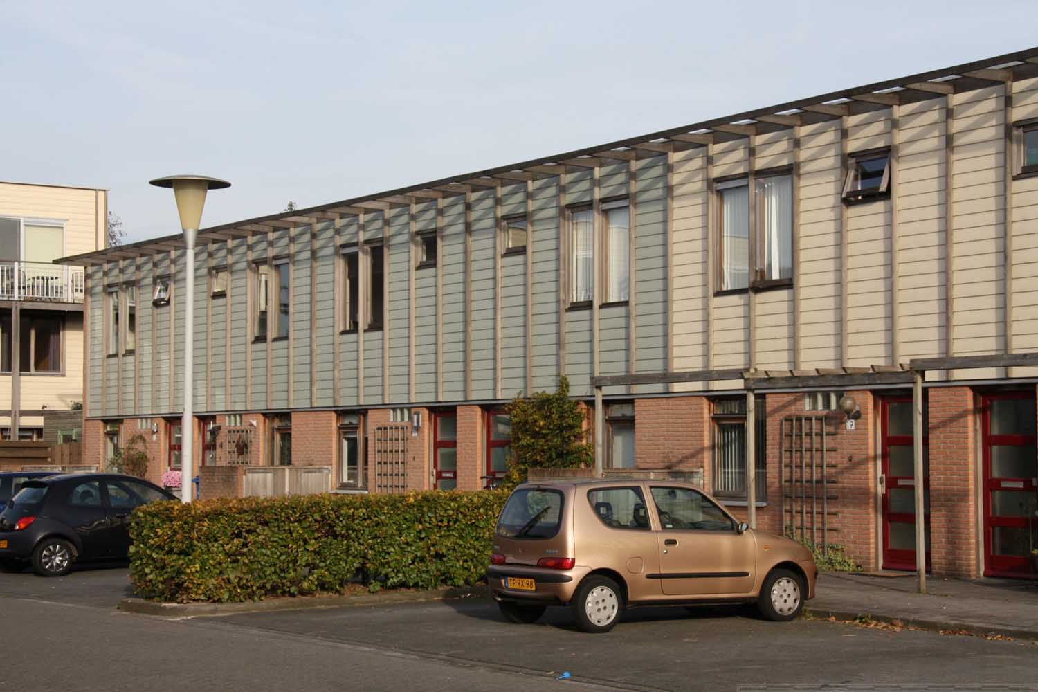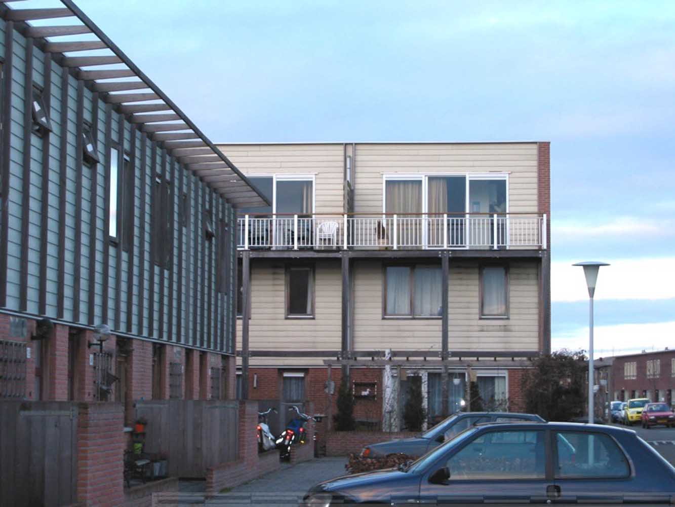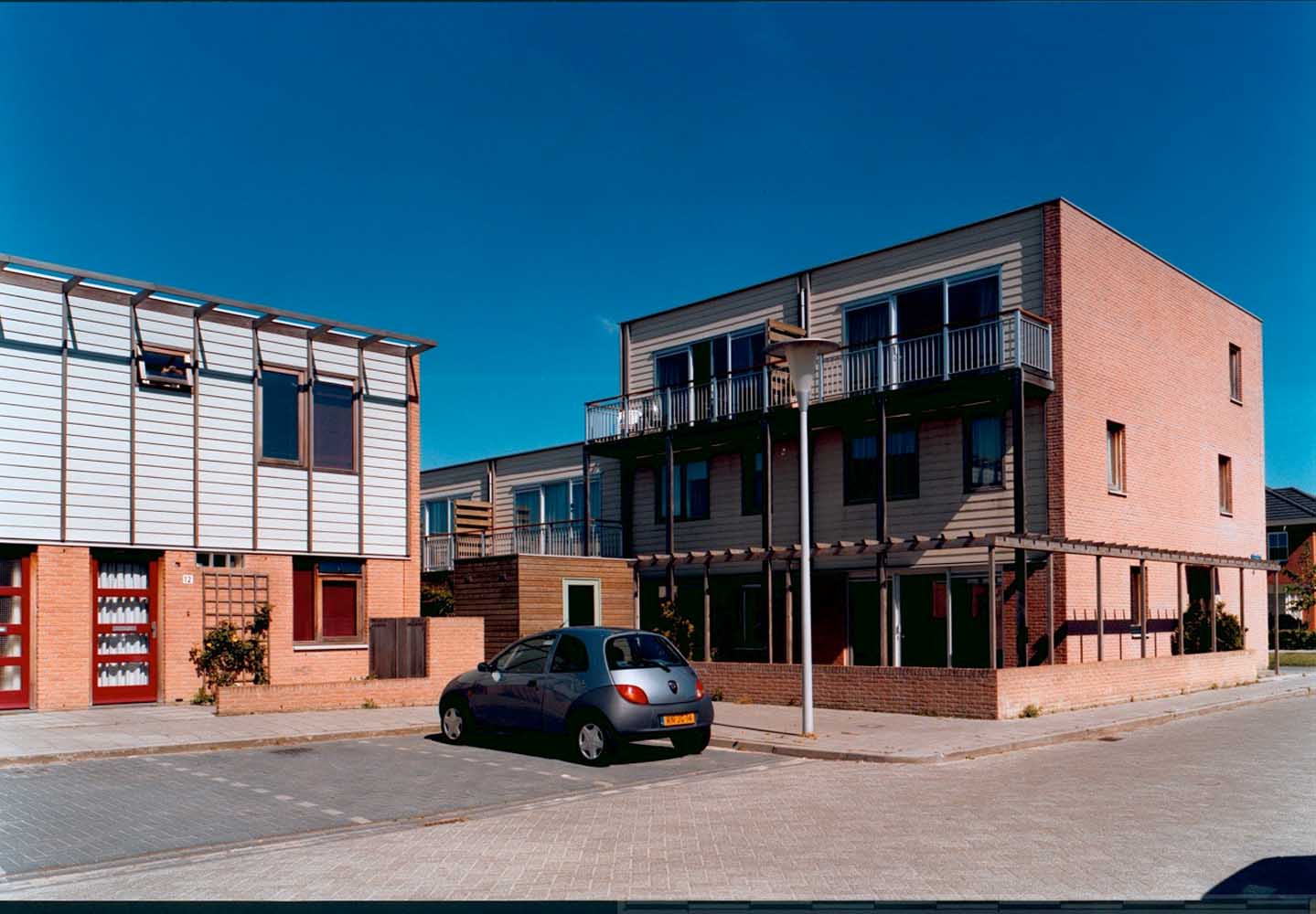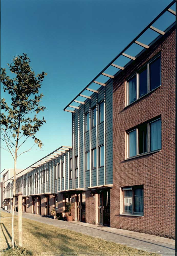 Dat realiseerden in een in hoge mate geprefabriceerd project. Prefab beton funderingen, een prefab beton casco en gevelsluitende elementen van een houtskelet met vezelcement gevelbekleding. Metselwerk is niet hoger toegepast dan bovenkant deur: dat bespaart latei-konstrukties en steigerwerk. Schilderwerk is weggelaten door een combinatie van Western Red Cedar en hardhout toe te passen. De prefab frames sluiten de architectuur aan de bovenzijde af. Tuinmuurtjes, een eigen stoep en containerbergingen maken de entree aan de straat af.