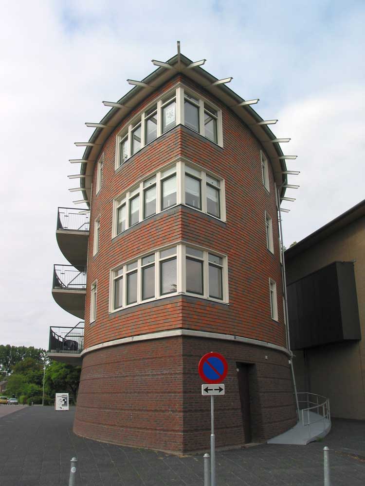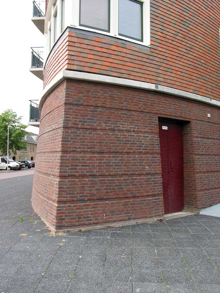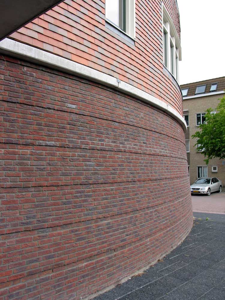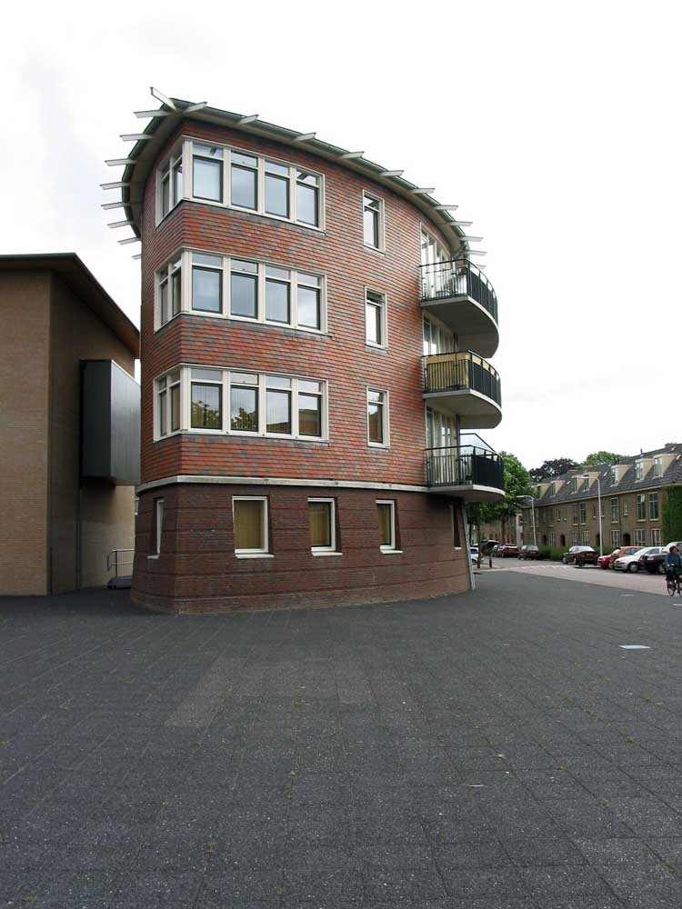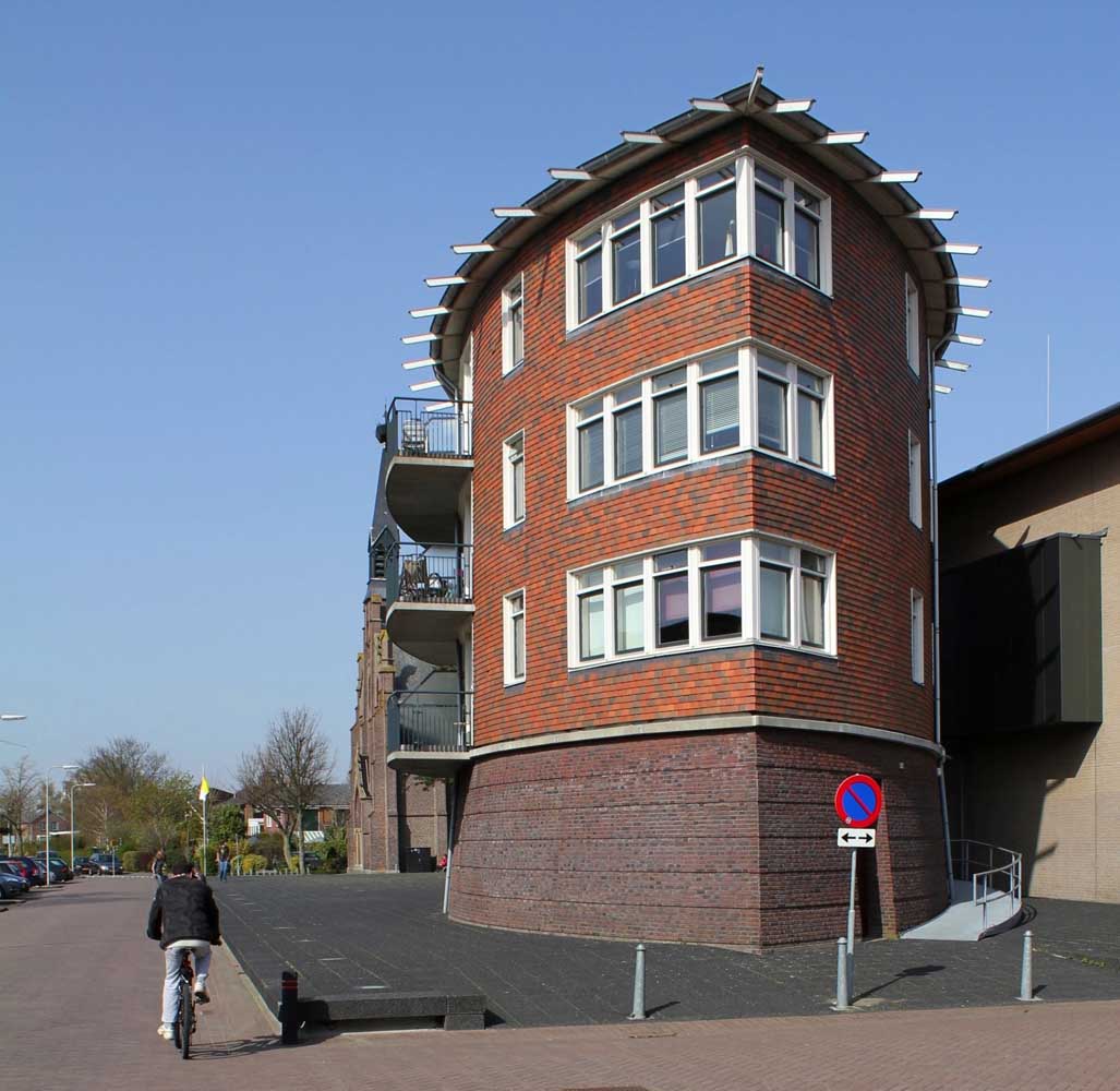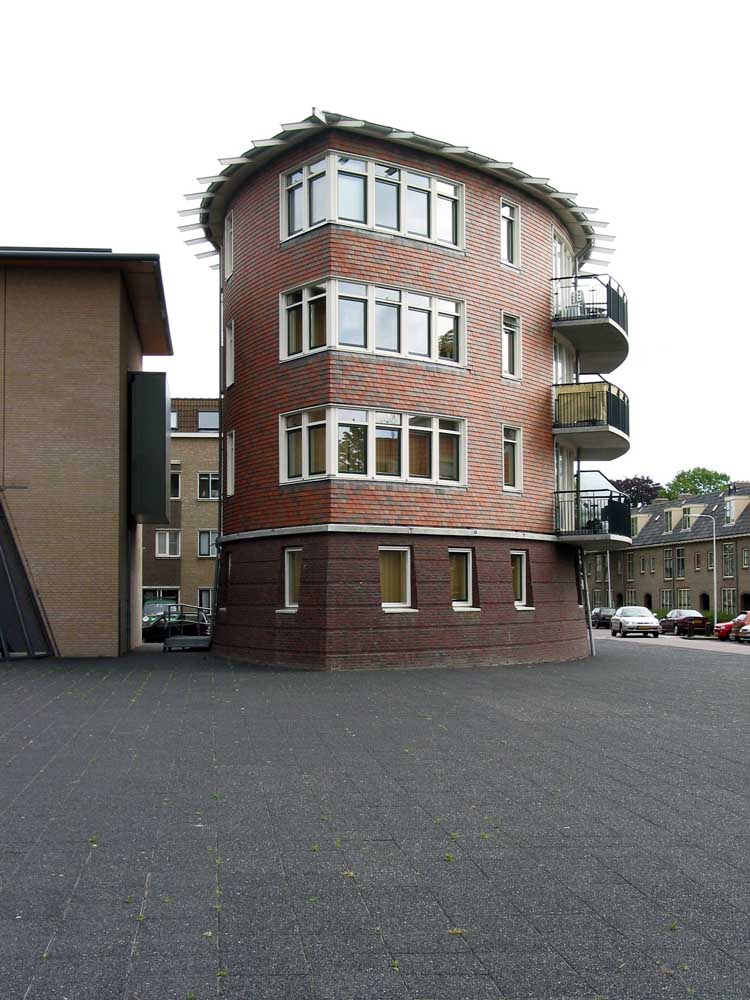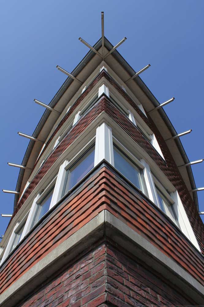 zes compacte etagewoningen en een hoogspanningsstation. De stoere begane grond is taps gemetseld, afgesloten met een prefab- betonrand; daarboven zijn de dragende wanden bekleed met keramische leien. De bekronende roeven kap in de vorm van twee kegelsneden is bekleed met zink. Het gebouw heeft de plattegrond van een schip en de bekleding als van een vis: voor de hand liggende referenties voor een plek vlakbij het monumentale droogdok Jan Blanken. Het plein wordt ingericht als met een lichtrand verhoogd zart vlak met koperslakbestrating: het ontwerp hiervoor is van de kunstenaars Jan Hein Daniëls en Willem Hoebink.