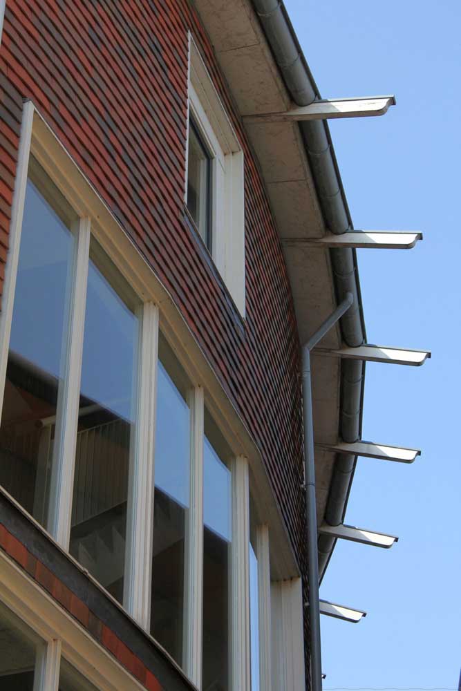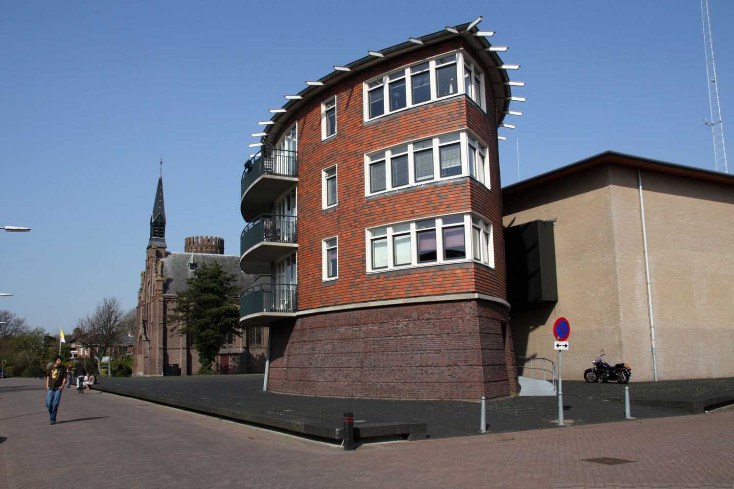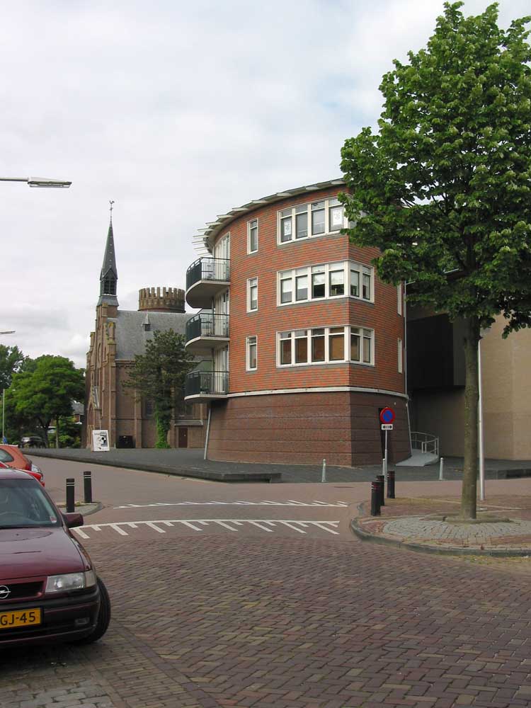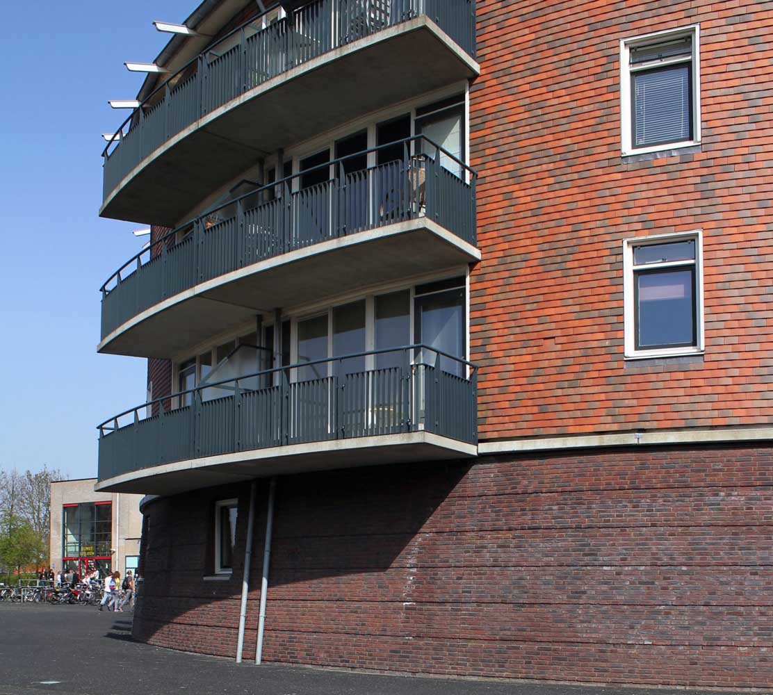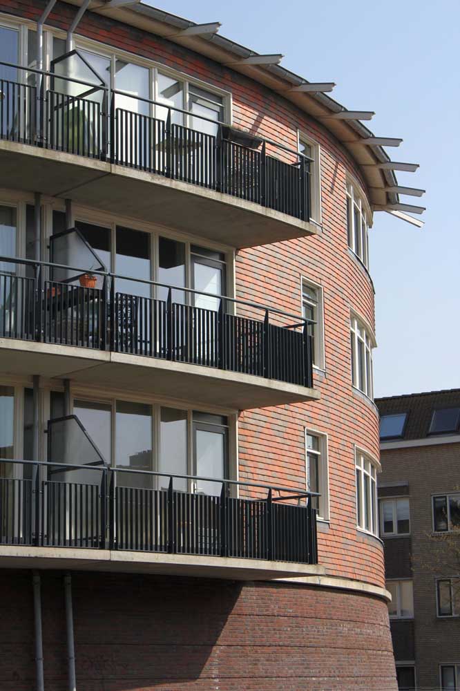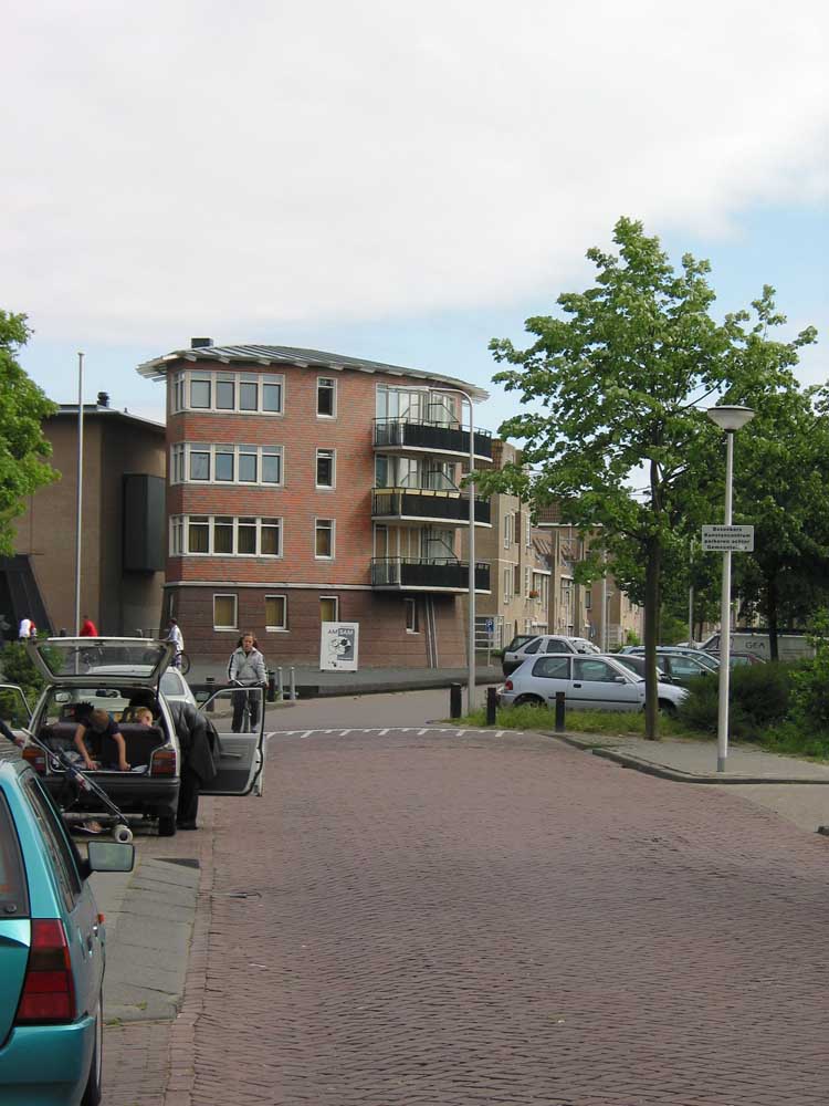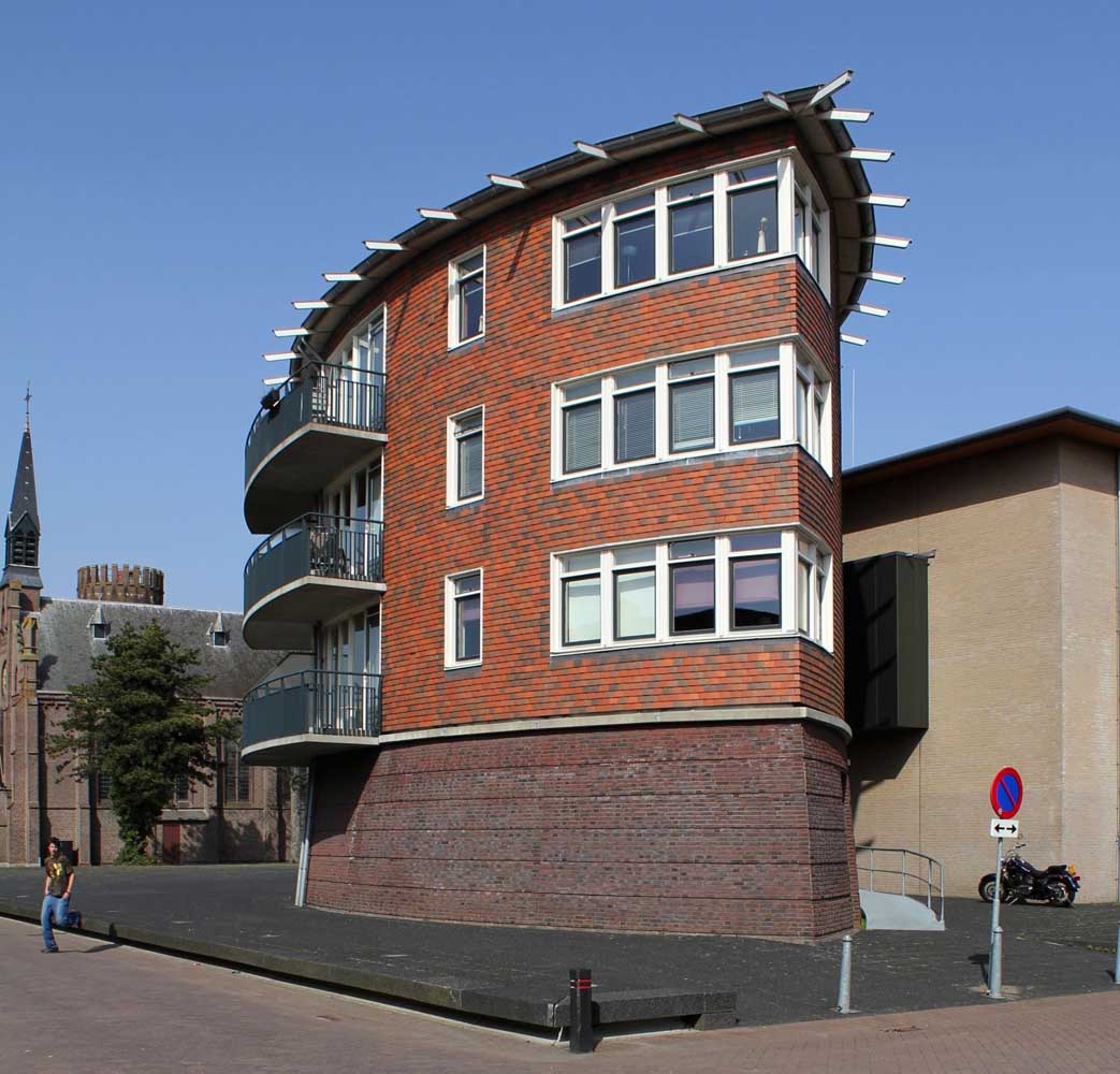 zes compacte etagewoningen en een hoogspanningsstation. De stoere begane grond is taps gemetseld, afgesloten met een prefab- betonrand; daarboven zijn de dragende wanden bekleed met keramische leien. De bekronende roeven kap in de vorm van twee kegelsneden is bekleed met zink. Het gebouw heeft de plattegrond van een schip en de bekleding als van een vis: voor de hand liggende referenties voor een plek vlakbij het monumentale droogdok Jan Blanken. Het plein wordt ingericht als met een lichtrand verhoogd zart vlak met koperslakbestrating: het ontwerp hiervoor is van de kunstenaars Jan Hein Daniëls en Willem Hoebink.