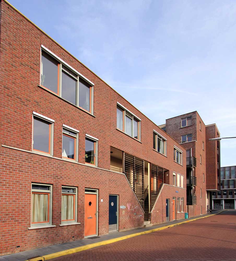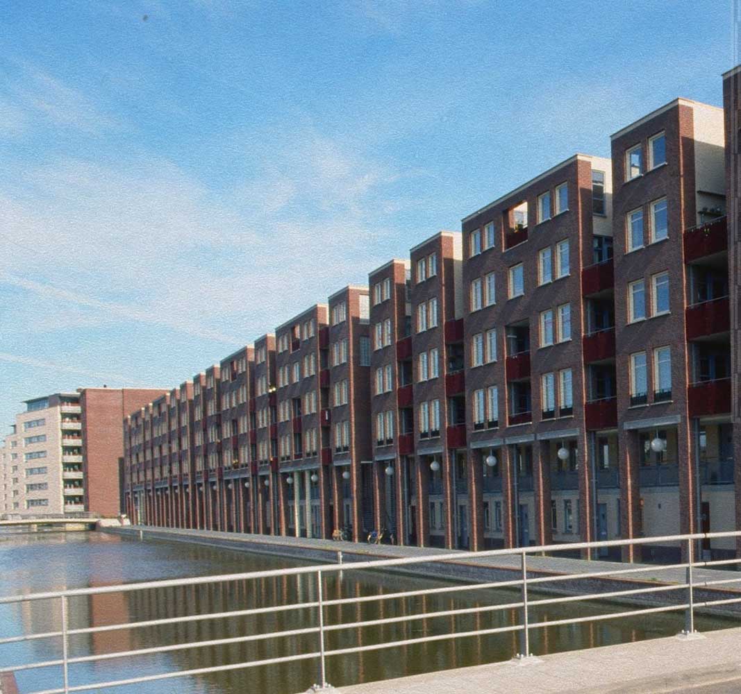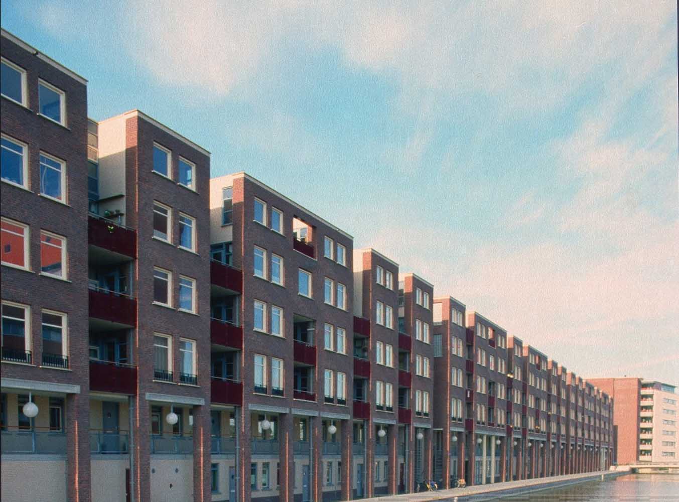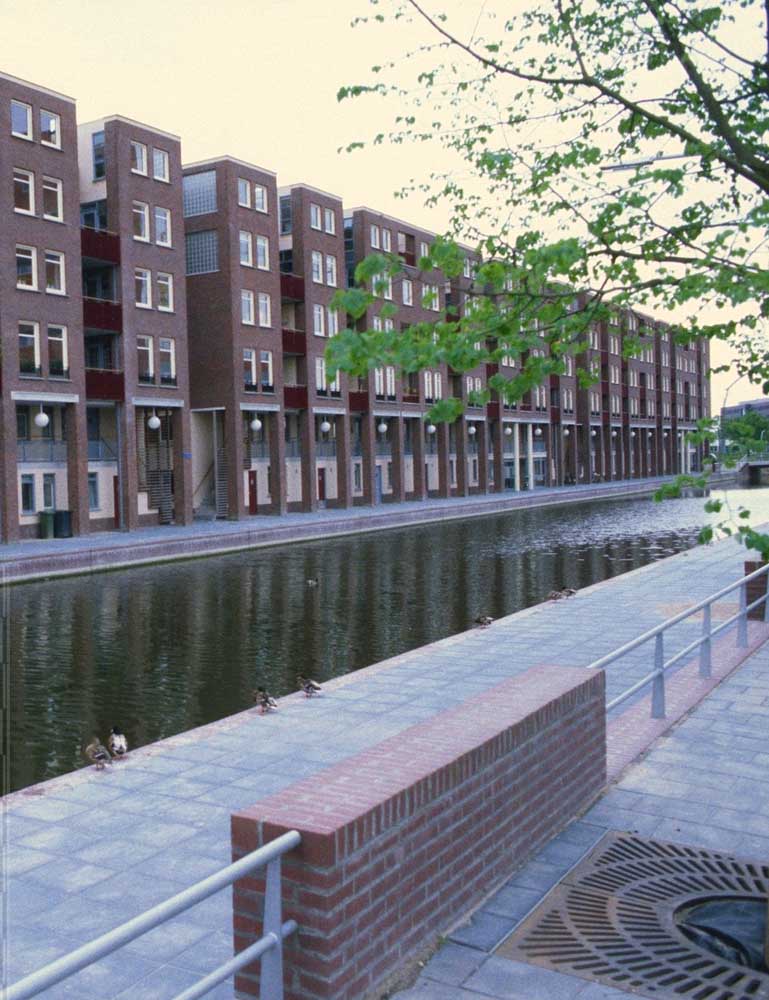 De bebouwing langs de lager gelegen kade rijst hoog op en is georiënteerd op de historische stad aan de noordzijde. De voet van de gebouwen is gearticuleerd door een arcade waar de woningentrees en de galerij van de woningen op begane grond en eerste verdieping liggen. De daarboven gelegen woningen hebben de ontsluitingen aan de andere zijde van het blok en zijn bovendien bereikbaar met de in de blokken opgenomen liften. Voor de gevel is een genuanceerde rood bruine steen gekozen die wordt afgewisseld met helder pleisterwerk voor loggia’s en arkade. Hiermee krijgt het gebouw een nadrukkelijke aanwezigheid –als van pakhuizen– die het gebied een stedelijke karakteristiek kan geven.De woningdifferentiatie –alle huurwoningen– loopt uiteen; de goedkopere woningen zijn direct ontsloten aan de kade, of aan de stegen. De woningen op de bovenste lagen zijn opgezet als gestapelde penthouses aan brede galerijen.