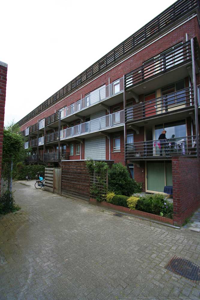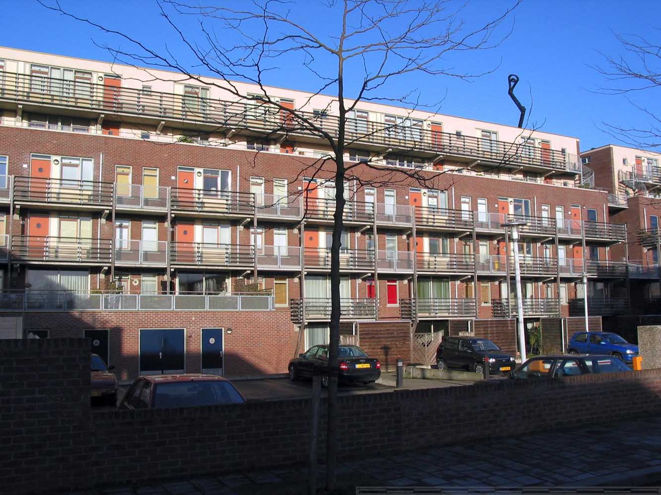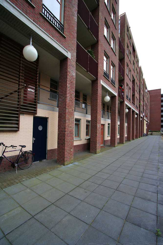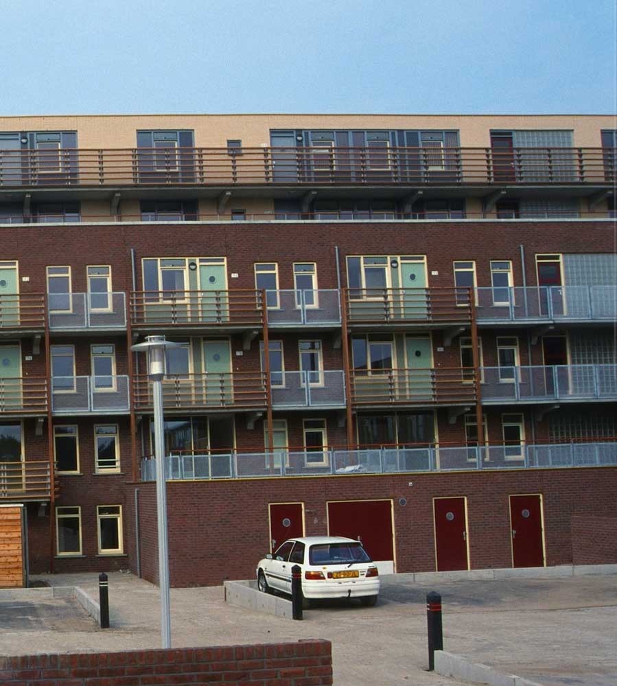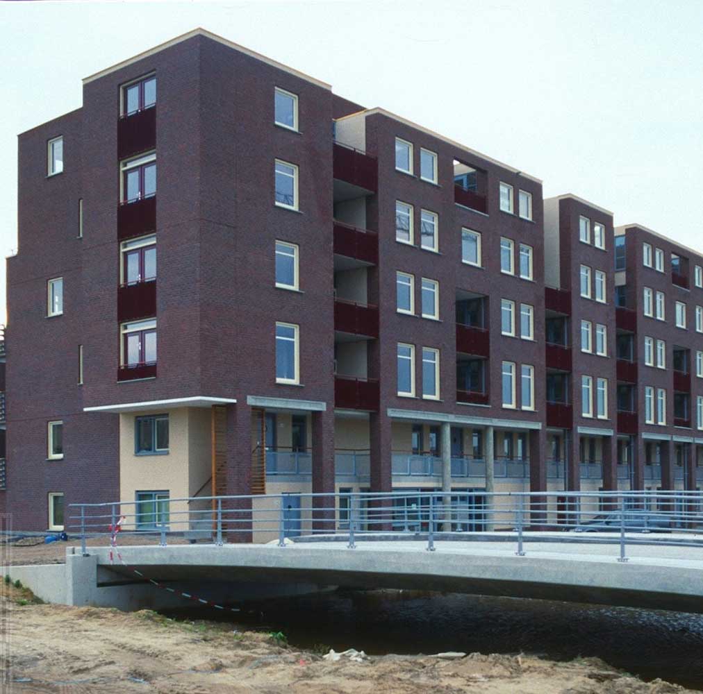 De bebouwing langs de lager gelegen kade rijst hoog op en is georiënteerd op de historische stad aan de noordzijde. De voet van de gebouwen is gearticuleerd door een arcade waar de woningentrees en de galerij van de woningen op begane grond en eerste verdieping liggen. De daarboven gelegen woningen hebben de ontsluitingen aan de andere zijde van het blok en zijn bovendien bereikbaar met de in de blokken opgenomen liften. Voor de gevel is een genuanceerde rood bruine steen gekozen die wordt afgewisseld met helder pleisterwerk voor loggia’s en arkade. Hiermee krijgt het gebouw een nadrukkelijke aanwezigheid –als van pakhuizen– die het gebied een stedelijke karakteristiek kan geven.De woningdifferentiatie –alle huurwoningen– loopt uiteen; de goedkopere woningen zijn direct ontsloten aan de kade, of aan de stegen. De woningen op de bovenste lagen zijn opgezet als gestapelde penthouses aan brede galerijen.
