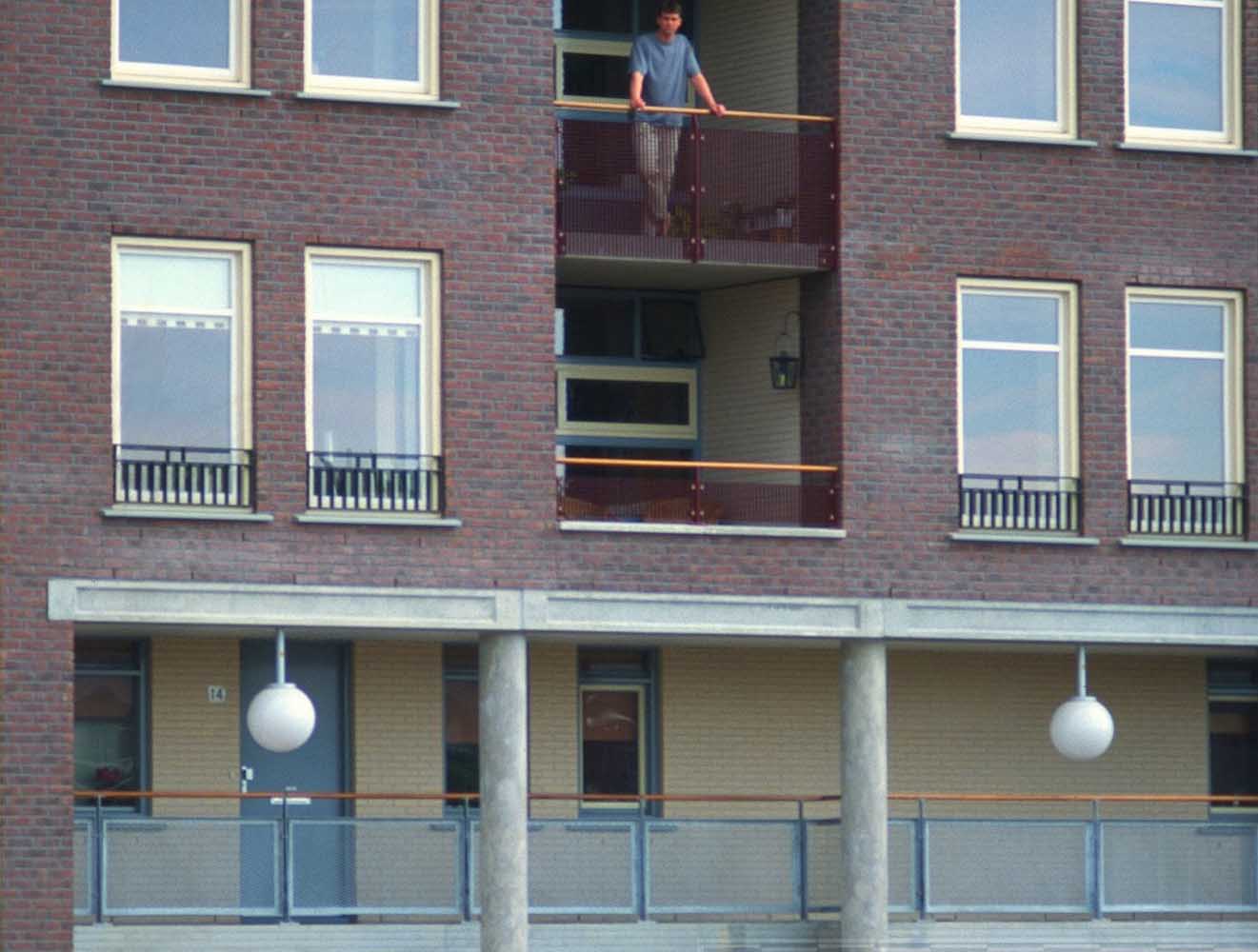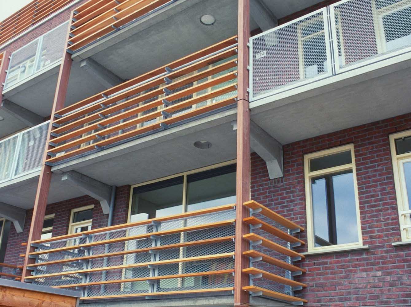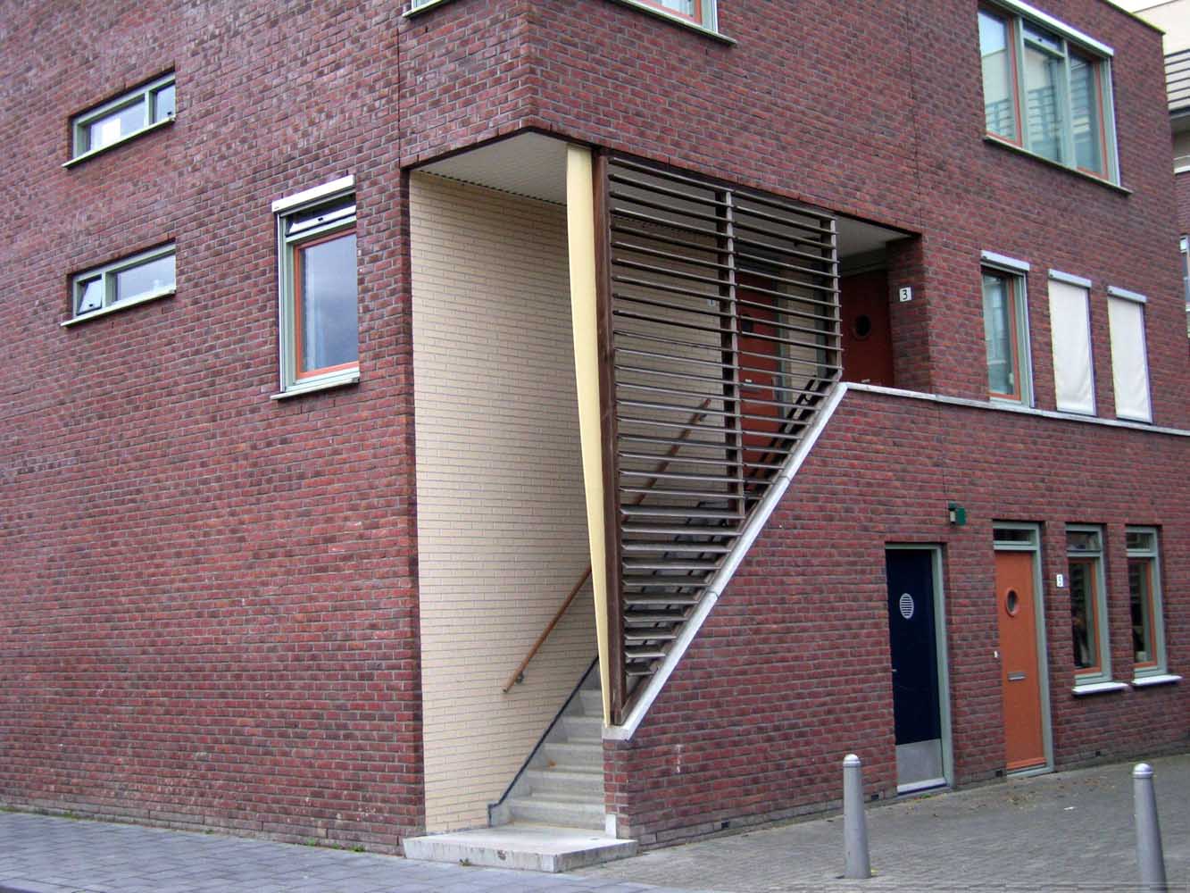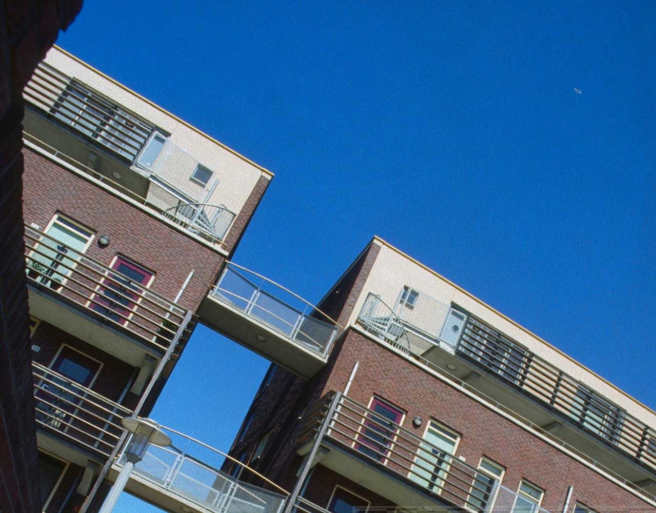De bebouwing langs de lager gelegen kade rijst hoog op en is georiënteerd op de historische stad aan de noordzijde. De voet van de gebouwen is gearticuleerd door een arcade waar de woningentrees en de galerij van de woningen op begane grond en eerste verdieping liggen. De daarboven gelegen woningen hebben de ontsluitingen aan de andere zijde van het blok en zijn bovendien bereikbaar met de in de blokken opgenomen liften. Voor de gevel is een genuanceerde rood bruine steen gekozen die wordt afgewisseld met helder pleisterwerk voor loggia’s en arkade. Hiermee krijgt het gebouw een nadrukkelijke aanwezigheid –als van pakhuizen– die het gebied een stedelijke karakteristiek kan geven.De woningdifferentiatie –alle huurwoningen– loopt uiteen; de goedkopere woningen zijn direct ontsloten aan de kade, of aan de stegen. De woningen op de bovenste lagen zijn opgezet als gestapelde penthouses aan brede galerijen.