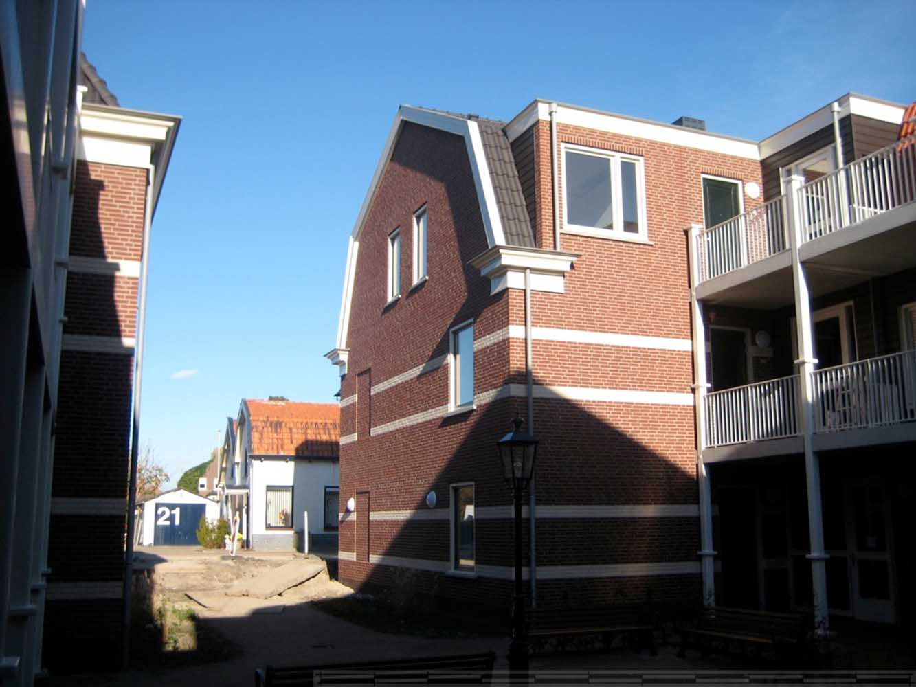 Door het appartementencomplex als U-vorm aan de dijk te leggen om een binnenplaats is een schaalverkleining ontstaan van het blok.