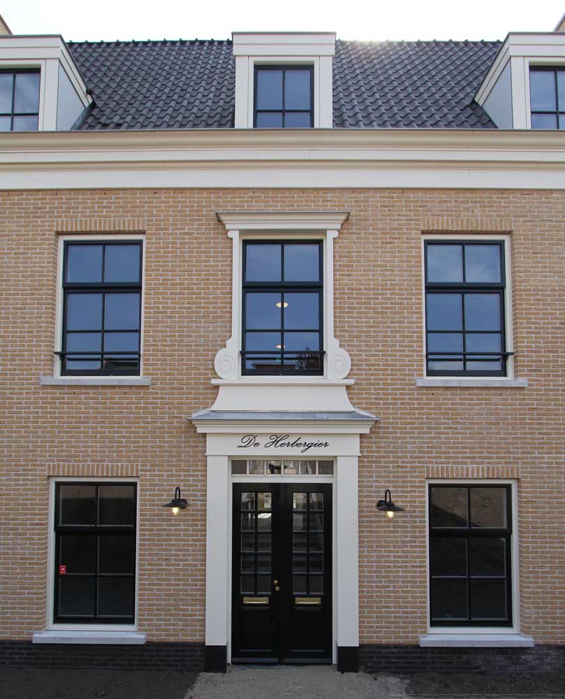 De nieuwbouw voor de Herbergier bestaat uit een huis-met-middengang en een achterhuis rond een kleine boomgaard en een terras. Door de tuinen en entrees door te koppelen is er een typisch dorpse schakeling van erven ontstaan in een fijne schaal.