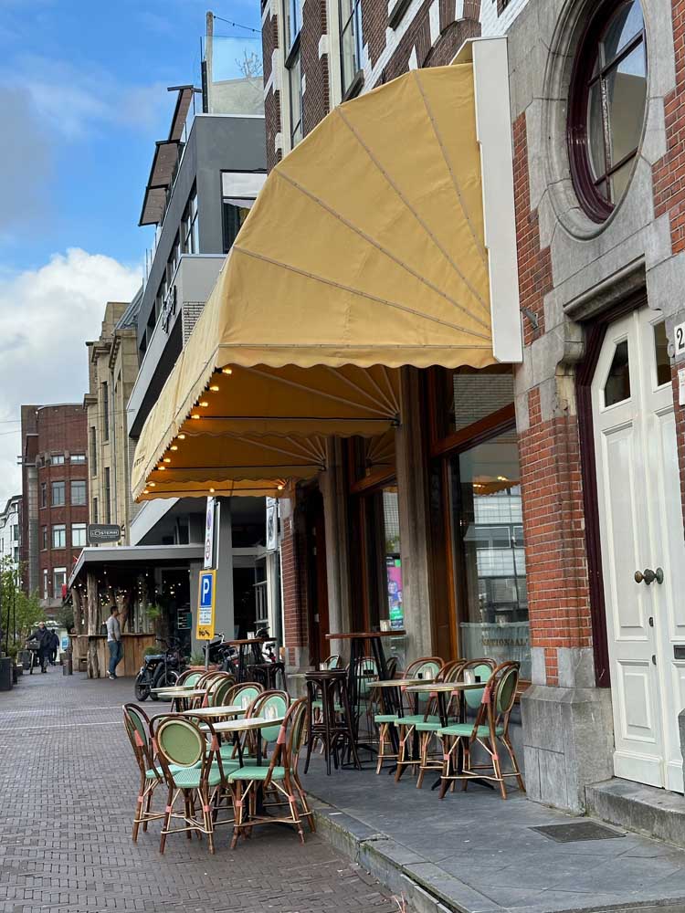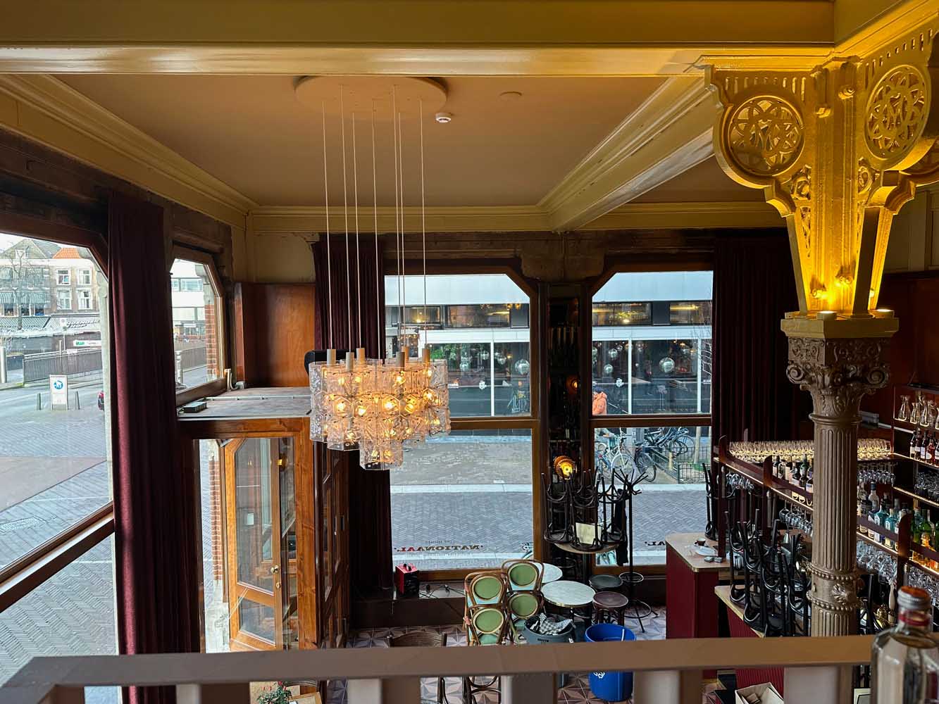 De hardstenen stoep, de vloer van de bel-etage werd deels gesloopt en er kwam een extra hoge caféruimte op de begane grond. De gevelpenanten werden vervangen door slanke hardstenen kolommen met enorme dubbelschuivende vensters. Middenin de ruimte werd het bovenhuis opgevangen door een fraaie gietijzeren kolom van de Haagse firma Enthoven.
