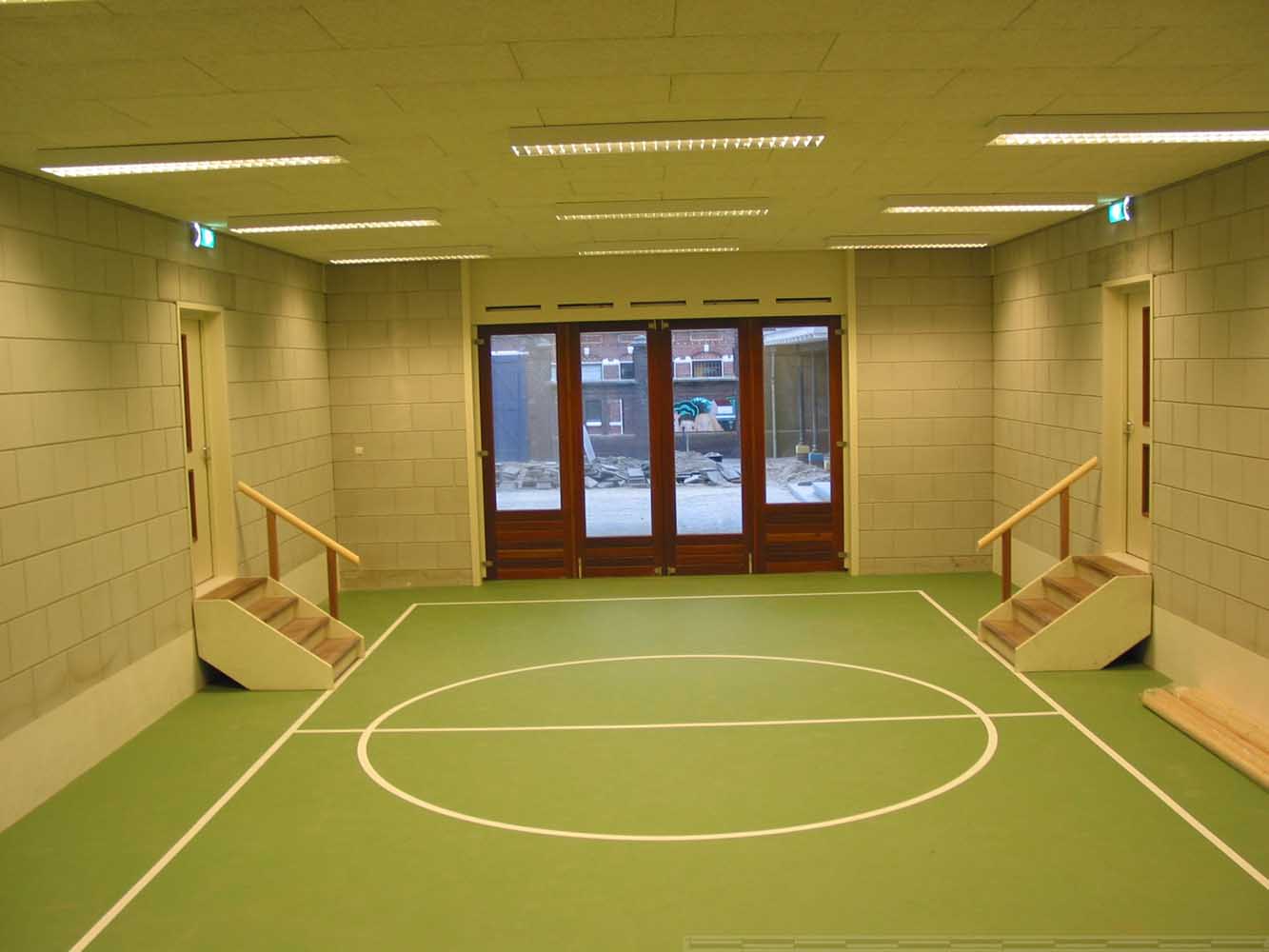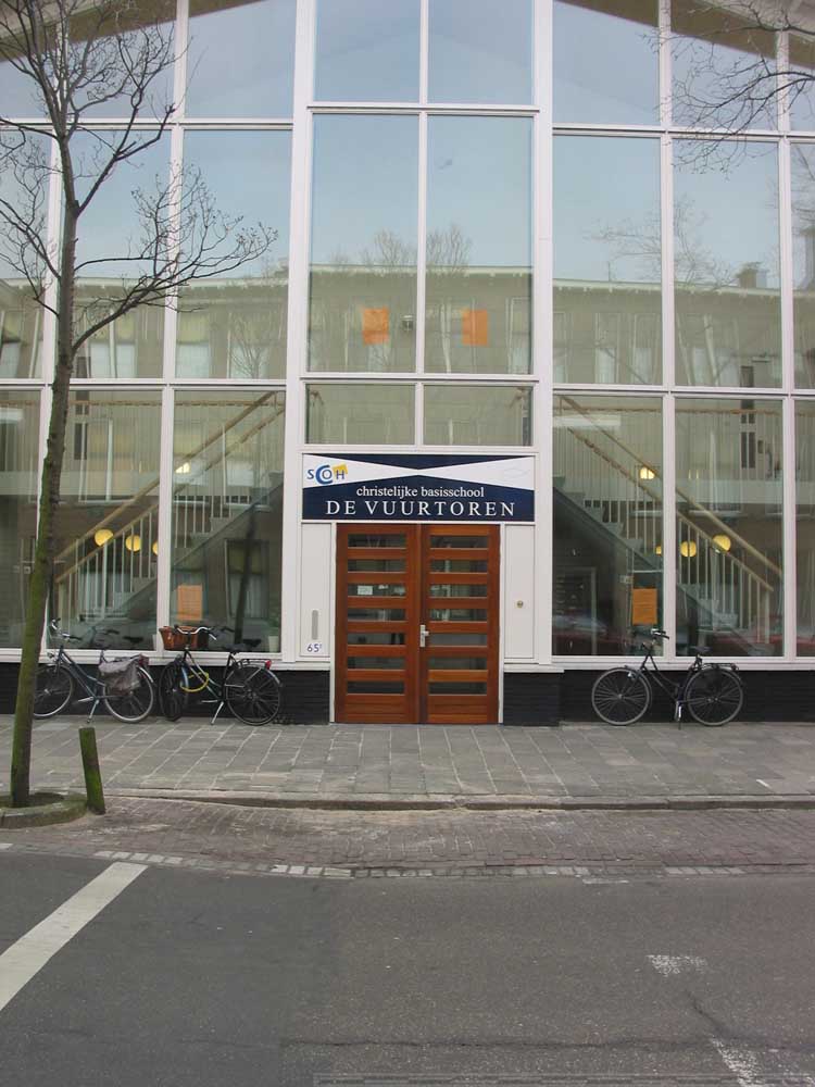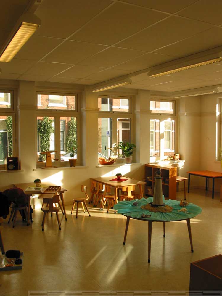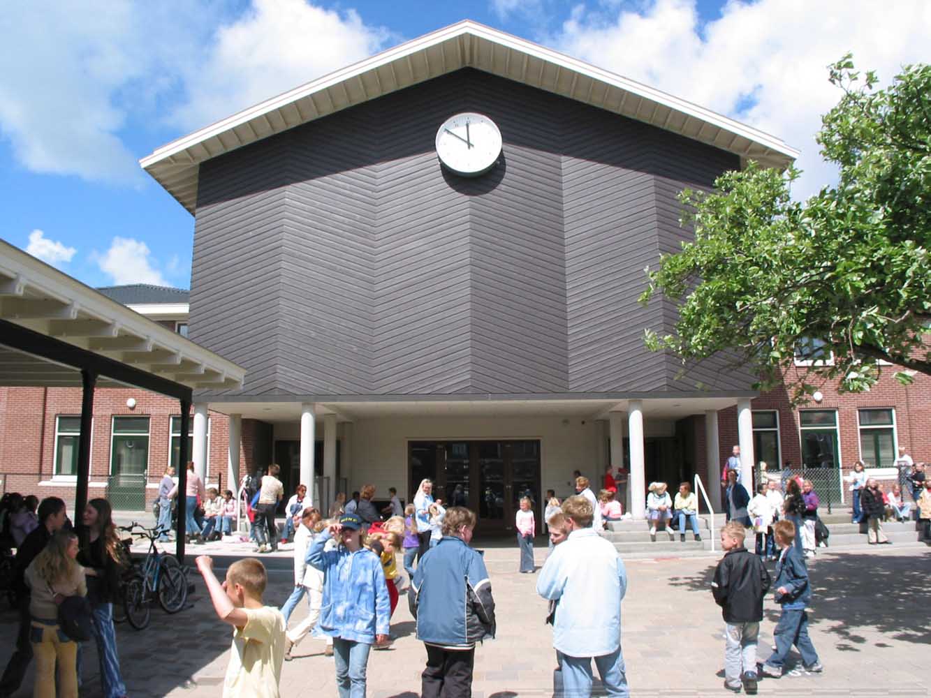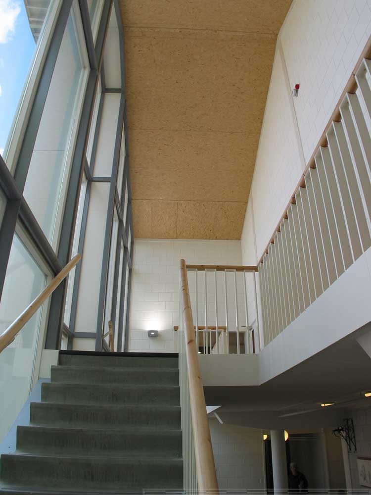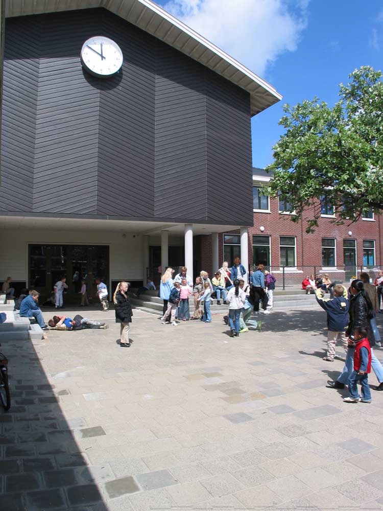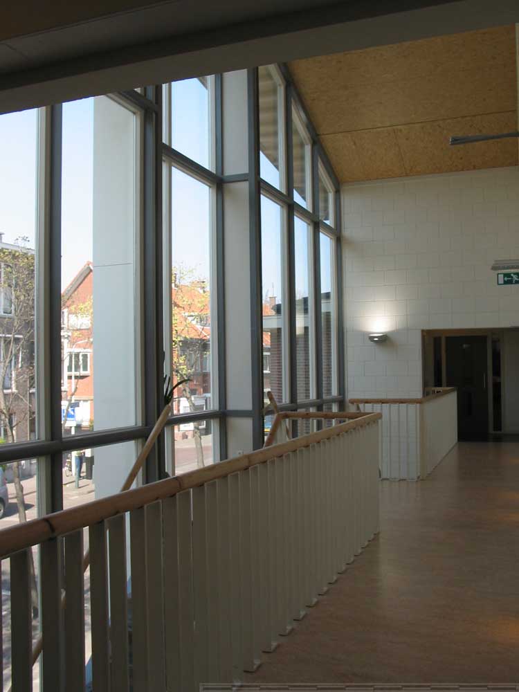 verdieping. Een grote beglaasde traphal vormt het gezicht naar de straat; het hoogteverschil in de locatie bij de duinen is opgenomen in plein en speellokaal.