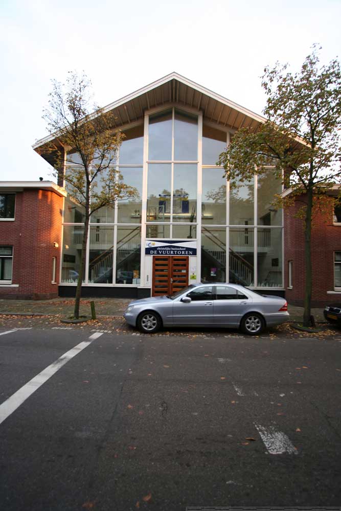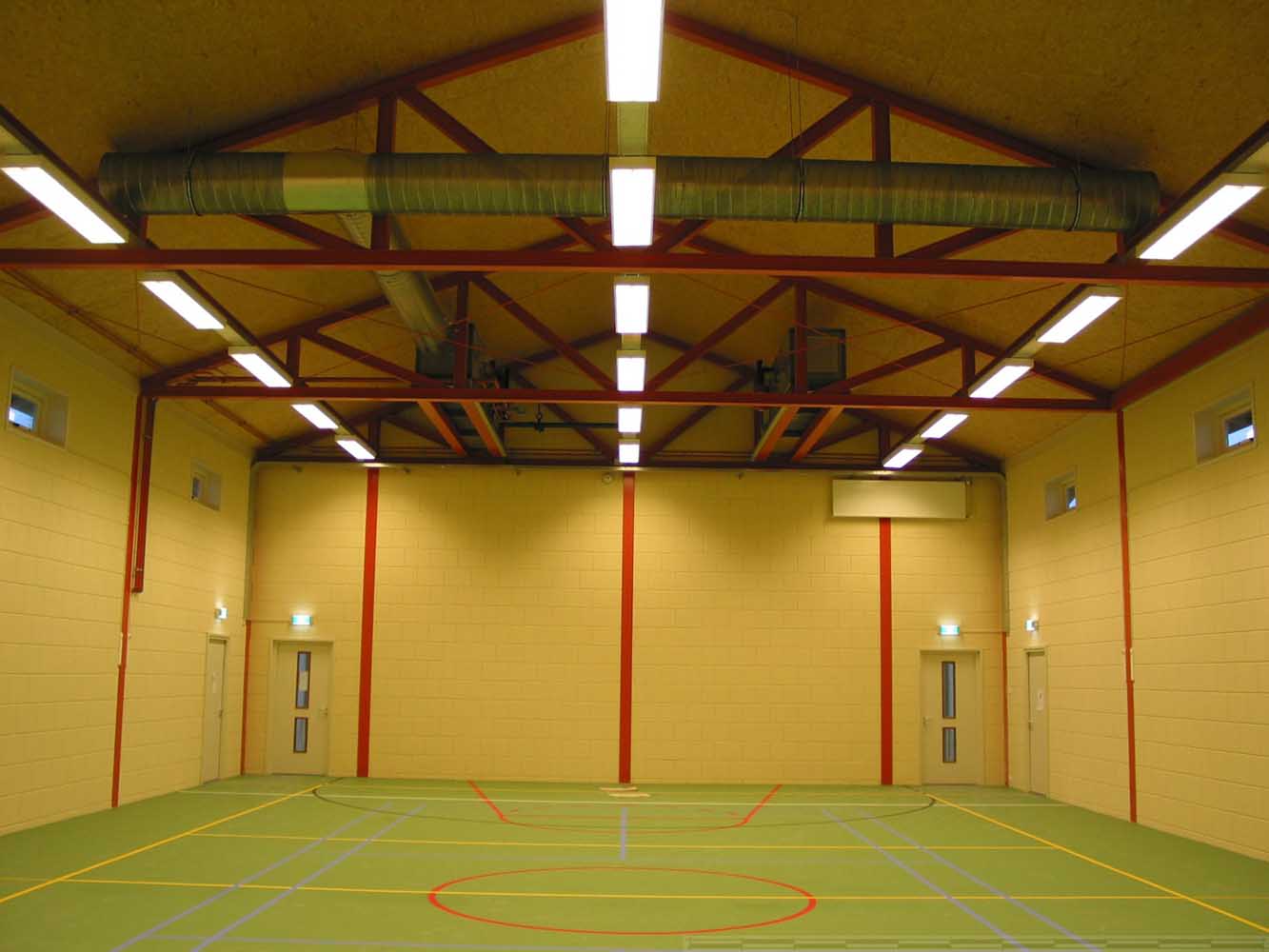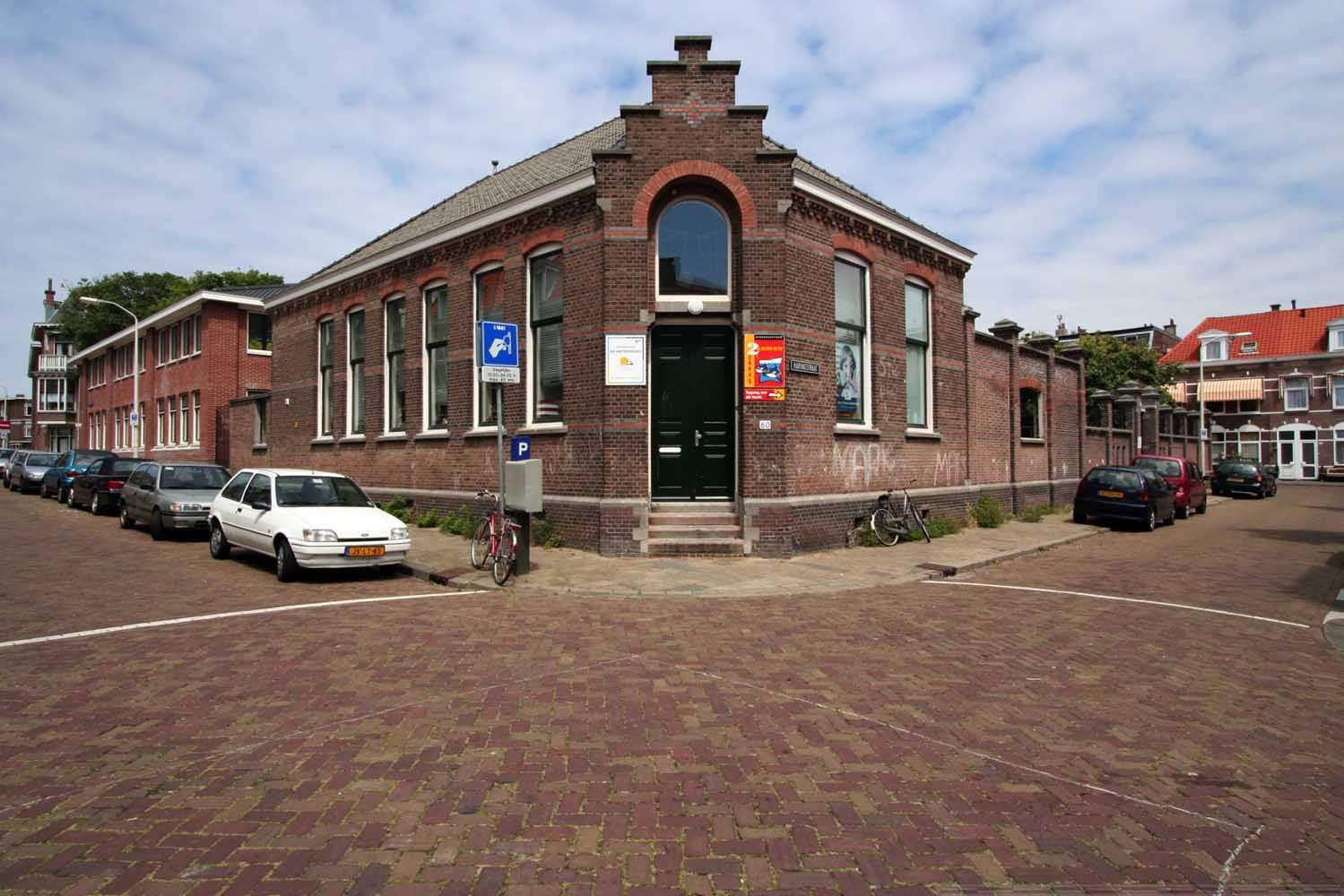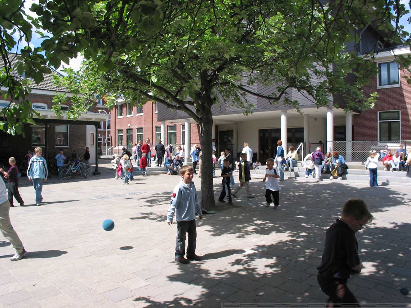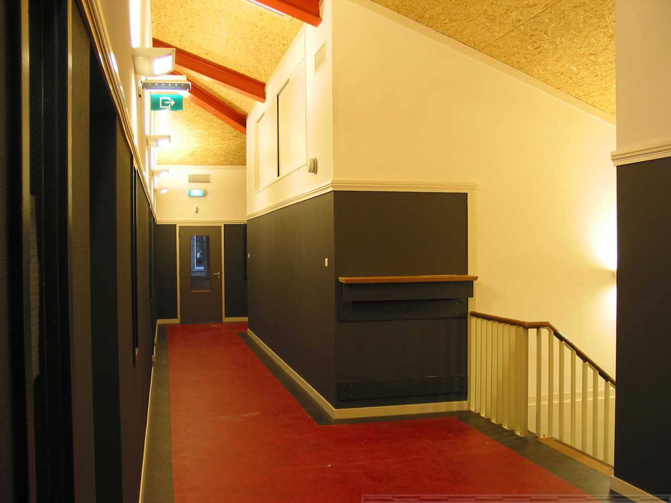 verdieping. Een grote beglaasde traphal vormt het gezicht naar de straat; het hoogteverschil in de locatie bij de duinen is opgenomen in plein en speellokaal.