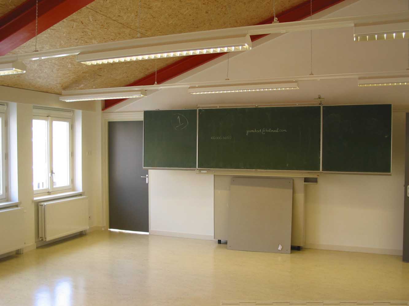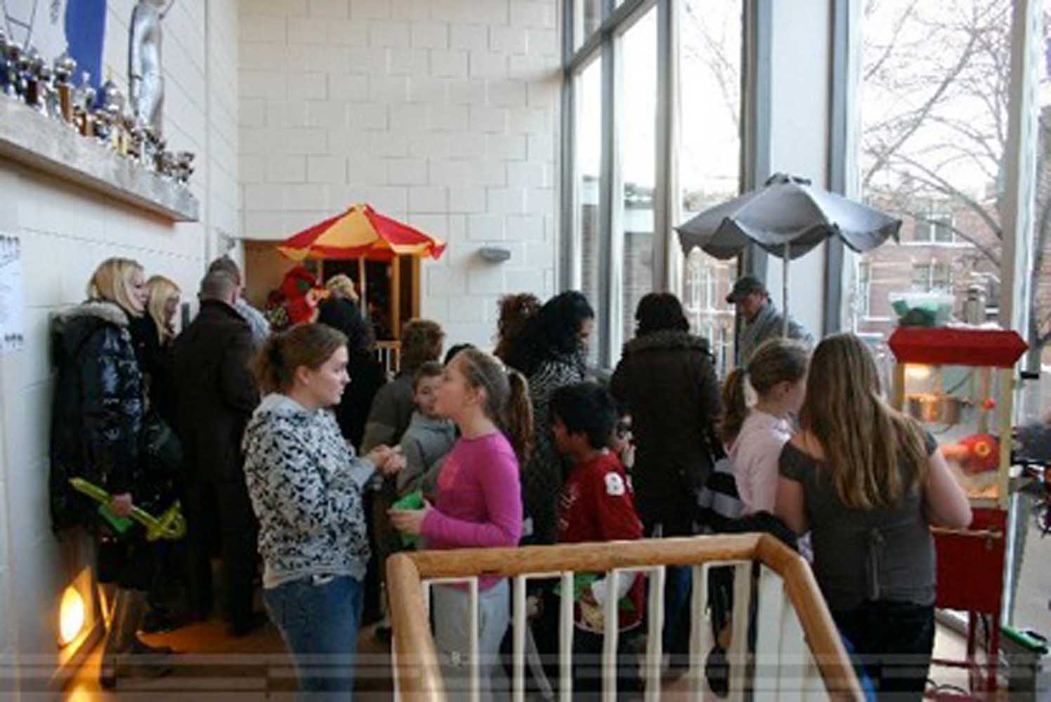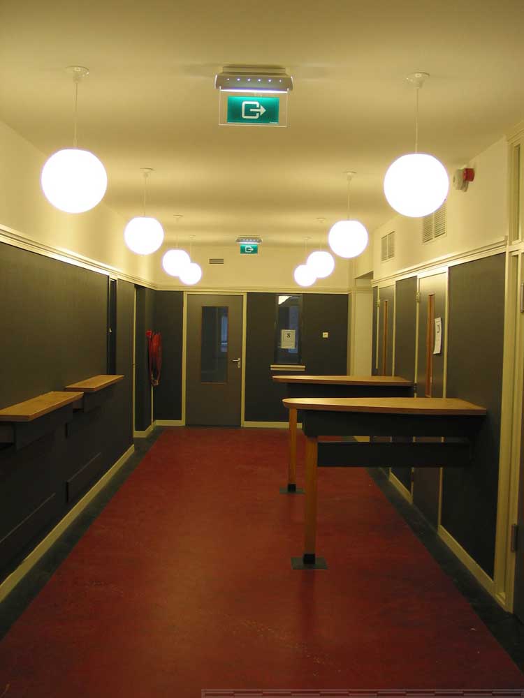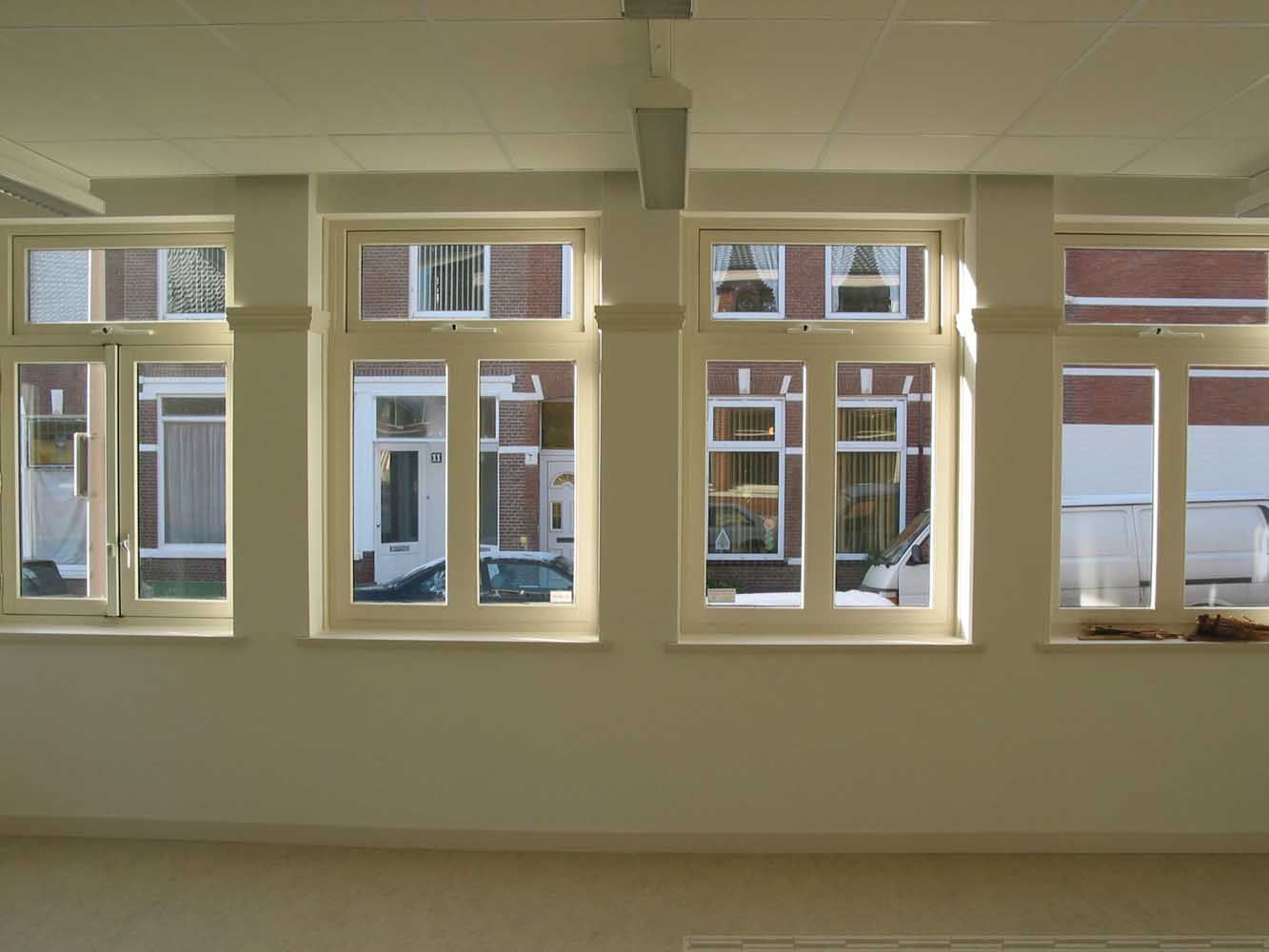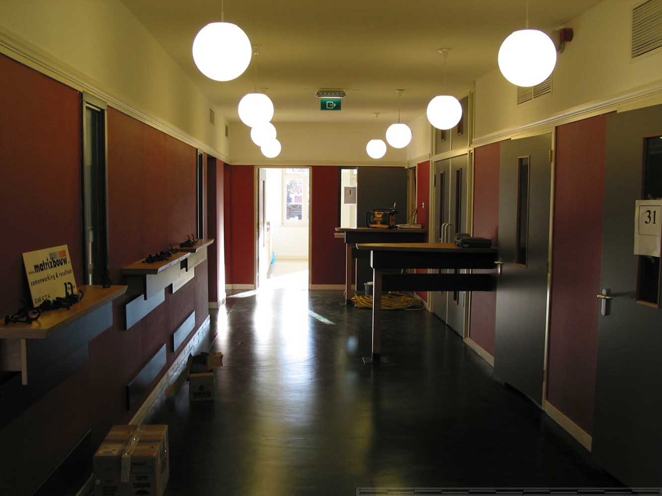 verdieping. Een grote beglaasde traphal vormt het gezicht naar de straat; het hoogteverschil in de locatie bij de duinen is opgenomen in plein en speellokaal.
