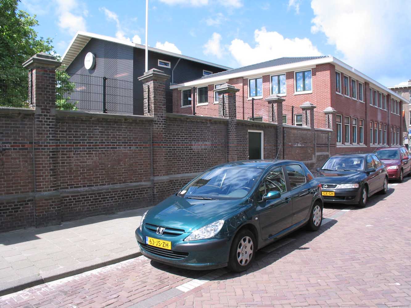 De school bezet een volledig bouwblok aan de Stevinstraat. De school heeft een symmetrische hoofdopzet: twee vleugels met lokalen liggen ter weerszijden van een groter bouwdeel. Hierin ligt het speellokaal en de sportzaal op de eerste