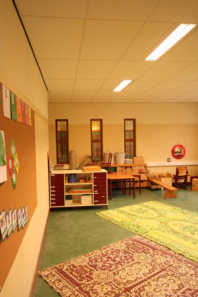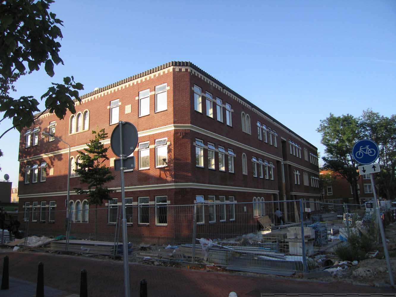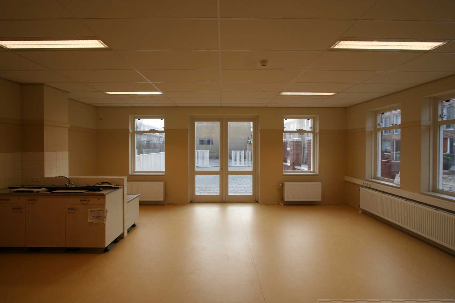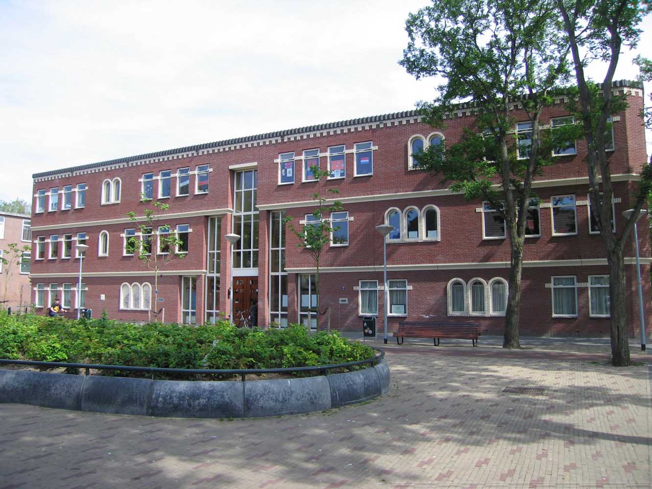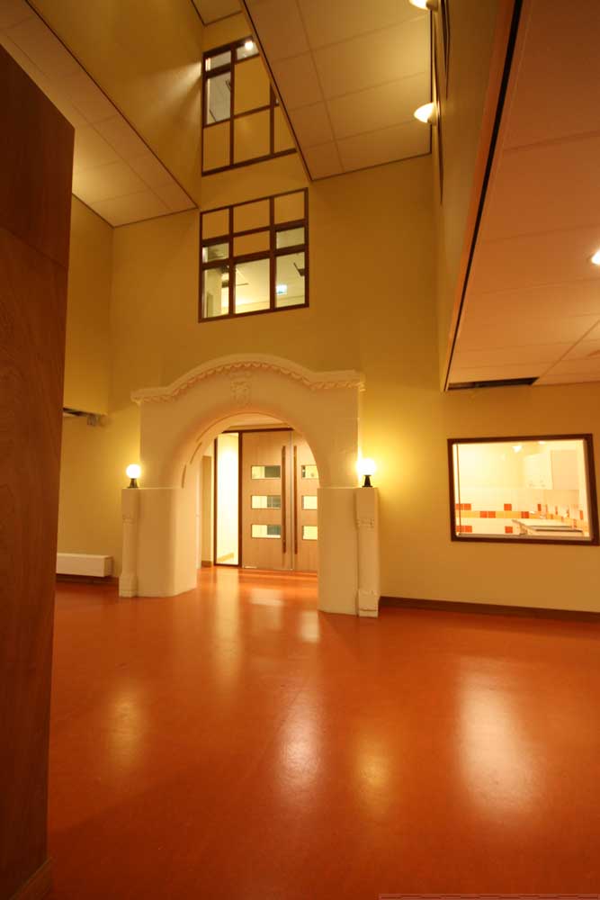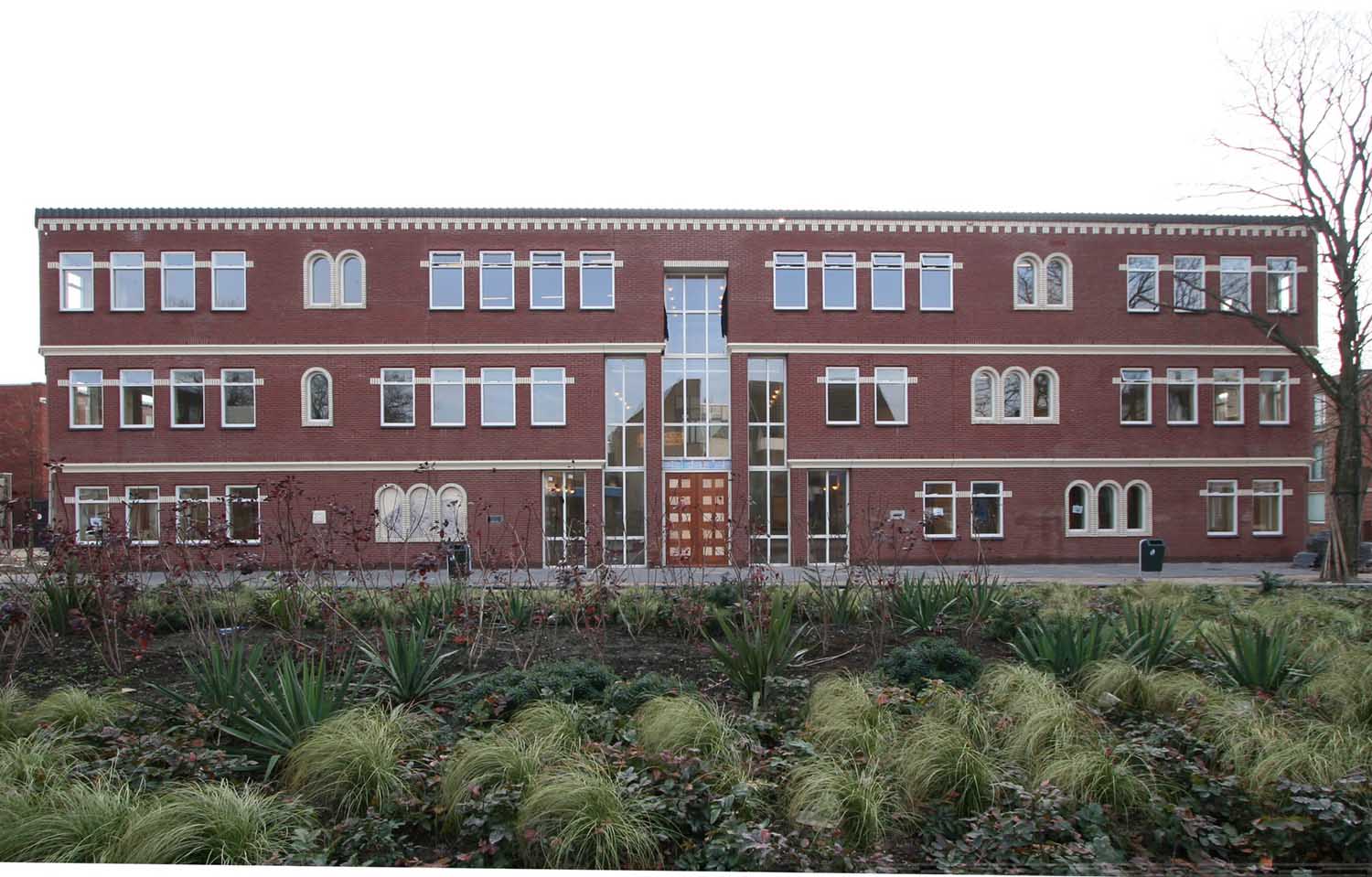 In de school zijn enkele onderdelen van het oude school hergebruikt zoals het natuurstenen entree-portaal, glas-in-lood vensters. José den hartog maakte schitterende tegeltableaus over de volle hoogte van het gebouw met plantmotieven.