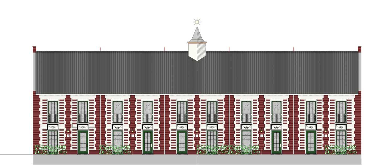 De Koetshuizen langs de oprijlaan. 16 huurwoningen, 13 koopwoningen