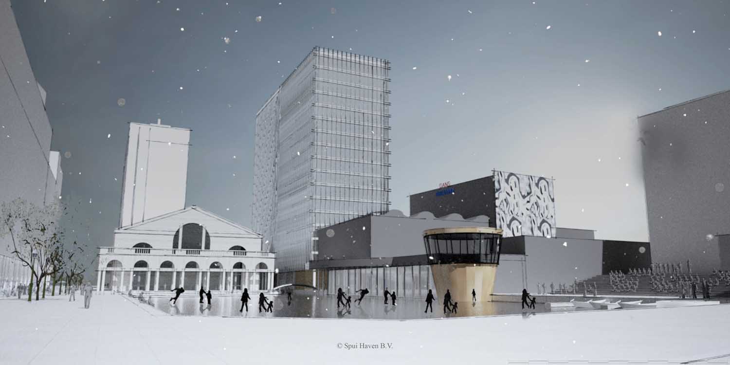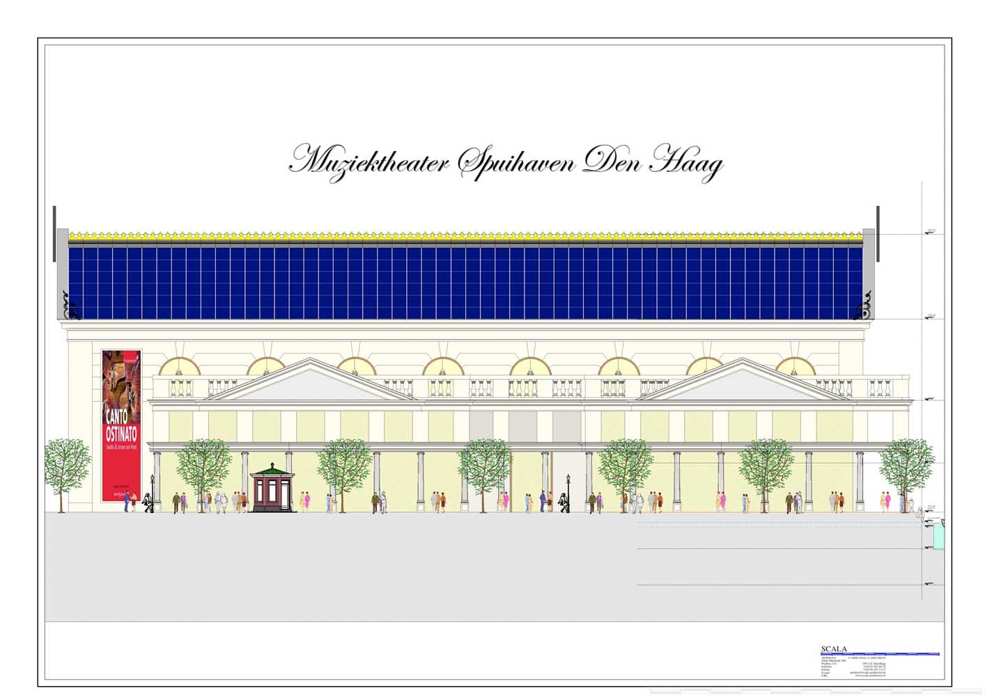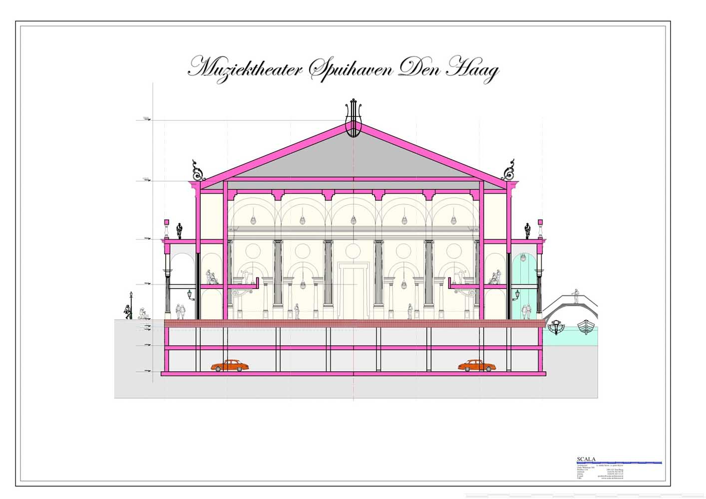 Géén multiplextheater waarbij iedereen door elkaar loopt. In Plan Spui Haven is daar invulling aan gegeven door de Muziekzaal als ware het een Venetiaans palazzo op een schier eiland te situeren: aan drie zijden wordt de Muziekzaal omgeven door water en met een langszijde ligt het aan de Turfmarkt. De symmetrie-as van Muziekzaal en Nieuwe Kerk liggen in elkaars verlengde en door de sprekende voorgevels ontstaat een sterke twee-eenheid tussen deze twee openbare gebouwen met daartussen de Spui Haven. Die waterspiegeling vormt voor de op zich bescheiden bouwmassa’s van kerk en Muziekzaal een extra symbolische kwaliteit: de bouwhoogte wordt verdubbeld. De middag- en avond zon zal de marmeren zuilen galerij plus watertrappen fraai aanlichten: als een witte parel ligt de Muziekzaal tegenover de Nieuwe Kerk. Niet abstract als het stadshuis, maar sterk verwant met de rest van de historische binnenstad in het hart van het Spuikwartier. De colonnade aan Spuihaven biedt beschutting, de hoge deuren en de waterspiegeling laten het licht ver doordringen in foyer, restaurant en zaal zelf. Het restaurant is openbaar gelegen en van zodanige kwaliteit dat exploitatie ook buiten muziekvoorstellingen gewoon door kan gaan. Dat draagt bij aan de levendigheid in het gebied maar evenzeer aan de exploitatie: ook hier weer vormt de ligging aan het water een sterke meerwaarde voor sfeer en bezoek. Het dak wordt volledig belegd met photo-voltaische panelen die licht omzetten in stroom voor het complex.