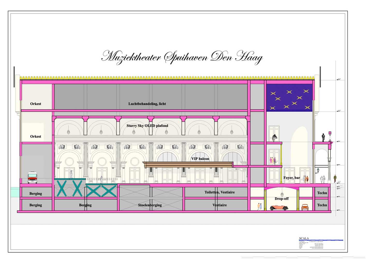 In de balzaal opstelling zal het avond licht weerspiegelen in het water en door de hoge zaal deuren rondom naar de foyers diep kunnen doordringen in de muziekzaal. Zowel de arcades aan de zijde van de Spui Haven en de Turfmarkt als de gangen en buiten gaanderij op de veridpeing bieden uitstekende plekken voor gesprek en ontmoeting. Niet voor niets is de planopzet vergelijkbaar met de intieme gaanderijstruktuur van het Amsterdamse Concertgebouw: de huiskamer van de Raden van Commissarissen en Raden van Bestuur van Nederland. Extra aandacht wordt besteed aan de voorrij mogelijkheid van auto’s in de parkeergarage direct onder de foyer: dames-in-het-lang kunnen een stijlvolle entrée maken zonder de hassle en armoe welke normaal geassocieerd wordt met parkeer garages. De liften zijn ruim en hoog. De voetgangers entrée en ticket-office aan de Turfmarkt is onderdeel van een Belgisch hardstenen zuilen galerij. Deze entrée ligt precies in de doorgang van het stadhuis complex en vormt een verbinding met Korte Houtstraat en Fluwelen Burgwal.