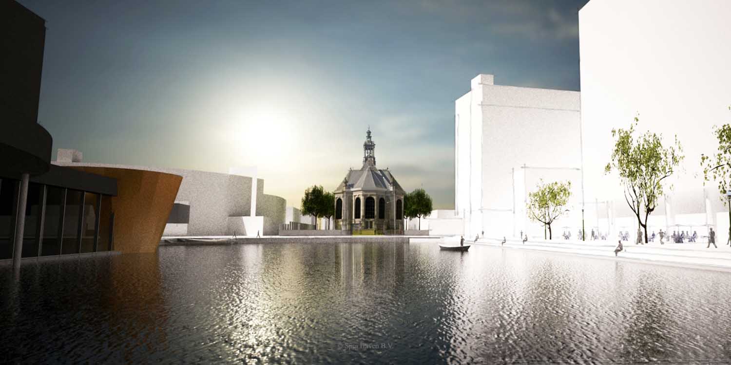 In het plan Spui Haven krijgt De Nieuwe Kerk krijgt haar dominante barokke positie in de stedenbouwkundige structuur van Den Haag weer terug. Onzichtbaar vanaf Zieken en Hofweg door haar teruggeplaatste positie in de kerktuin zal zij zich weer majesteus spiegelen in het water van Spui Haven, net als in 1656 toen door Republiek en stad tot de bouw van de kerk op deze locatie werd besloten. Die geraffineerde, prachtige ligging van de Nieuwe Kerk in de as van de gracht tussen de kades van Houtmarkt en Turfmarkt is inspiratiebron voor vele schilderijen en foto’s geweest. Dat beeld wordt terug gebracht met het Plan Spui Haven als drag.