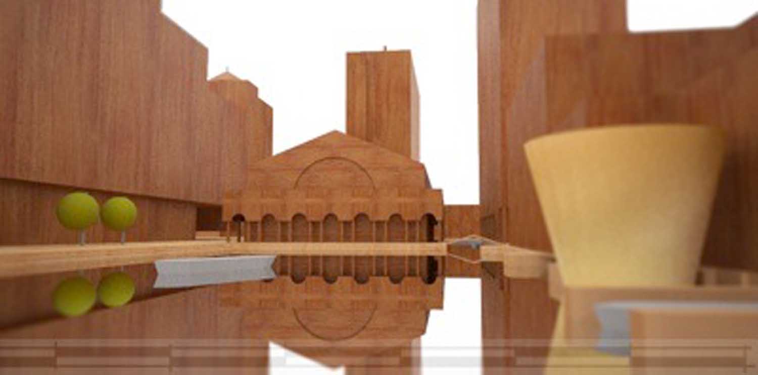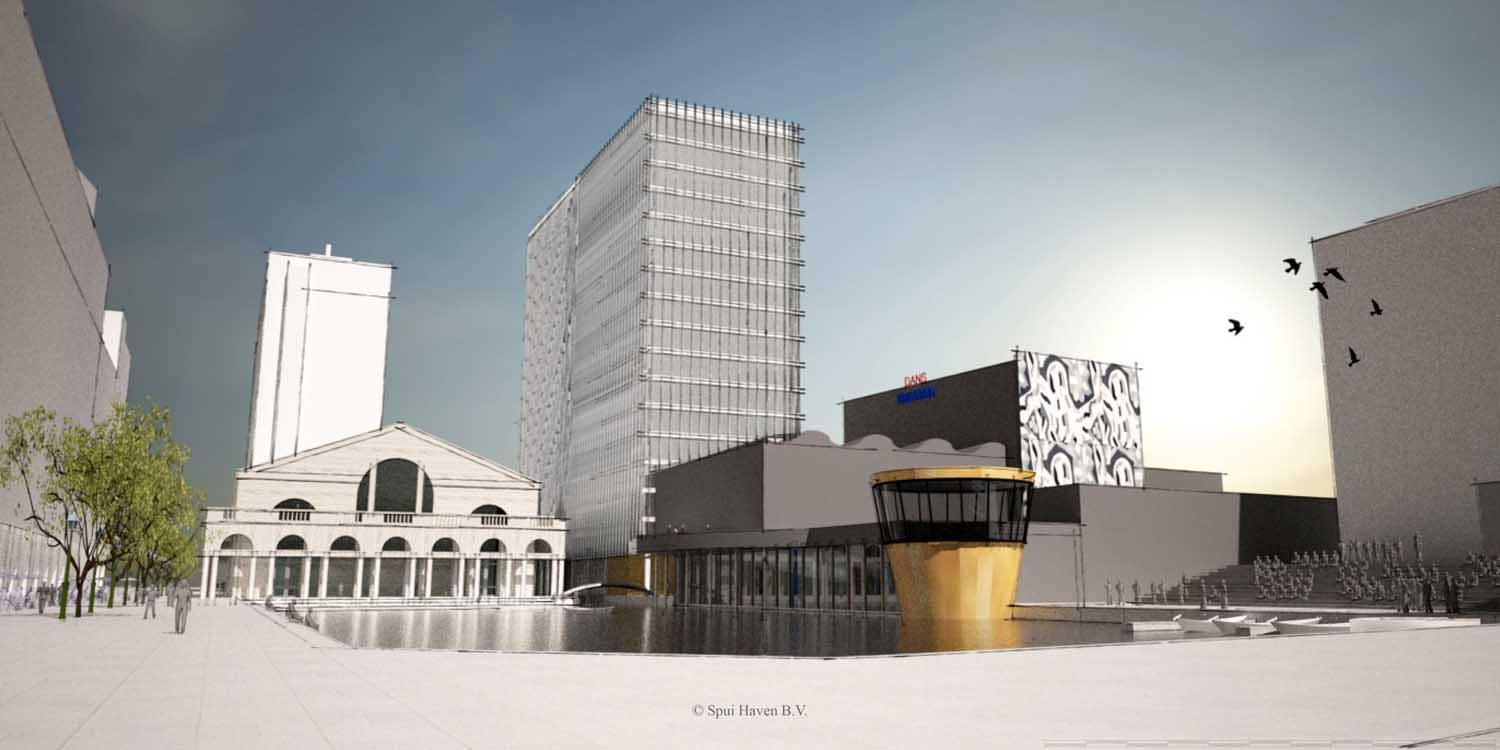 Het NDT wordt vrijwel geheel gehandhaafd: de foyer wordt verdiept onder de zaal aangelegd en krijgt ooghoogte zicht over het water. Ook dit gegeven biedt goede exploitatie buiten de avonden waar geen voorstelling plaatsvindt. Het goudkleurige Piccolo Mondo/Restaurant Braque profiteert ook van de Spui Haven oriëntatie. Een hoog over het water uitkragend avondbalcon dient mede als vluchtweg. Entrée en vluchtwegenstruktuur wordt nog nader bepaald evenals uitbreiding- en groot onderhouds eisen, e.e.a. i.s.m. architect Rem Koolhaas. Gezien zijn deelname aan de DBM tender en de daarmee gepaard gaande geheimhoudingseisen was consultatie van de ontwerper in deze fase niet mogelijk.