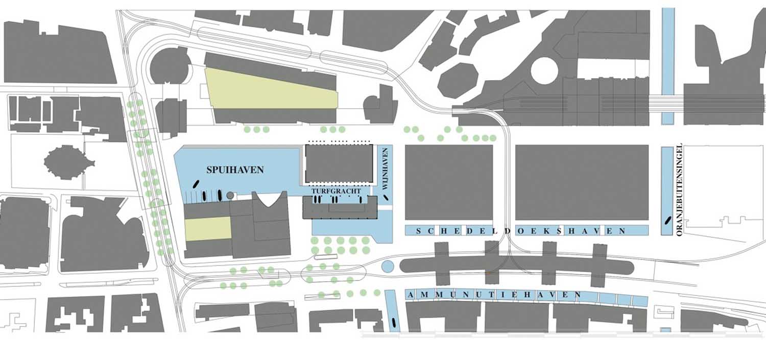 In het plan Spui Haven worden de eertijds aanwezige grachten weer open gegraven en bevaarbaar gemaakt.: Nieuwe Haven, Ammunitie Haven, Schedeldoeks Haven, Wijn Haven, Turf Gracht en Spui-Haven.