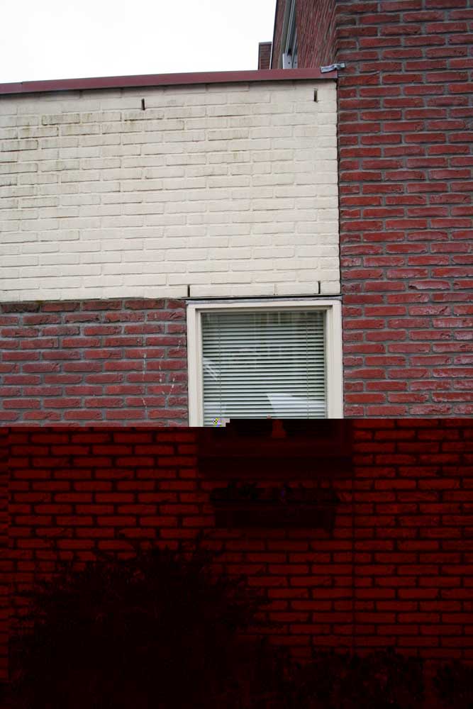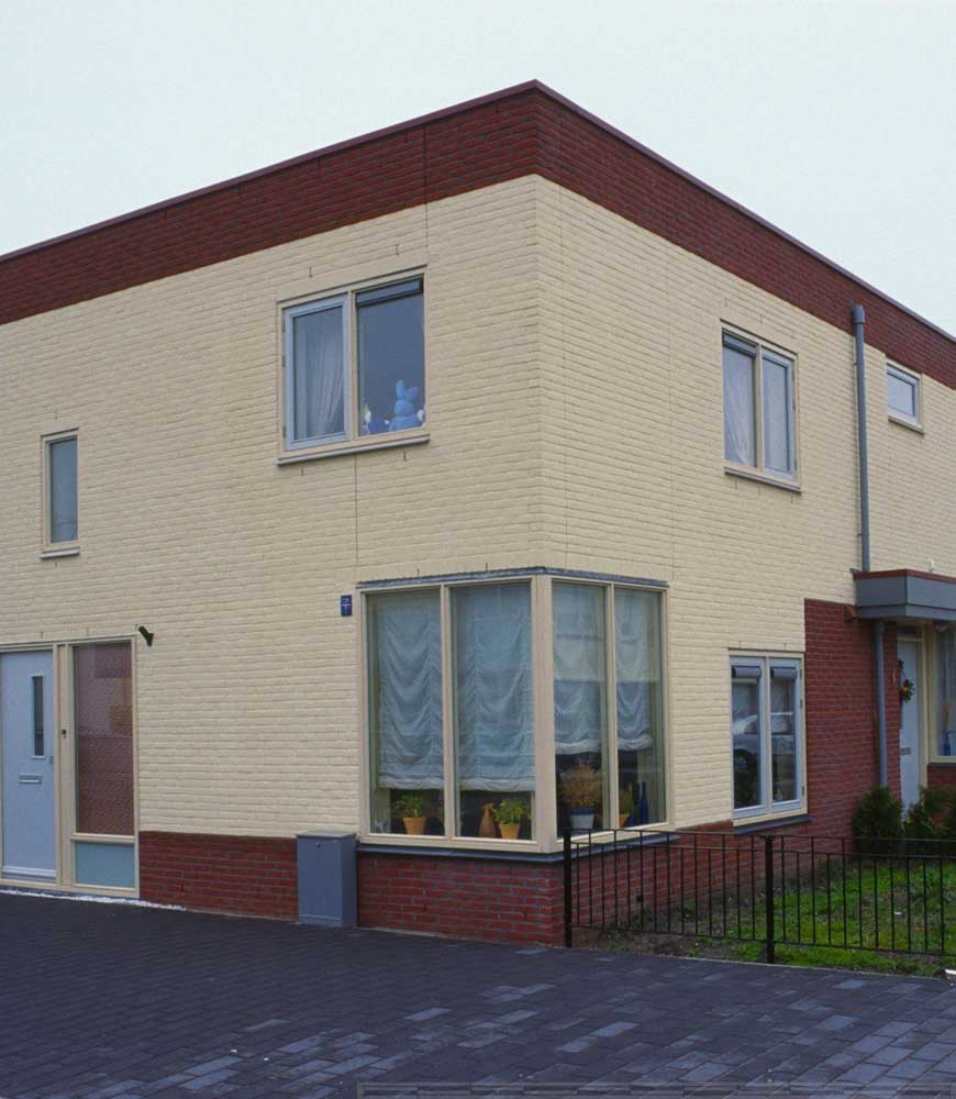 De kleurstelling van kozijnen in hof- en straatgevels is identiek waardoor deze gebroken witte kleur binnen- en buitenzijde van hof en straat verbindt.
