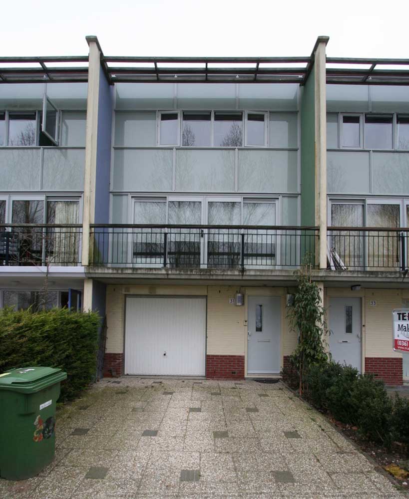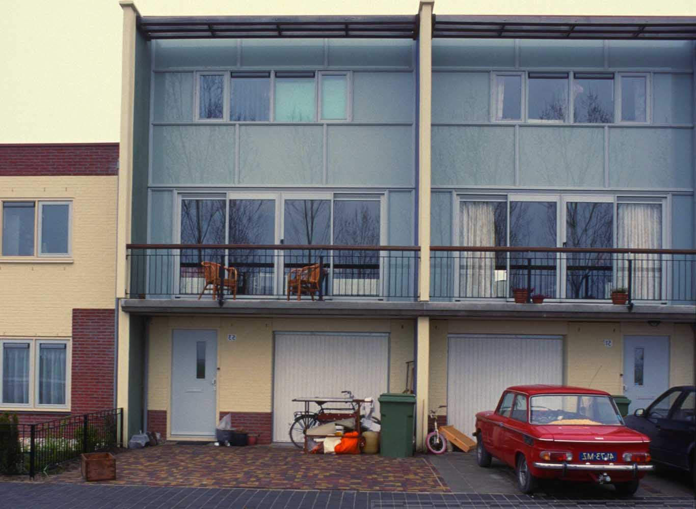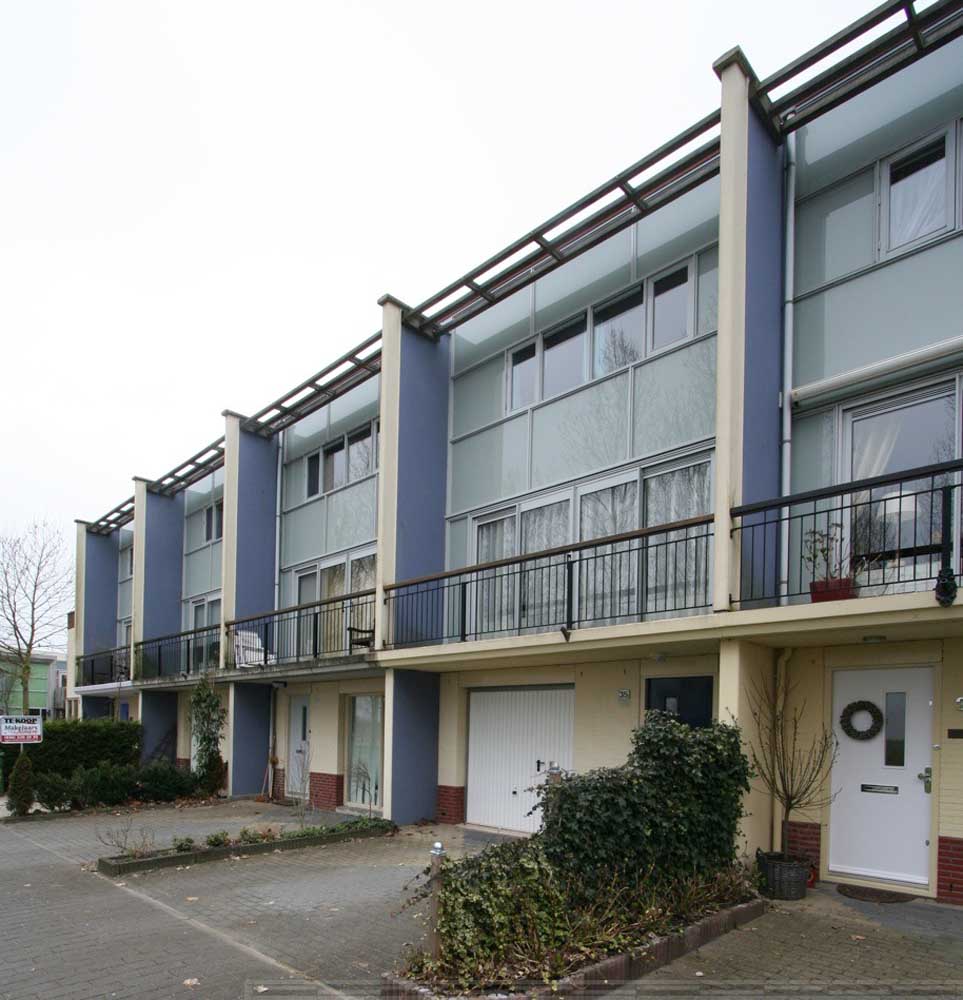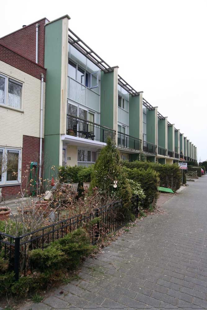 De gevel van de ‘verrekijker’ woningen aan de zuidzijde wijkt af: het terugliggende deel van deze gevel is geheel in glas uitgevoerd, transparant of blauwgrijs geëmailleerd. De neggekanten van de gevelschermen hebben verschillende kleuren zodat vanuit het perspectief de gevelrij telkens een ander aanzicht biedt: groen of blauw.