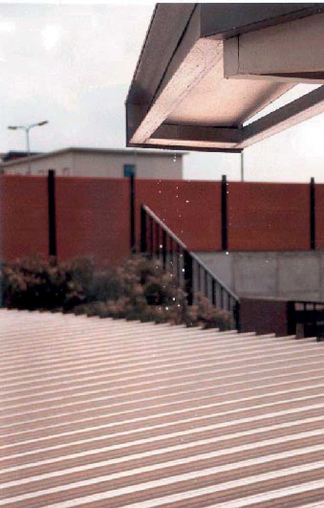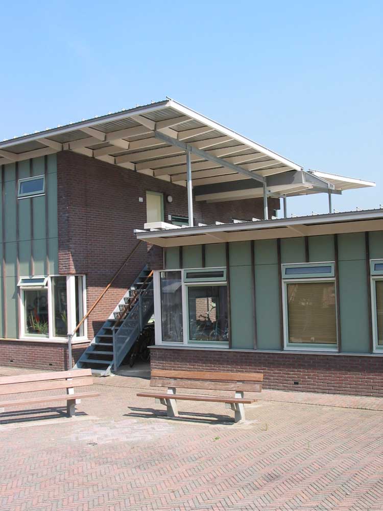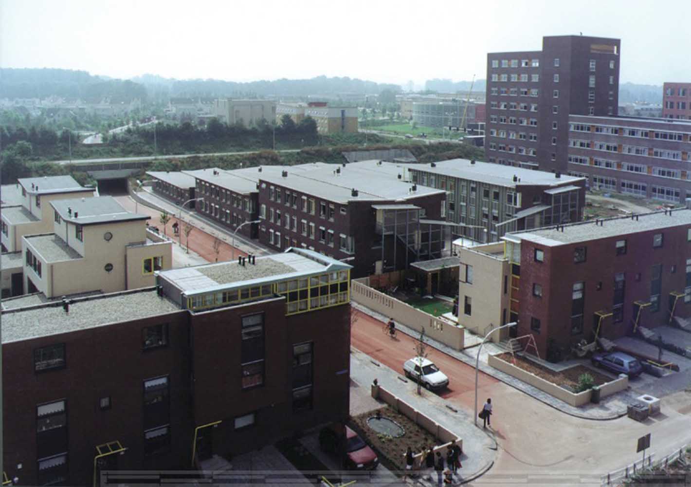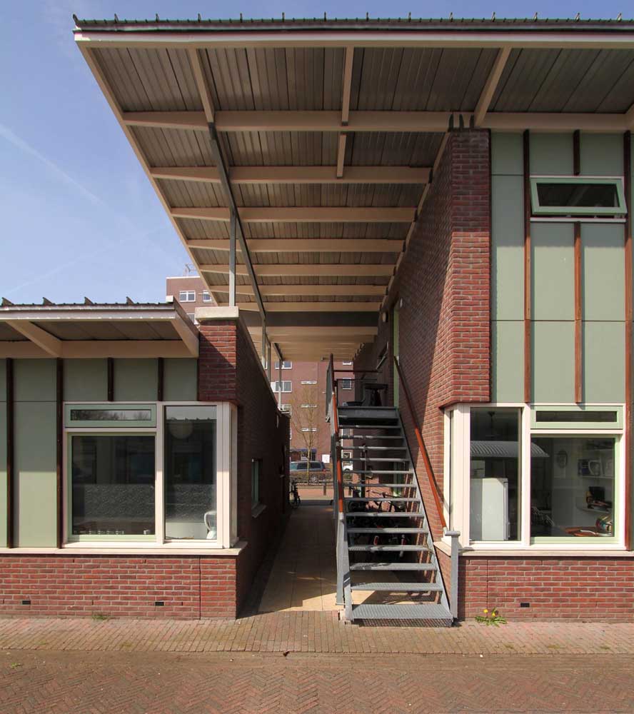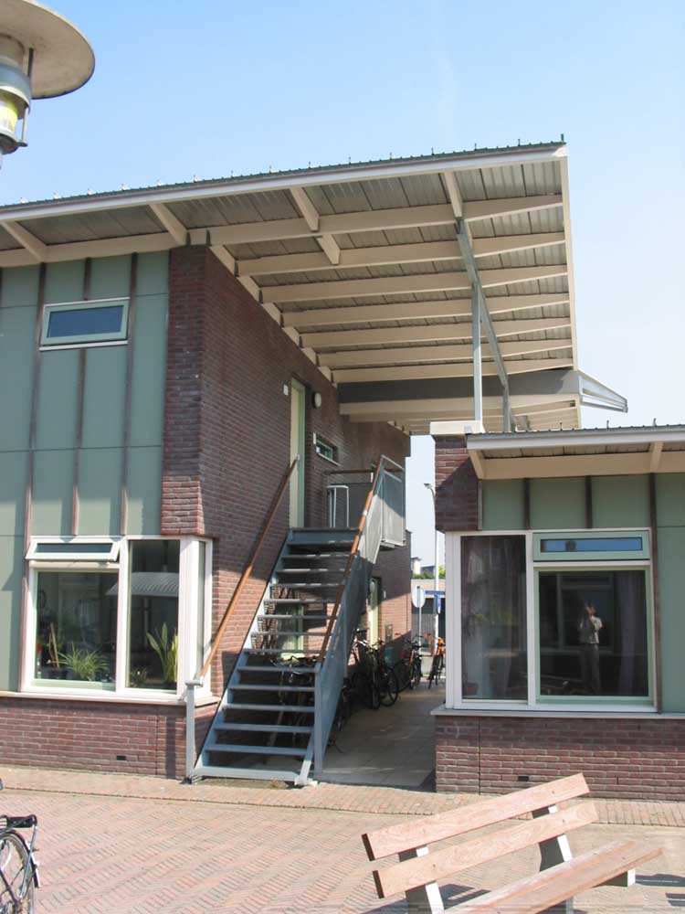 De blokjes volgen in hoogte de geluidcontour van de ten zuiden hiervan gelegen snelweg. In het plan zijn de in hoogte aflopende blokjes vormgegeven als cascade waar het hemelwater via een middengoot uiteindelijk verzameld wordt in een tweetal putten nabij het talud. De stegen zijn overdekt en worden aangelicht door het invallende zonlicht uit het zuiden. De blokken zijn uitgevoerd in metselwerk in een genuanceerde steen die elders in het gebied ook wordt toegepast; de gevels aan weerszijden van de autovrije hof zijn boven een gemetselde plint voorzien van groene gevelbekleding tussen latten van onbehandeld western red cedar. De opvallende dakbedekking die als luifels oversteekt bestaat uit aluminium Kal Zip felsstroken.