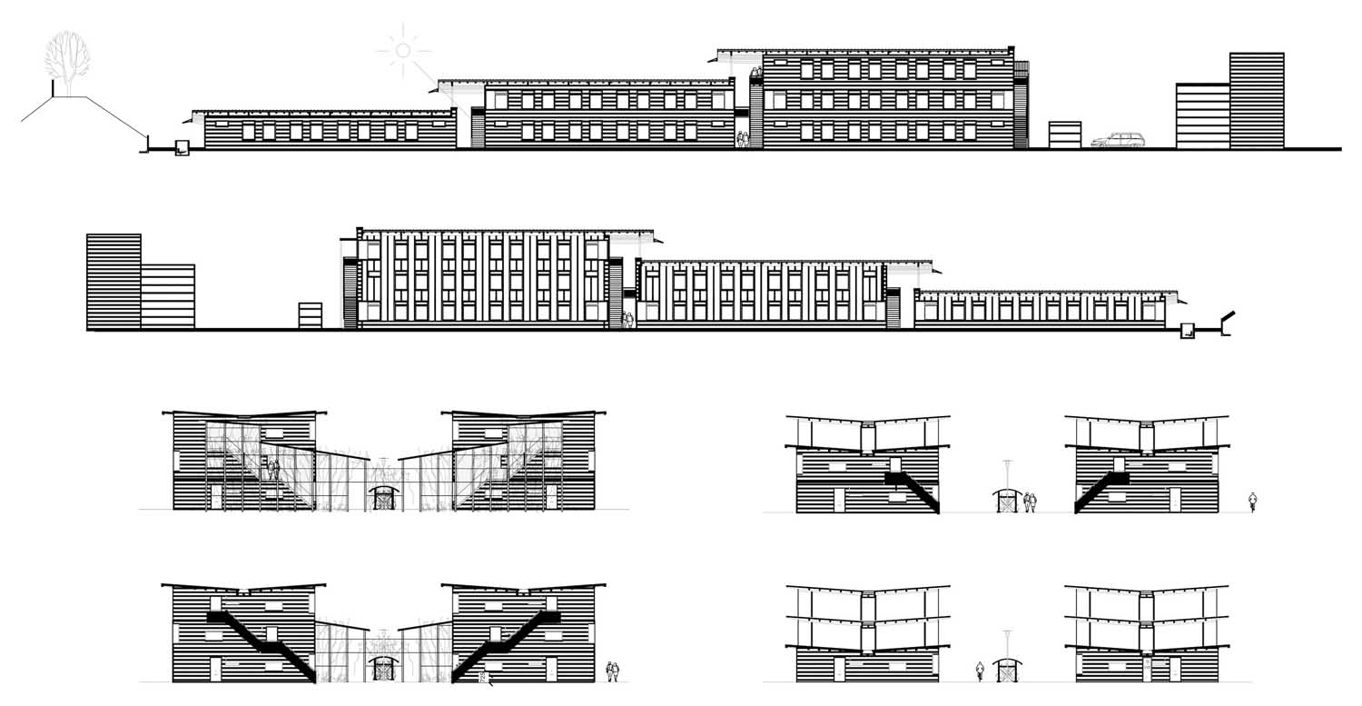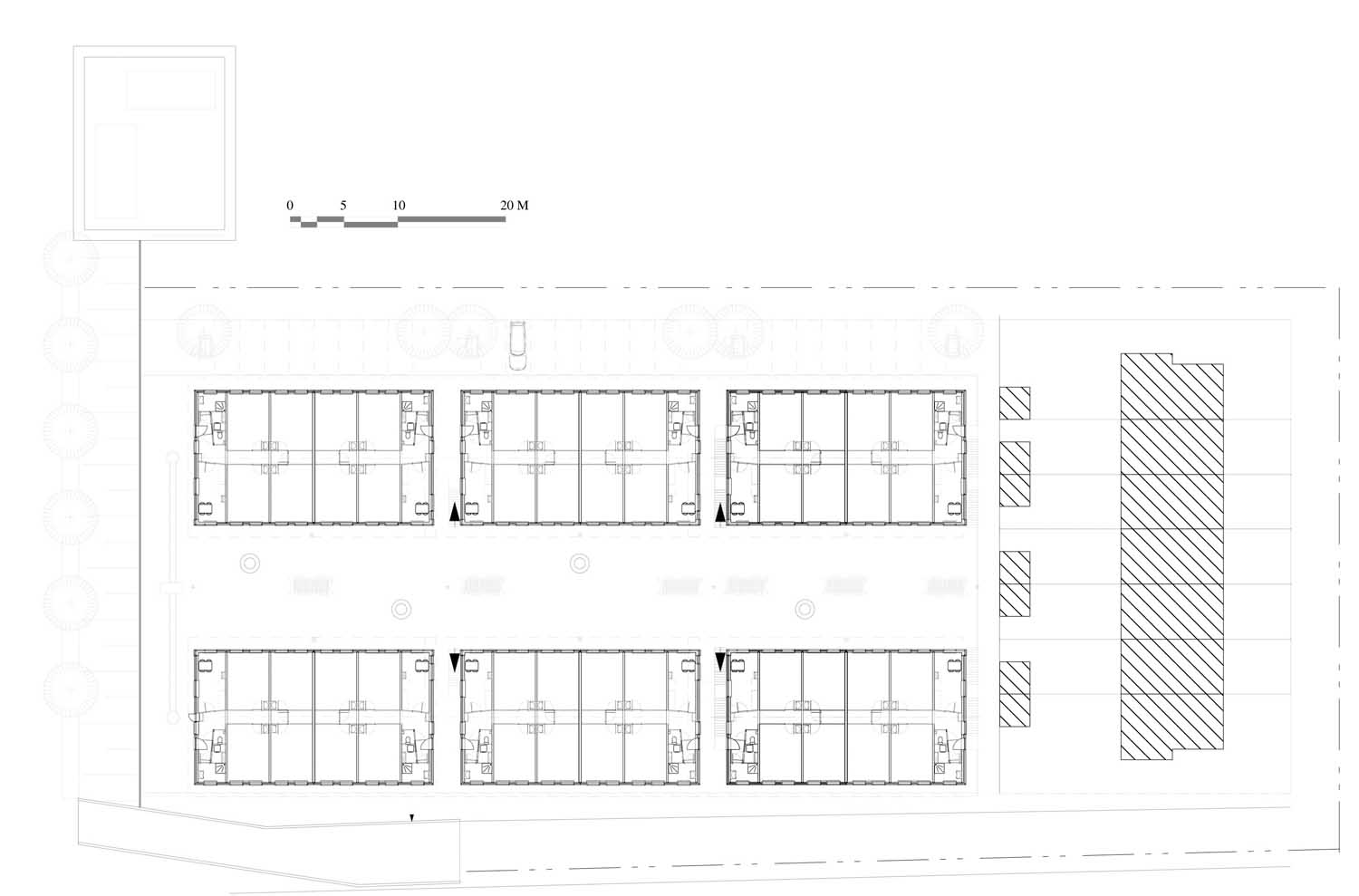 Twee reeksen van drie blokjes zijn gelegen aan weerszijden van een autovrije hof, de gemeenschappelijke buitenruimte