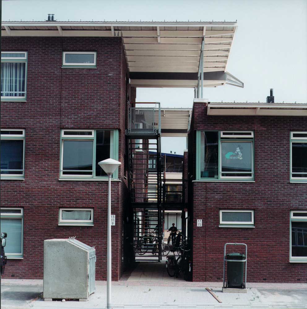 van het plan. De blokjes zijn gescheiden door doorgaande stegen, waar entrees en trappen liggen. De plattegronden klappen om de lengte-as per verdieping om waardoor doorgaande trappen ontstaan en de woonkeukens aan straatzijde of hofzijde gelegen zijn.
