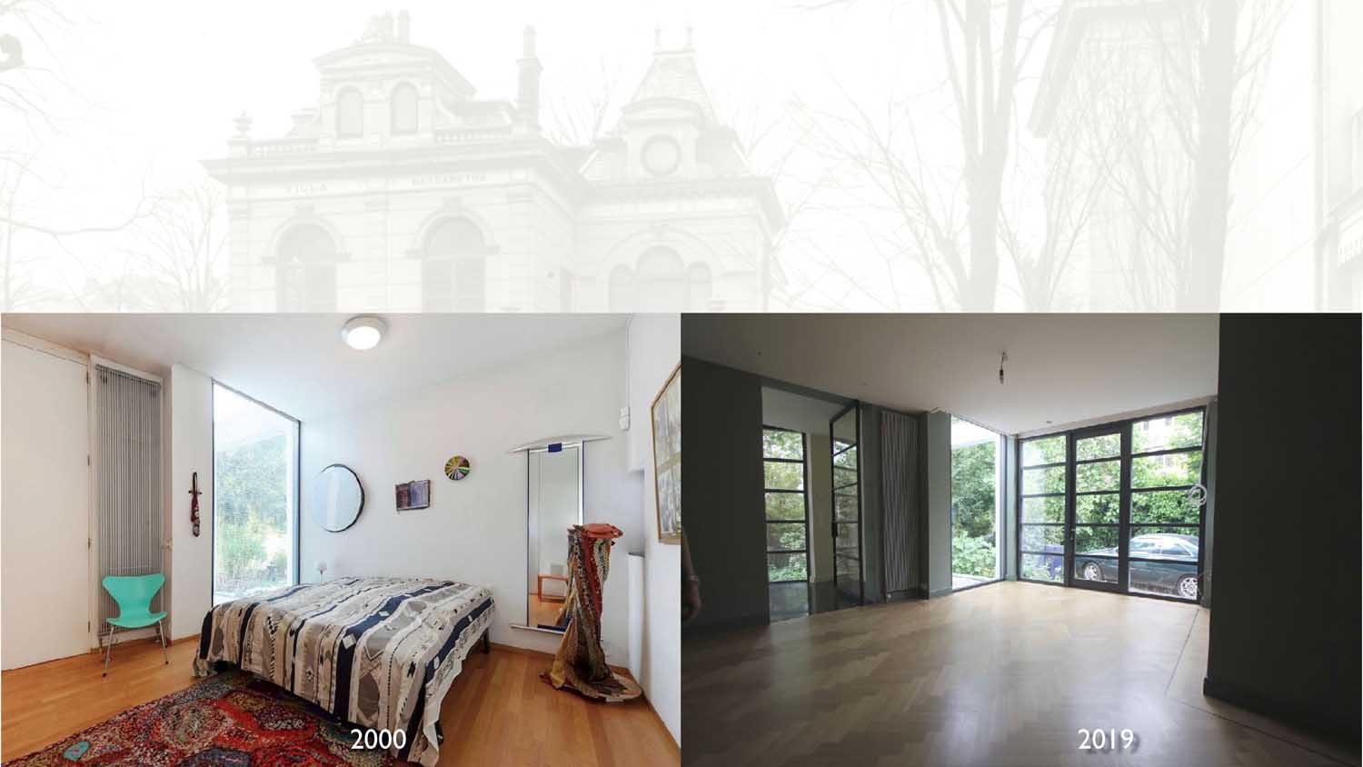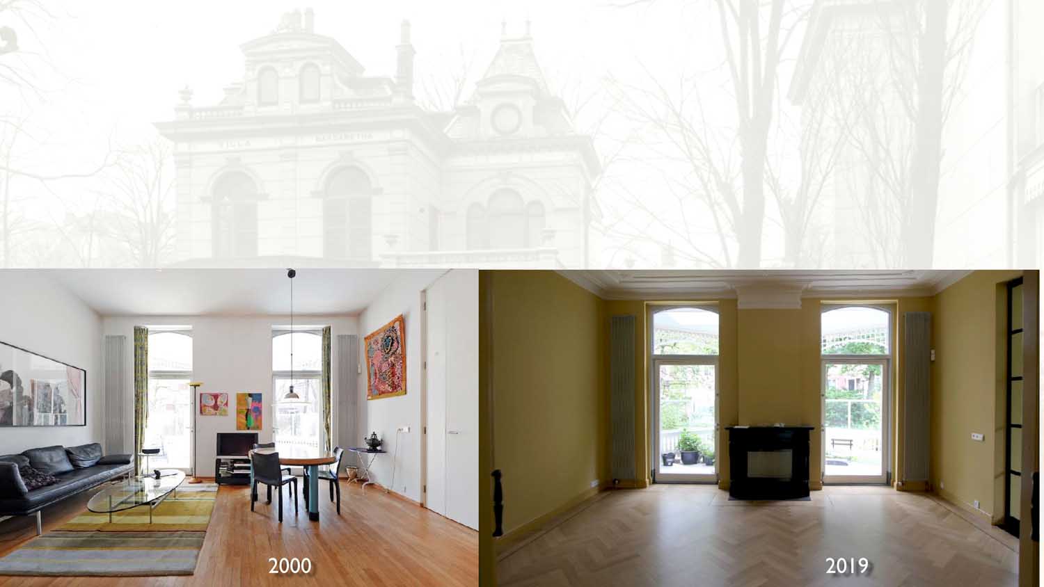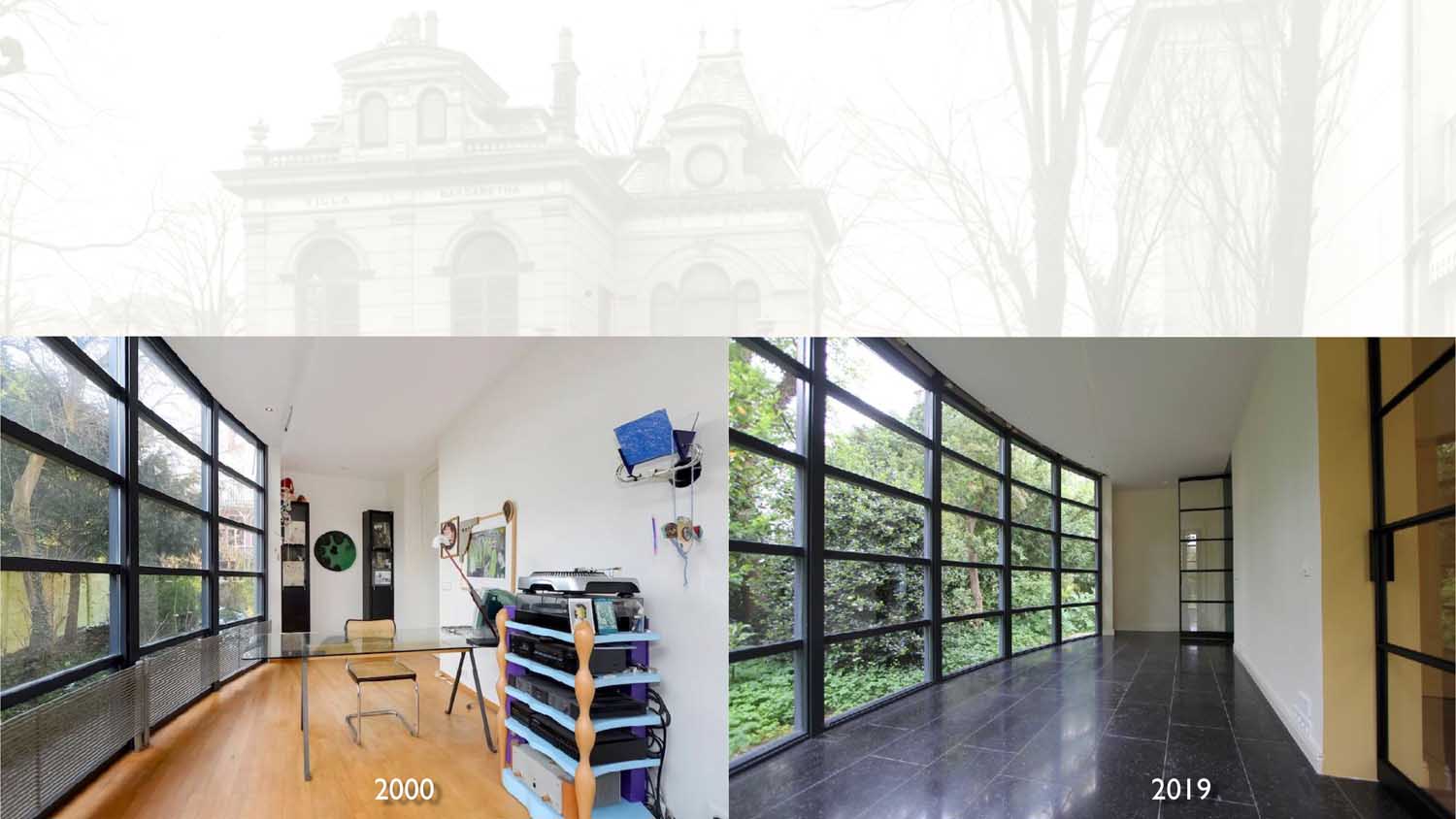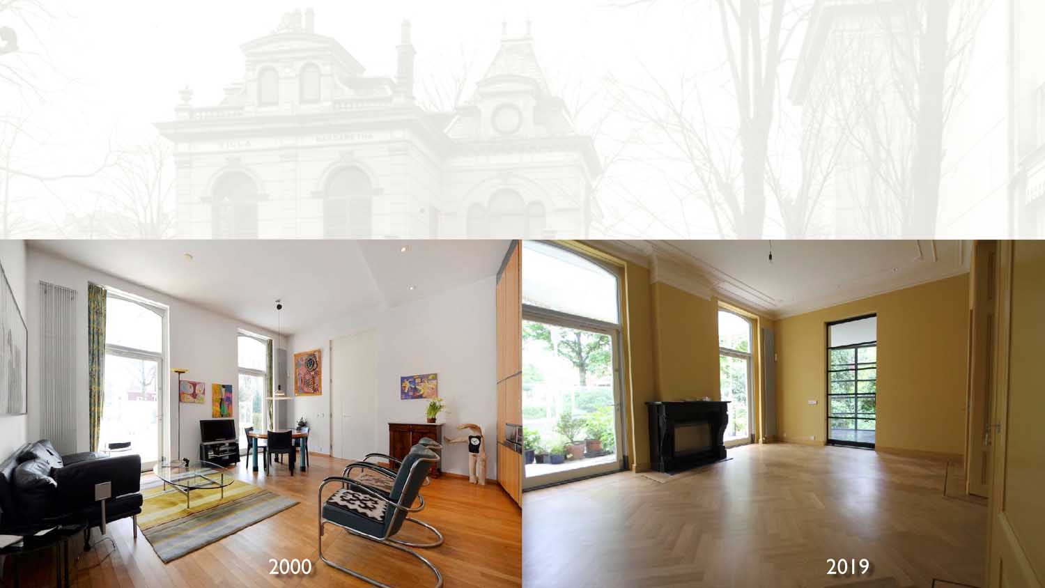 Deze villa werd eind jaren ’80 op een hippe manier verbouwd tot woonhuis met een volledig woonprogramma op de begane grond.