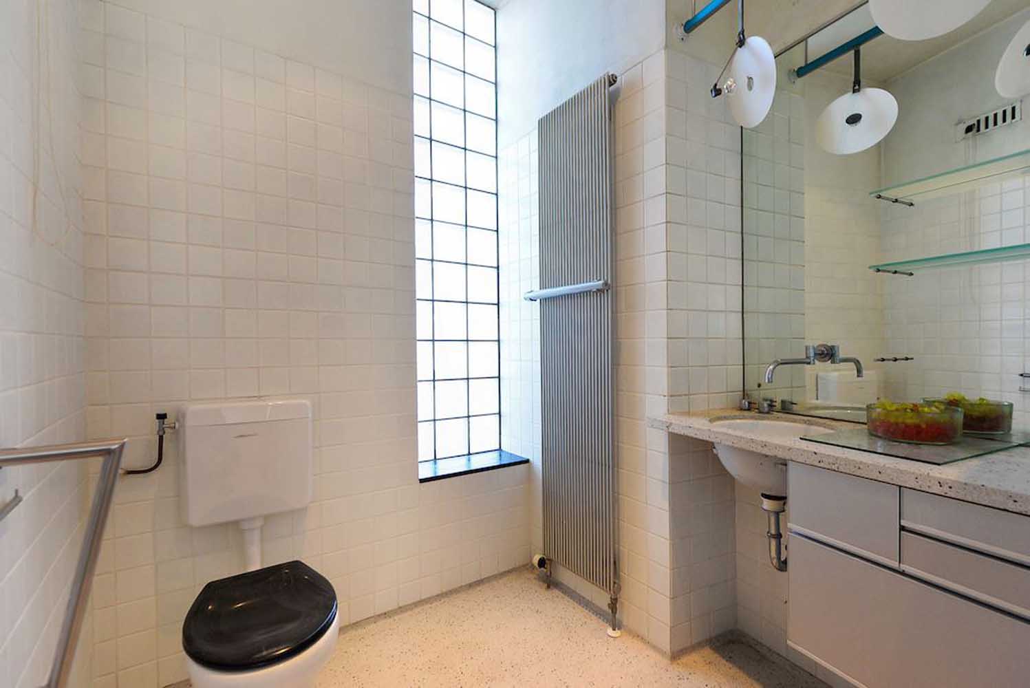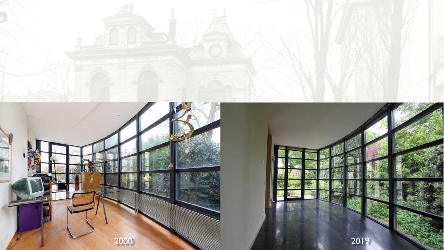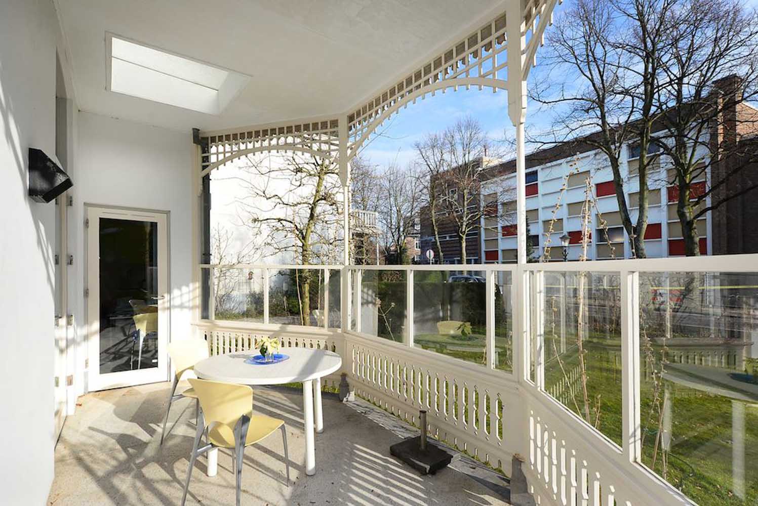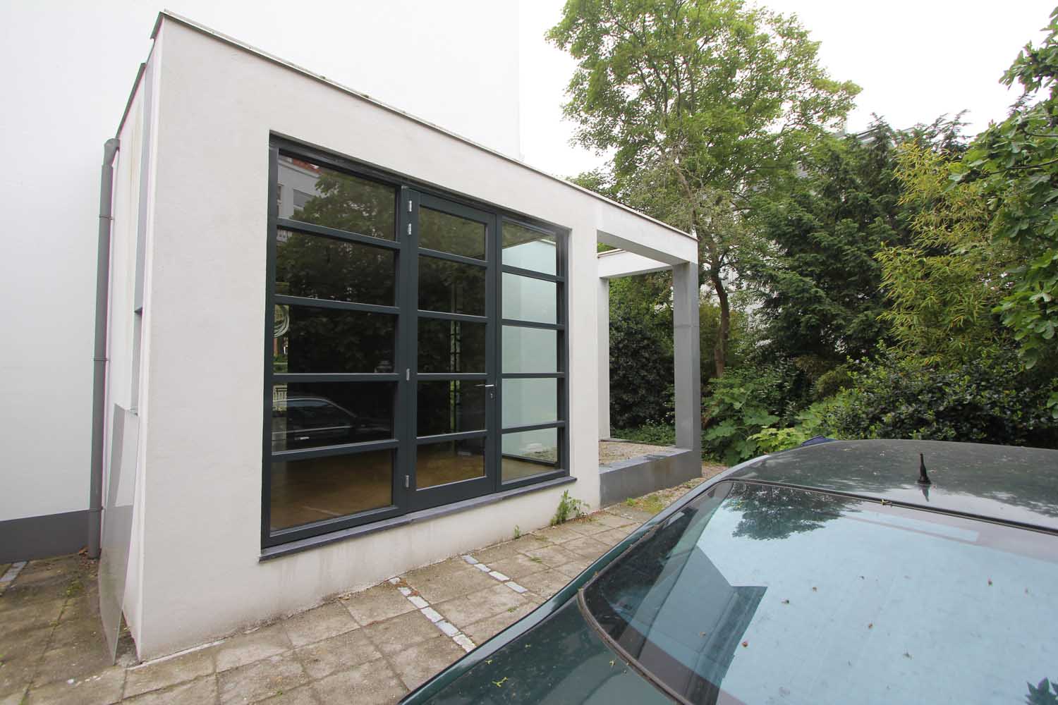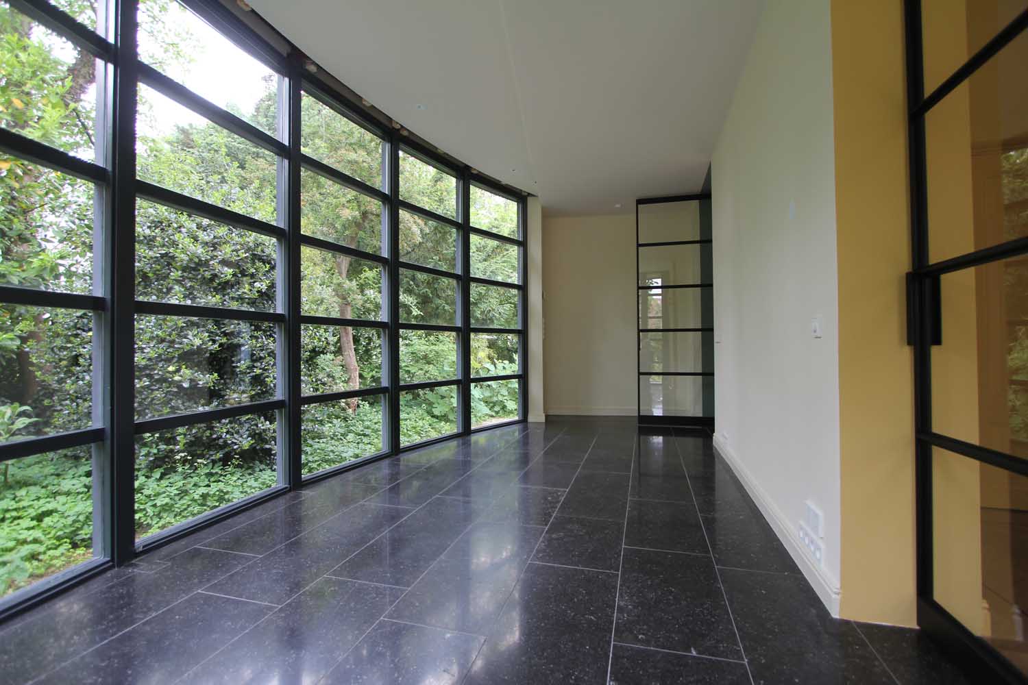 Deze villa werd eind jaren ’80 op een hippe manier verbouwd tot woonhuis met een volledig woonprogramma op de begane grond.