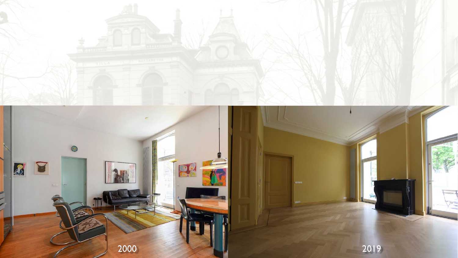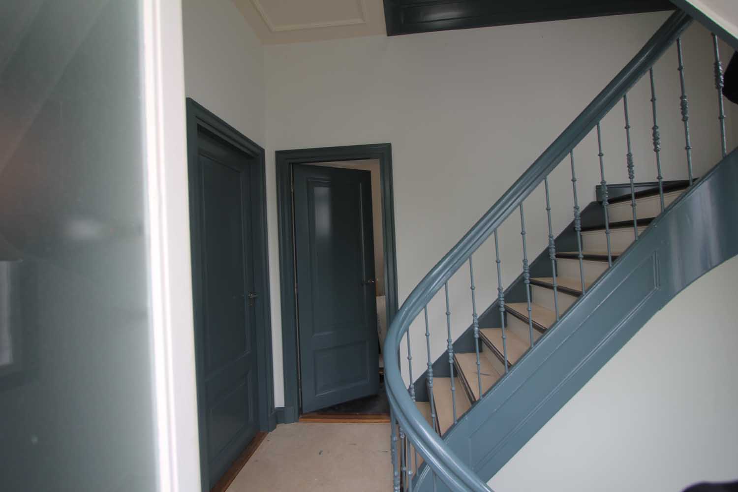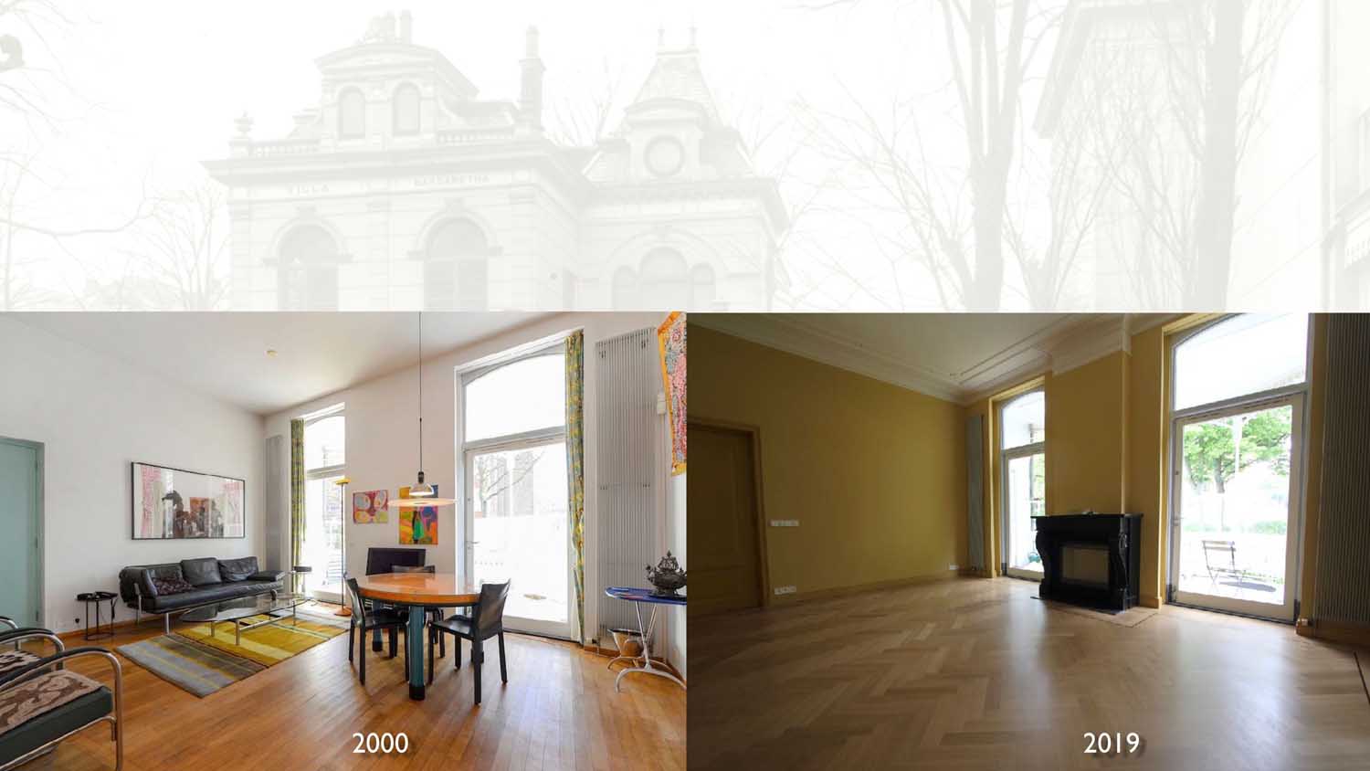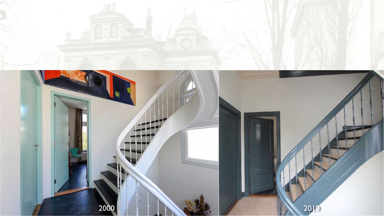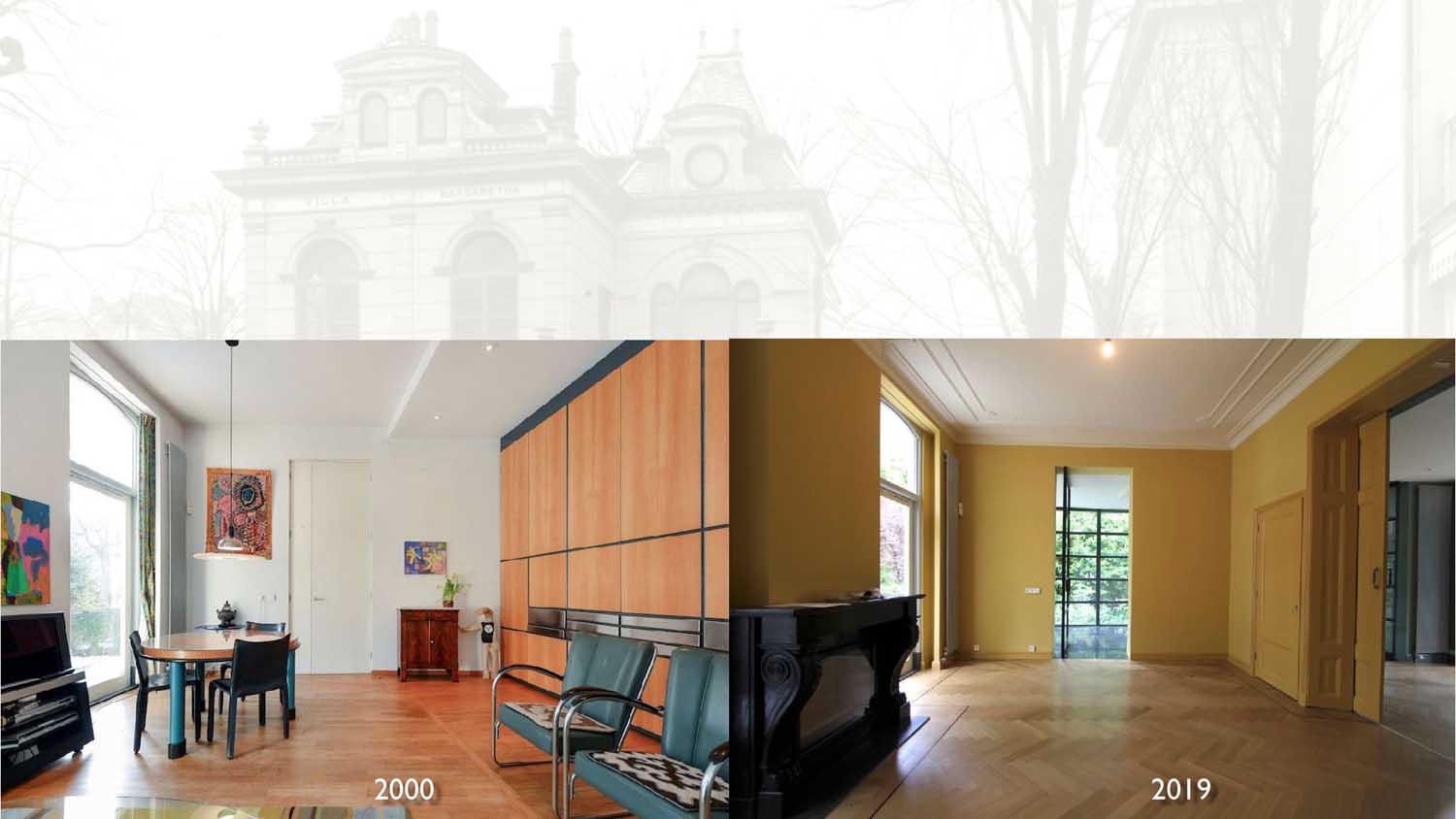 De nieuwe eigenaar besloot de woonkamer meer de oorspronkelijke sfeer terug te geven die het huis meer intimiteit en rust zou geven. Een volledig nieuwe separatie en schoorsteenboezem werden teruggebracht op de oorspronkelijke plek. Een klassiek modern palet van opdrachtgever doet de rest. We hebben vergelijkende foto’s opgenomen van de toestand voor de restauratie en erna.