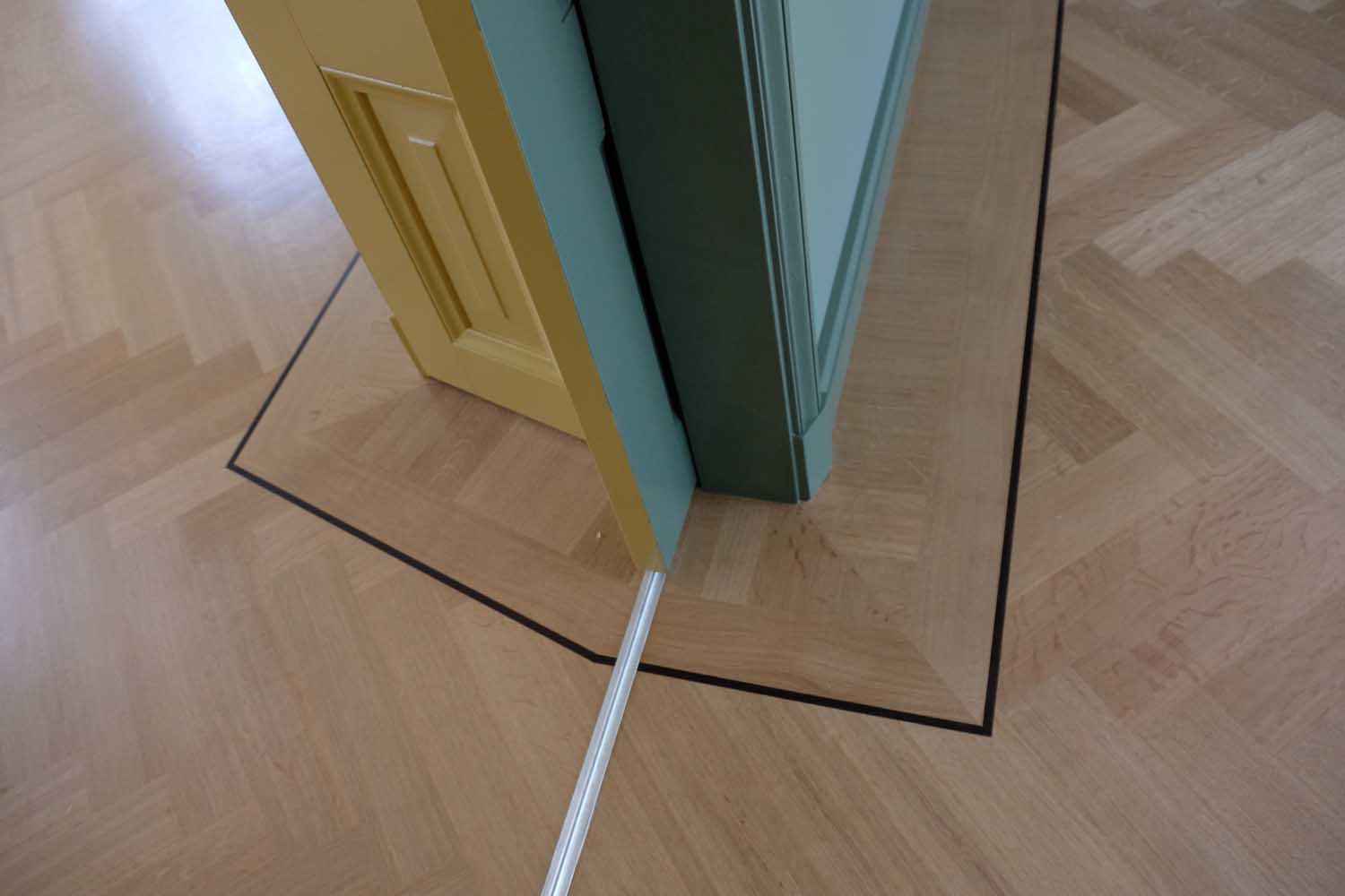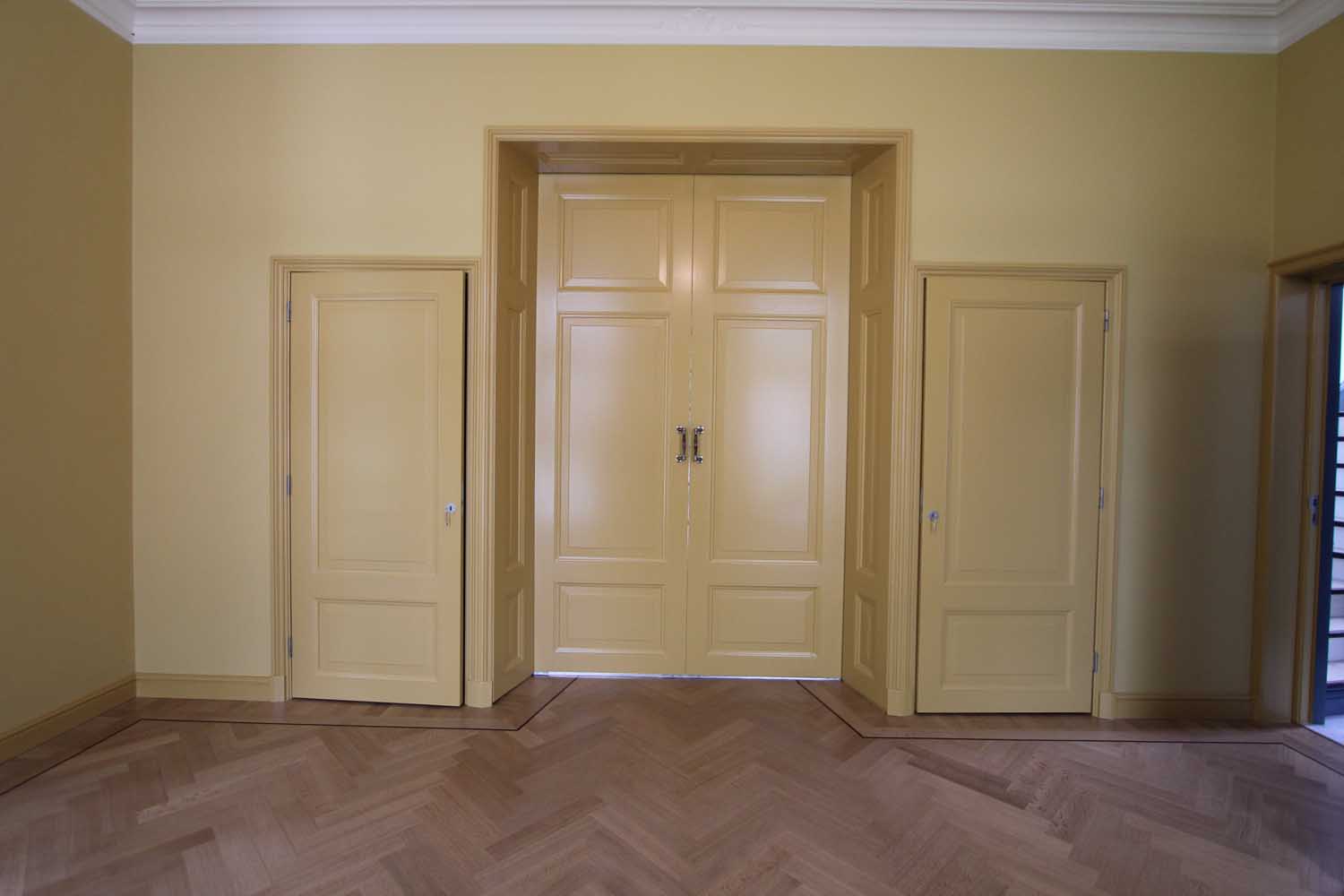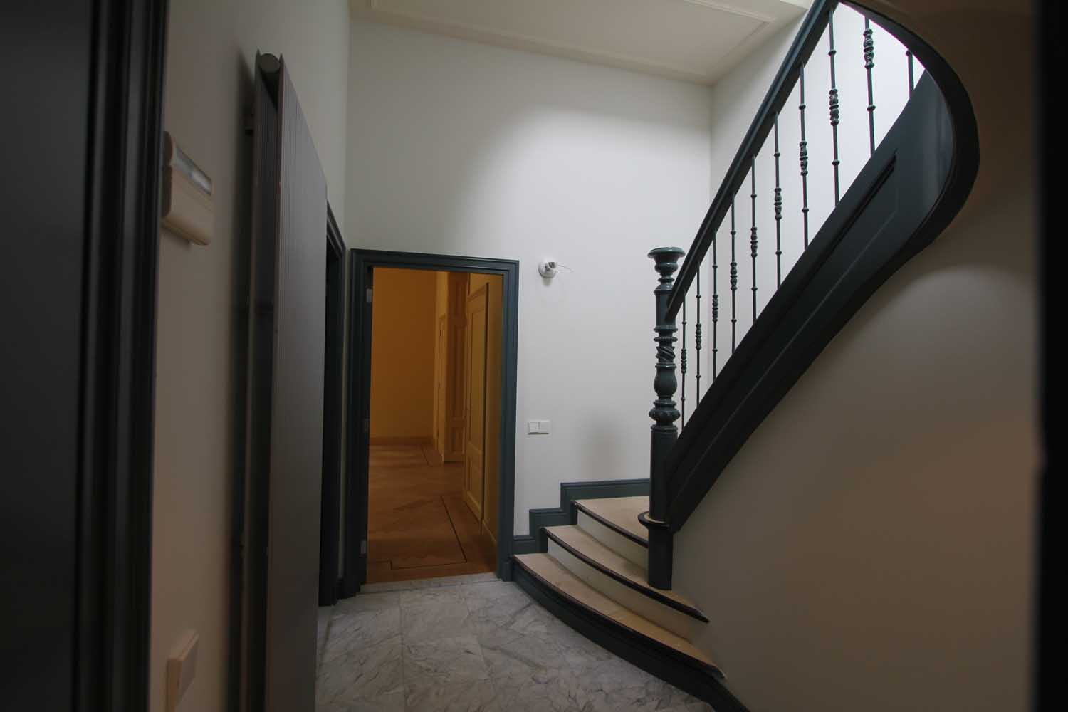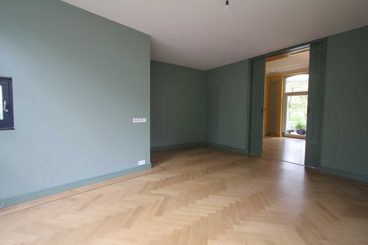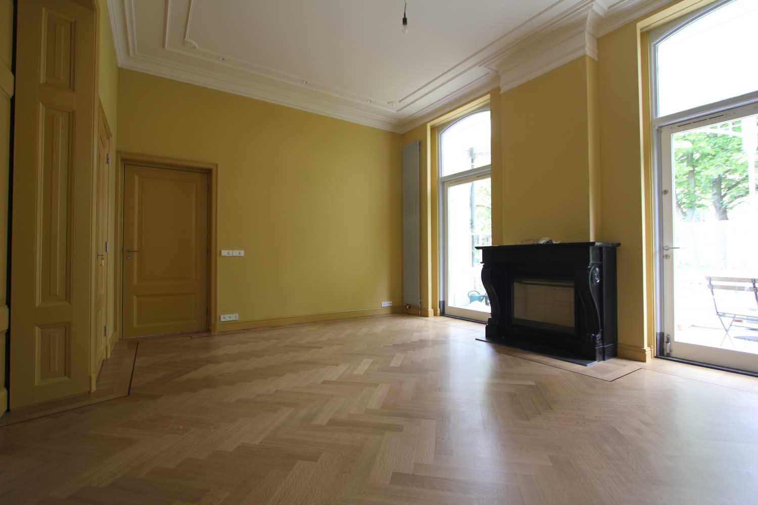 De nieuwe eigenaar besloot de woonkamer meer de oorspronkelijke sfeer terug te geven die het huis meer intimiteit en rust zou geven. Een volledig nieuwe separatie en schoorsteenboezem werden teruggebracht op de oorspronkelijke plek. Een klassiek modern palet van opdrachtgever doet de rest. We hebben vergelijkende foto’s opgenomen van de toestand voor de restauratie en erna.