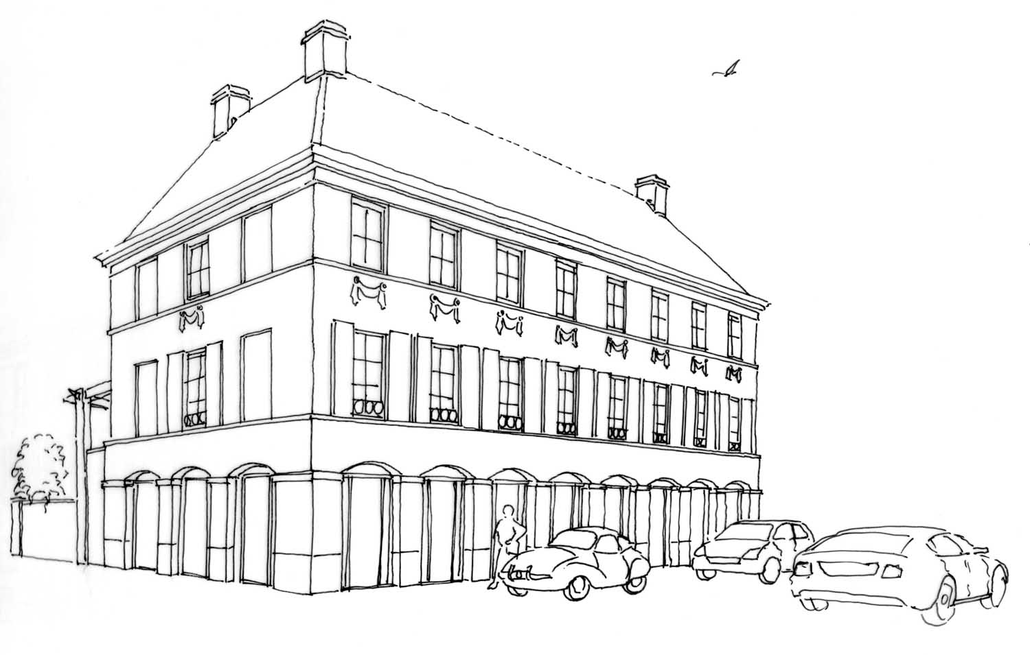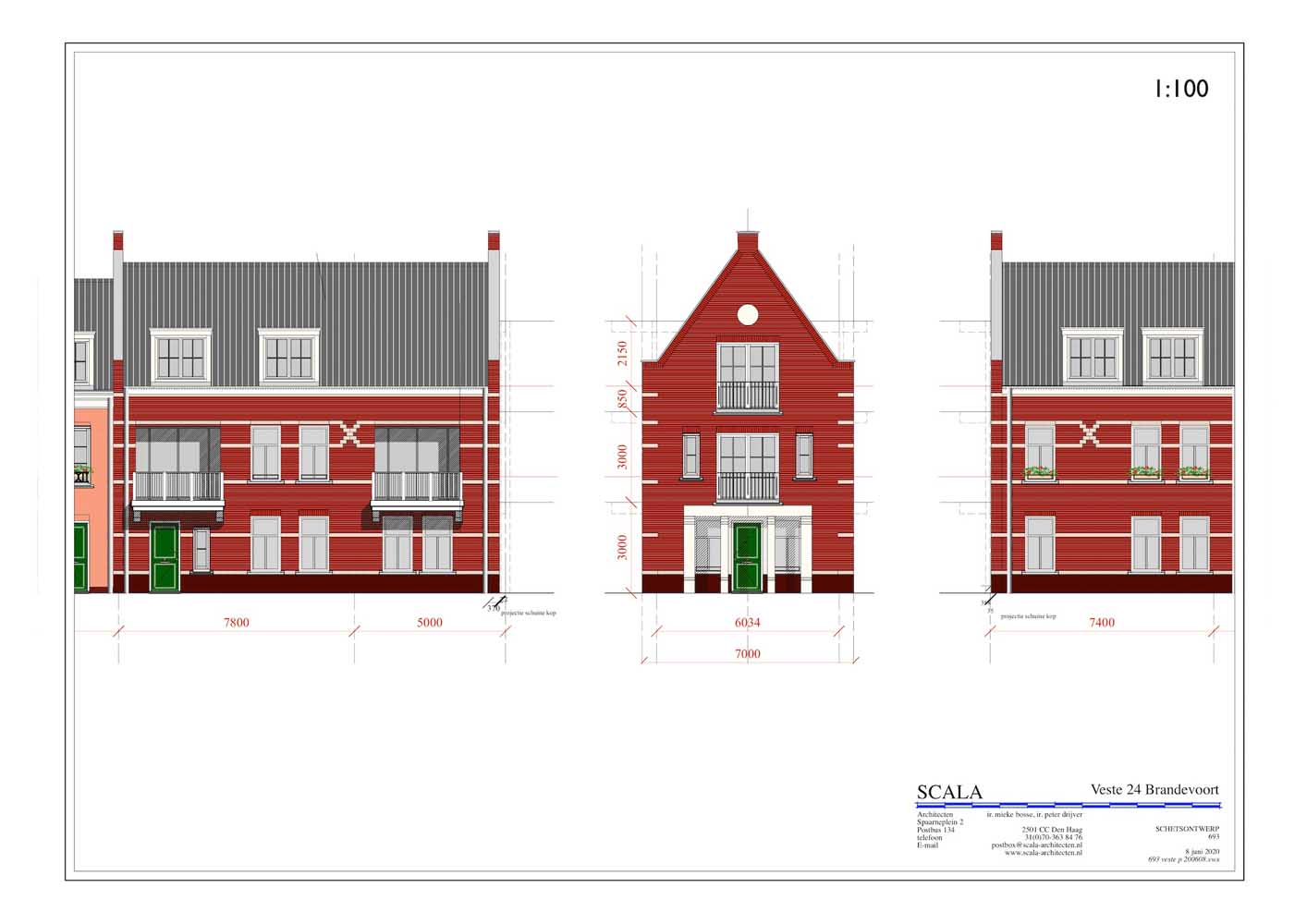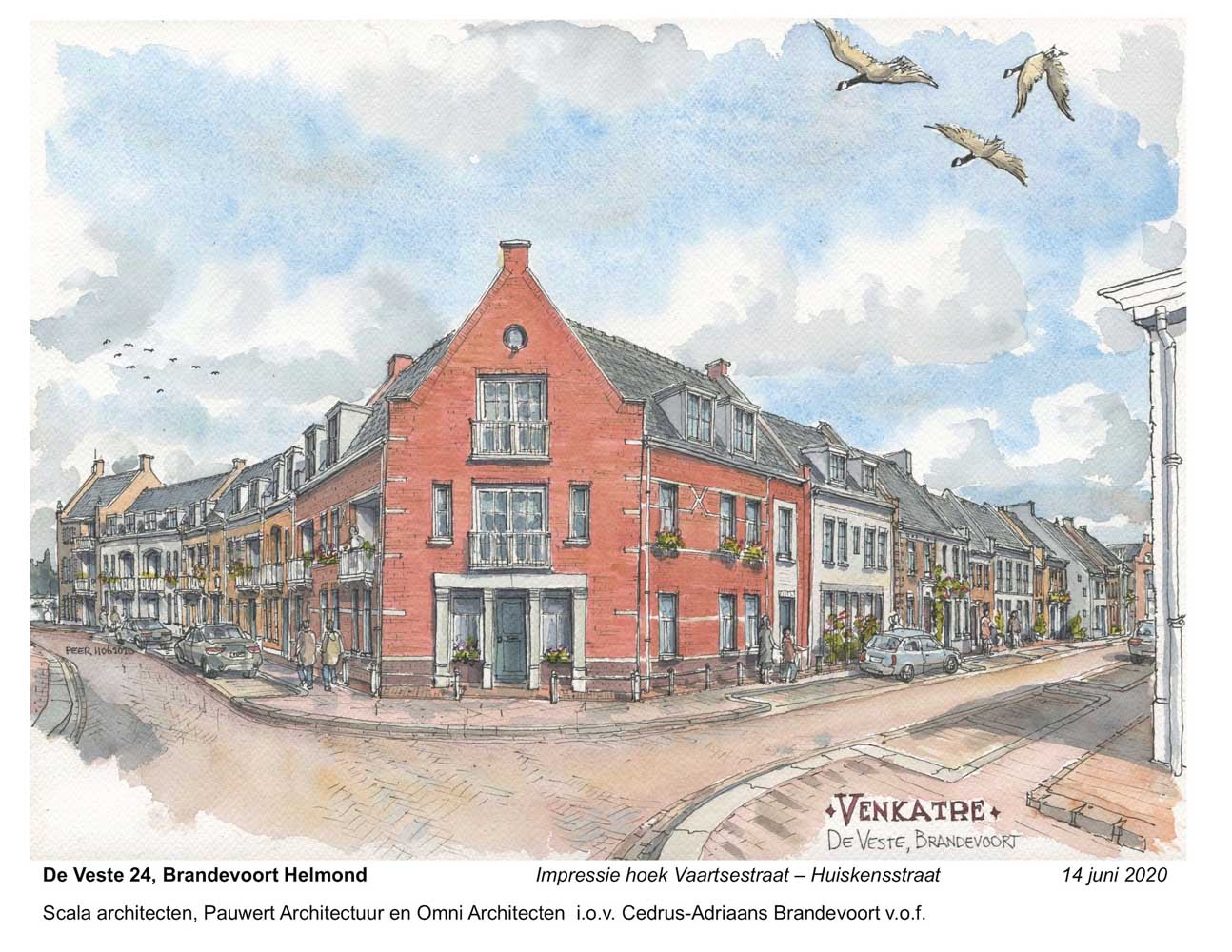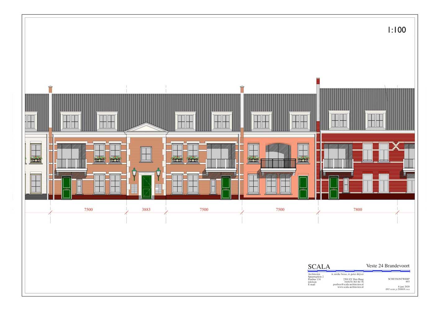 In de Veste, de binnenstad van Brandevoort, zullen nog een aantal bouwblokken gerealiseerd worden. Conform het Masterplan gebeurt dat door meerdere architecten, in dit geval 3 bureaus. Gezamenlijk is de schetsfase doorlopen. Al in een vroege fase worden de gevels in de schaal 1:100 neergelegd en de straatwanden als geheel ontworpen. Scala heeft in dit blok 38 appartementen ontworpen en 4 woonwerkwoningen.