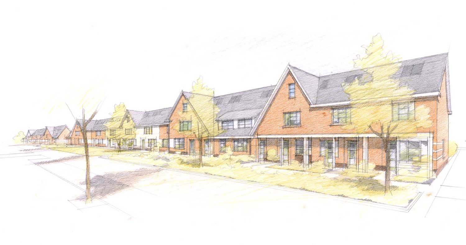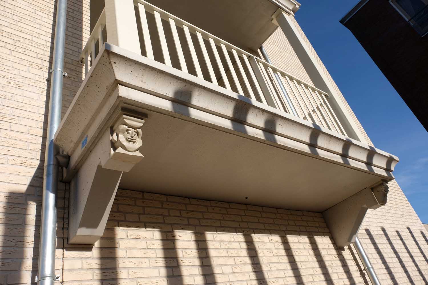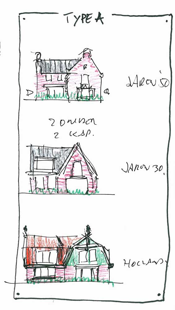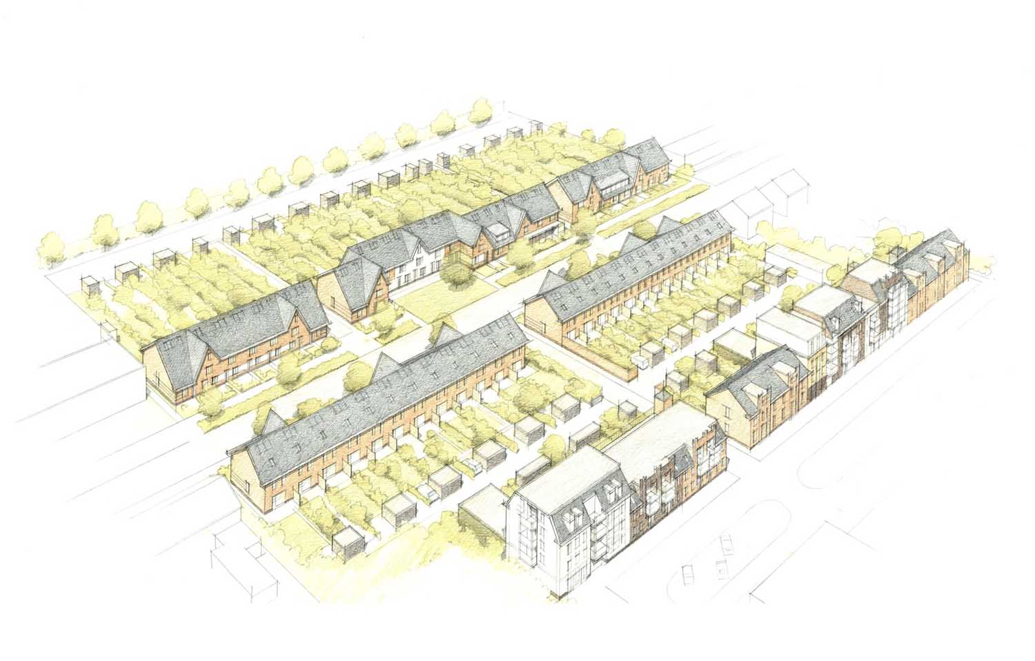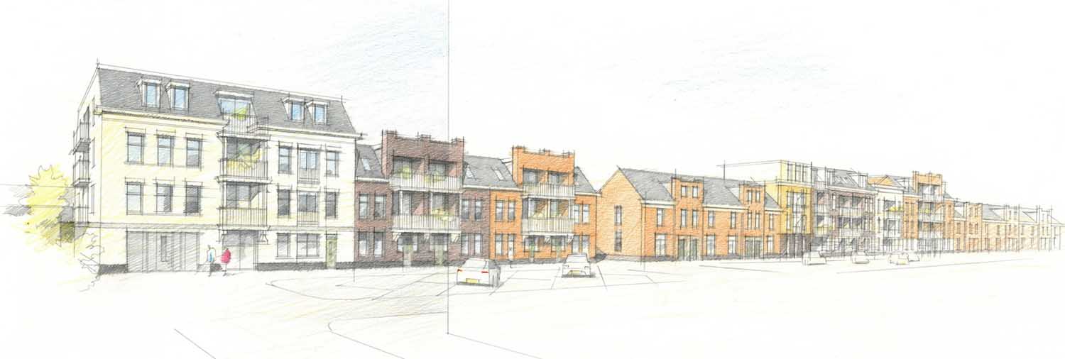 De levendigheid van de pleinwand en de maatverschillen tussen appartementenblokken en eengezonswoningen zijn op elkaar betrokken.