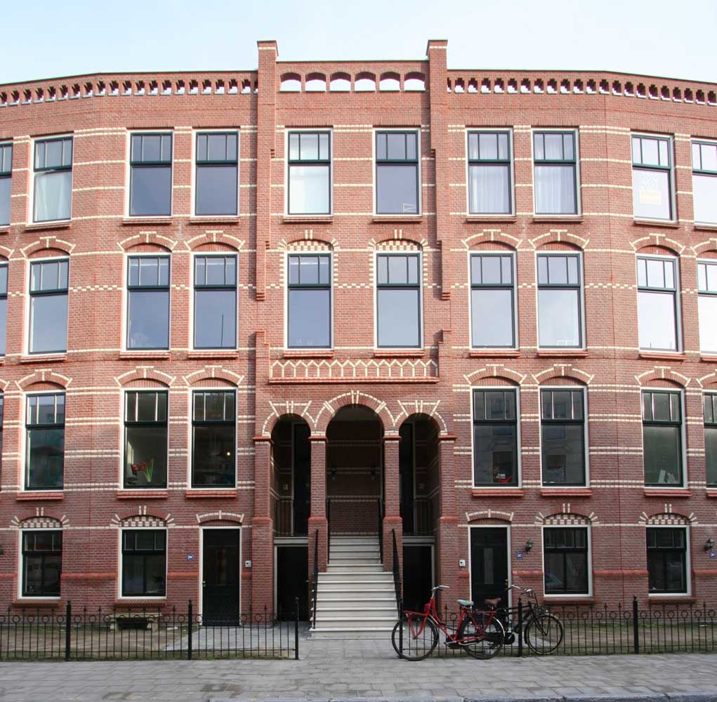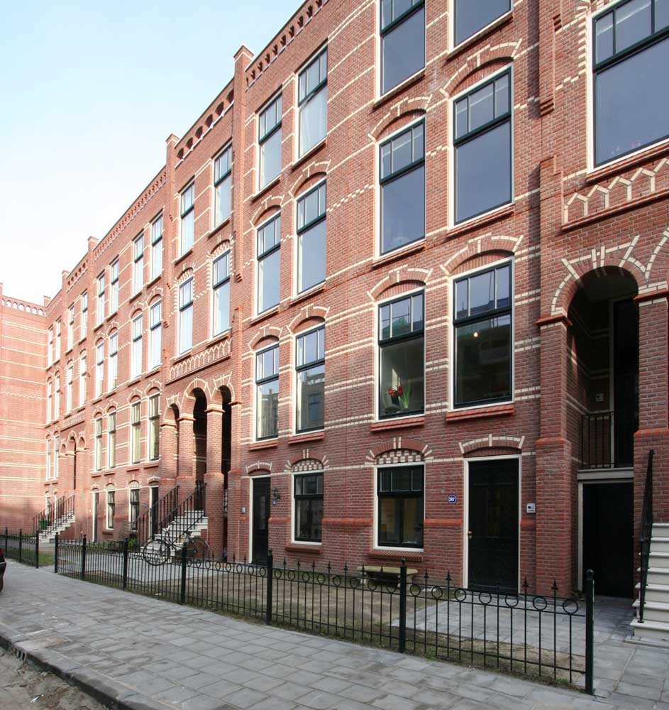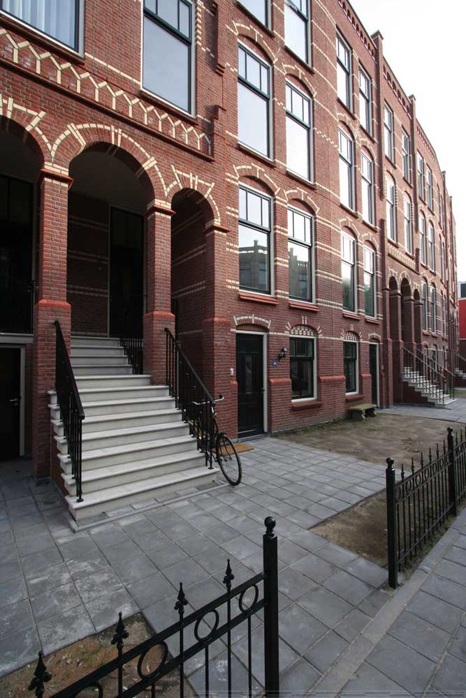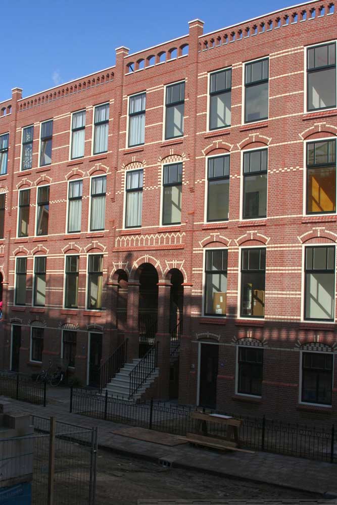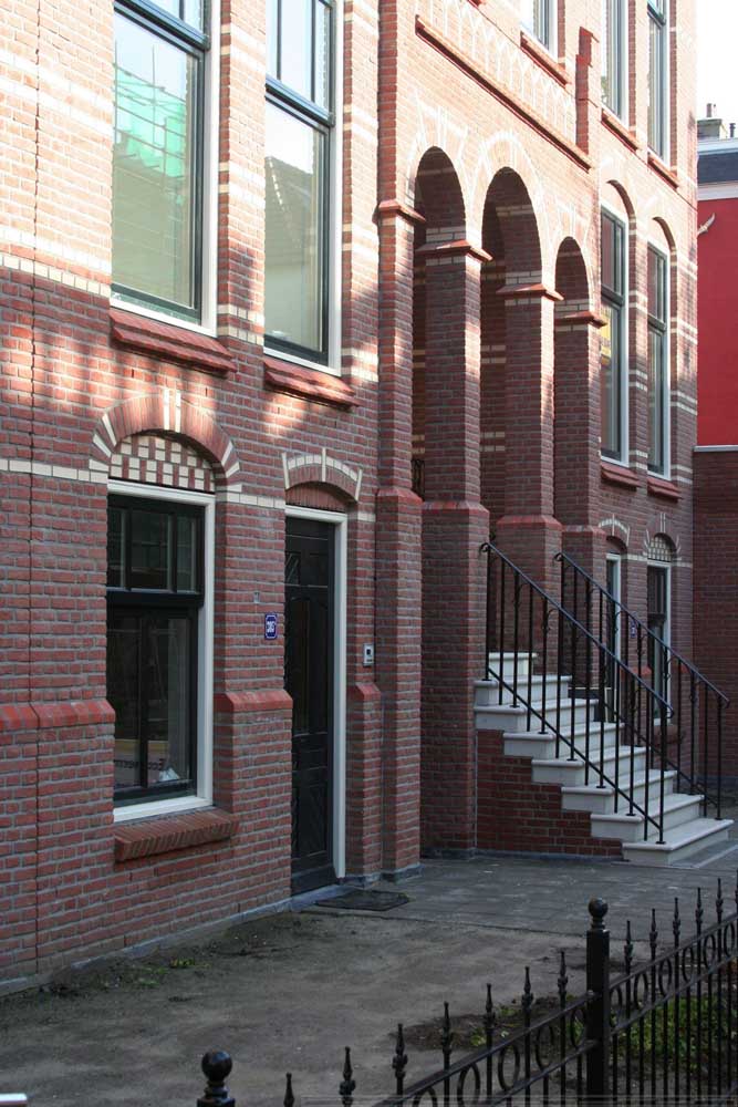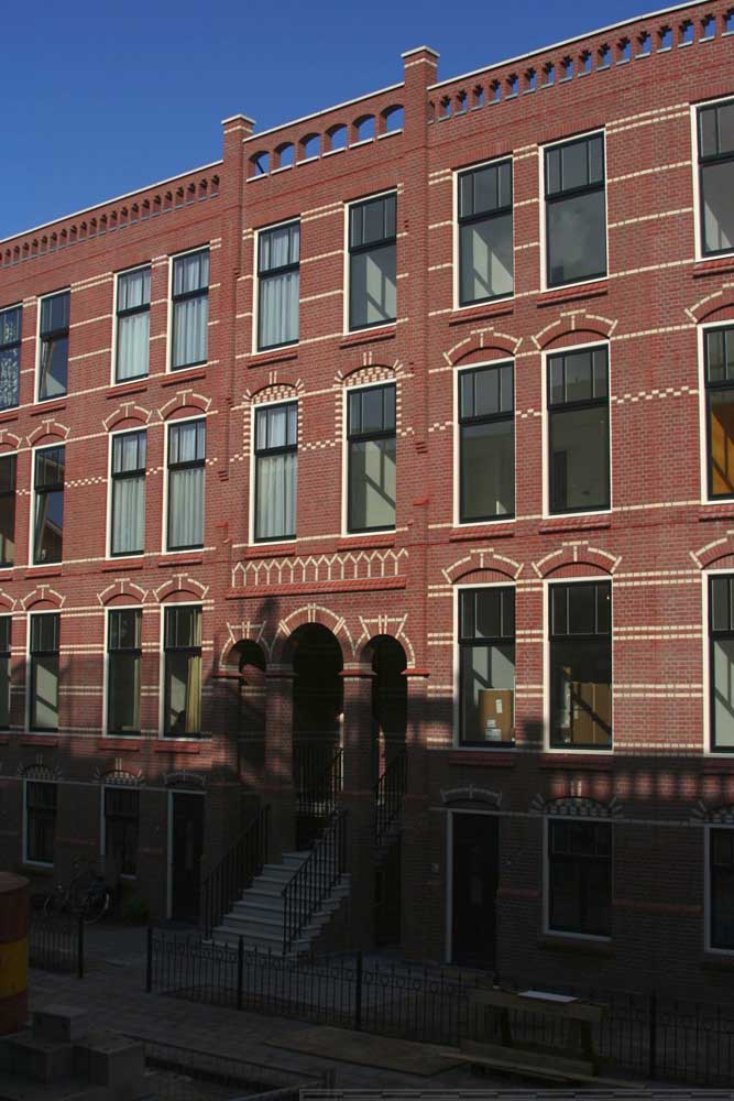 De in rode baksteen gemetselde straatwand bestaat uit beneden- en bovenwoningen zoals oorspronkelijk aanwezig. de toegang naar de bovenwoningen gaat middels een open haags portiek zoals dat in 19e eeuws den haag heel veel voorkomt. de plattegrond volgt die typologie: de begane grond woningen met een binnentrap van begane grond naar 1e verdieping worden ontsloten in de voortuinen.