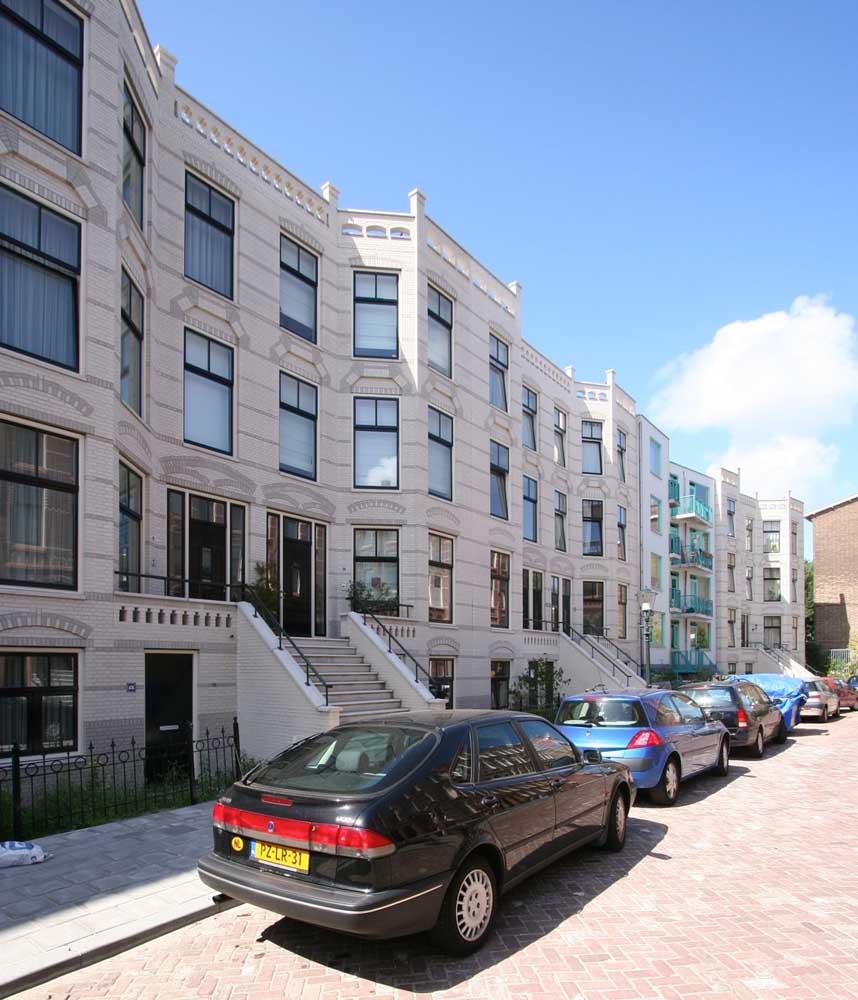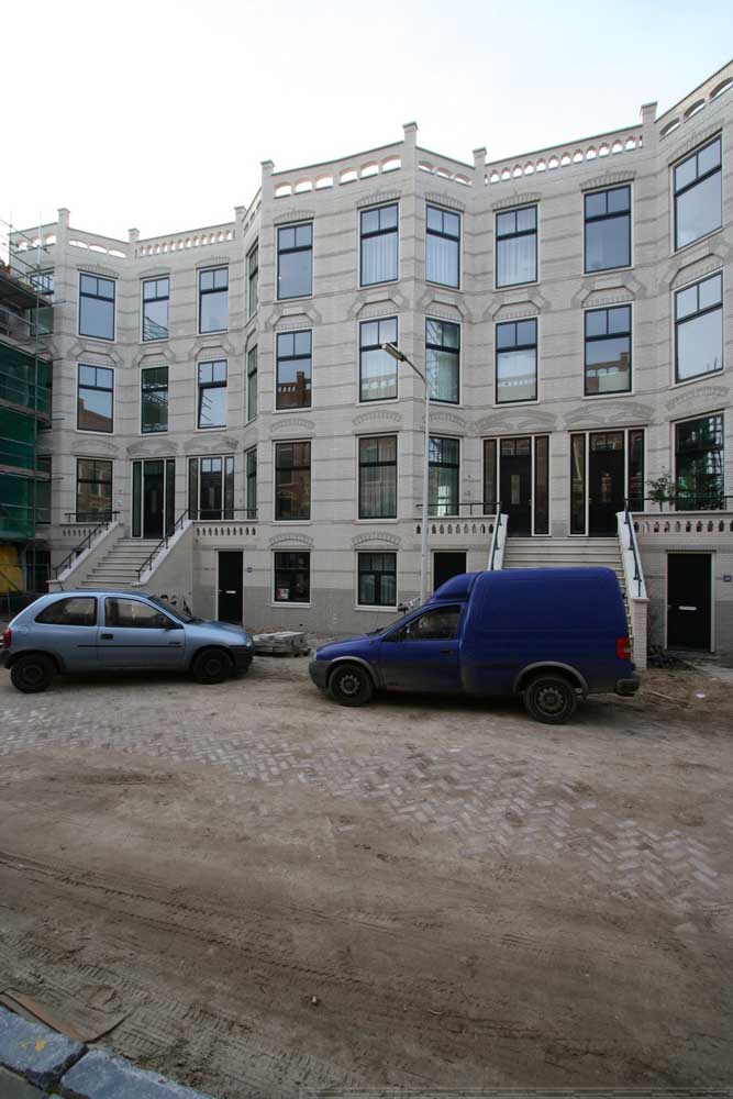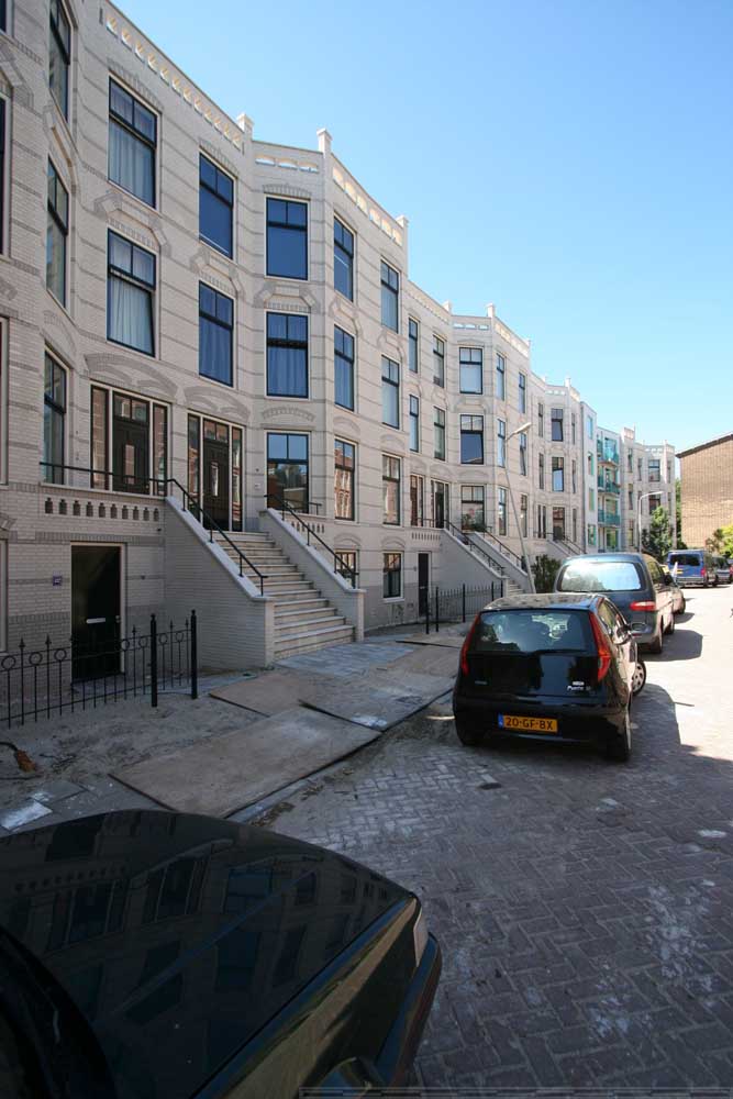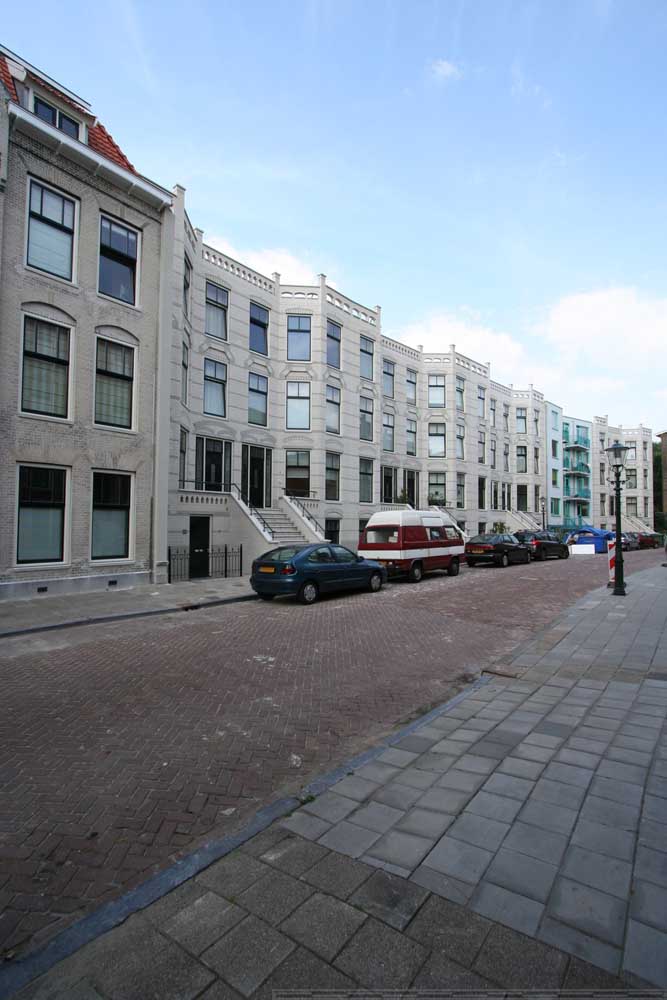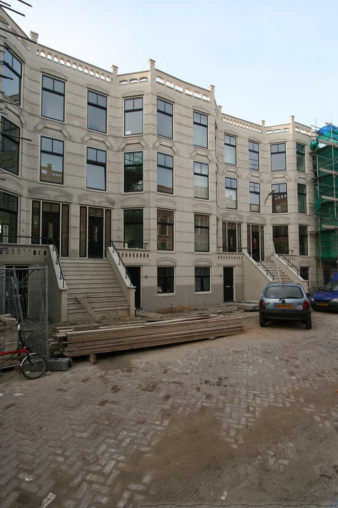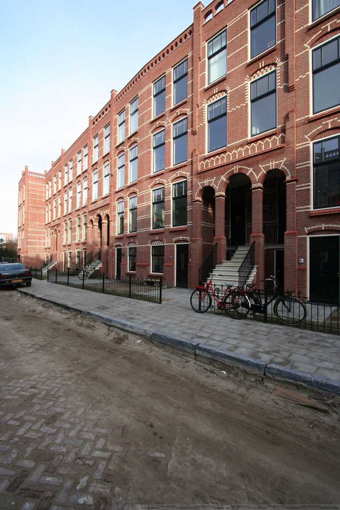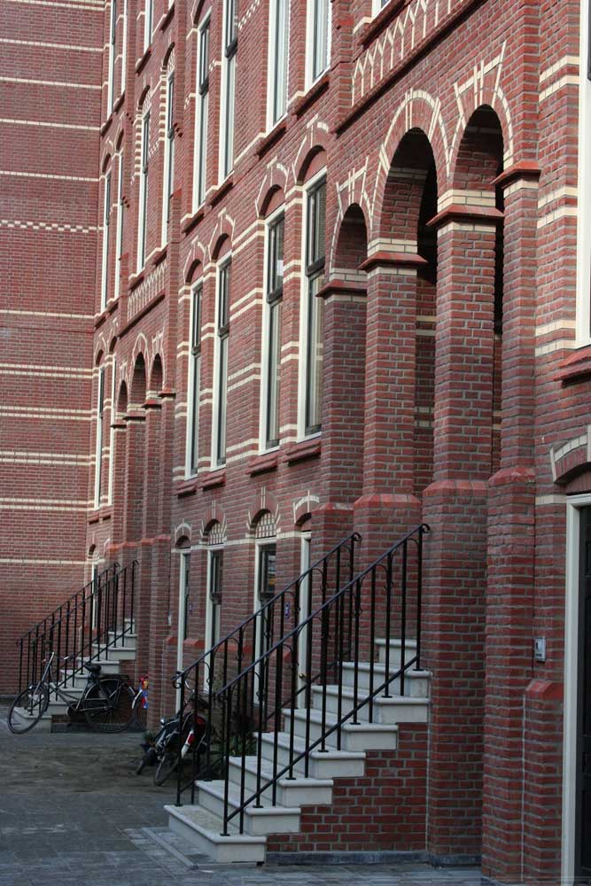 De in rode baksteen gemetselde straatwand bestaat uit beneden- en bovenwoningen zoals oorspronkelijk aanwezig. de toegang naar de bovenwoningen gaat middels een open haags portiek zoals dat in 19e eeuws den haag heel veel voorkomt. de plattegrond volgt die typologie: de begane grond woningen met een binnentrap van begane grond naar 1e verdieping worden ontsloten in de voortuinen.