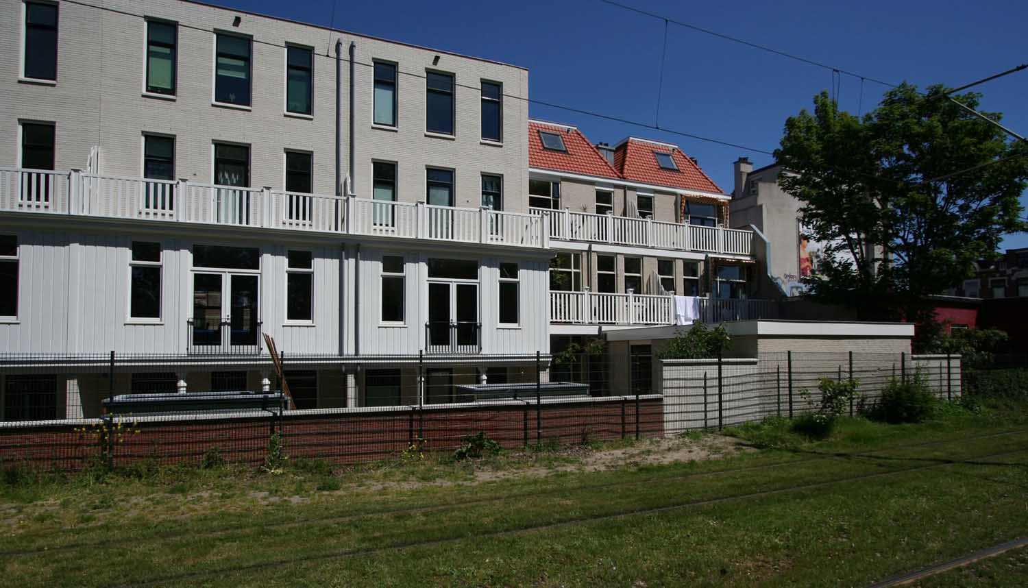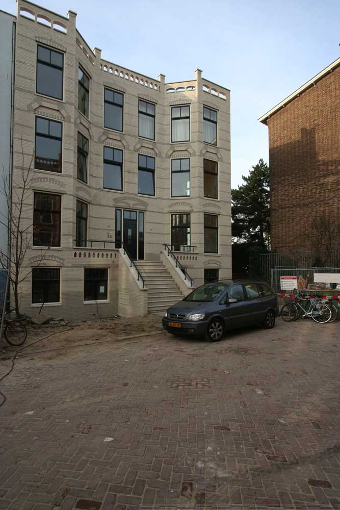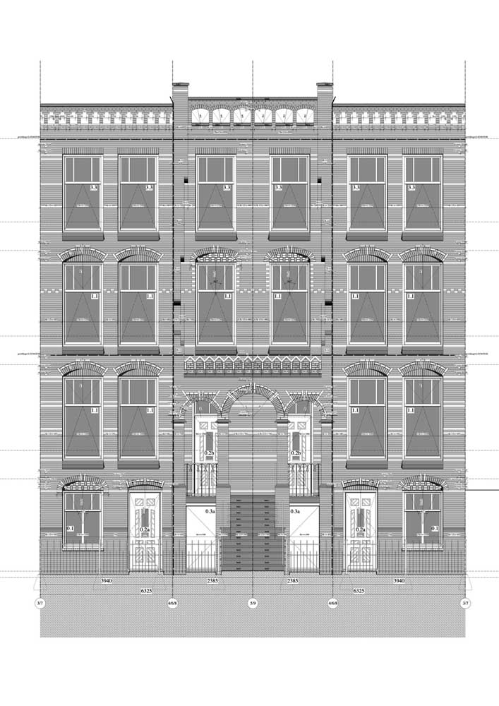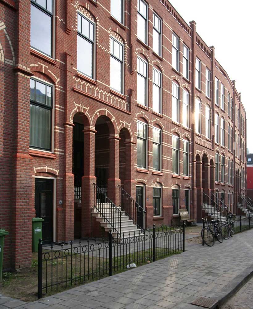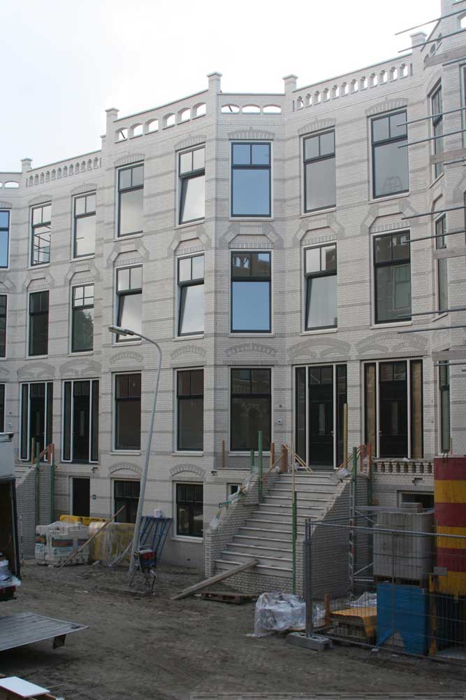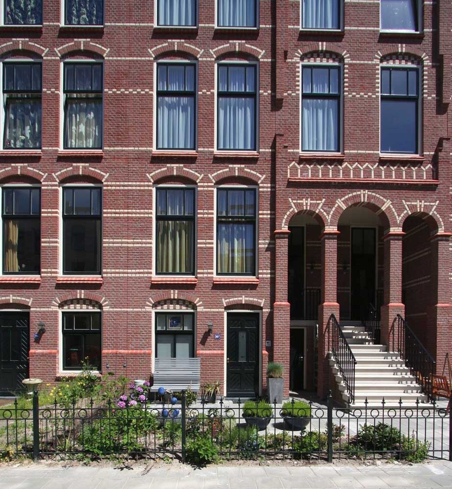 De in rode baksteen gemetselde straatwand bestaat uit beneden- en bovenwoningen zoals oorspronkelijk aanwezig. de toegang naar de bovenwoningen gaat middels een open haags portiek zoals dat in 19e eeuws den haag heel veel voorkomt. de plattegrond volgt die typologie: de begane grond woningen met een binnentrap van begane grond naar 1e verdieping worden ontsloten in de voortuinen.
