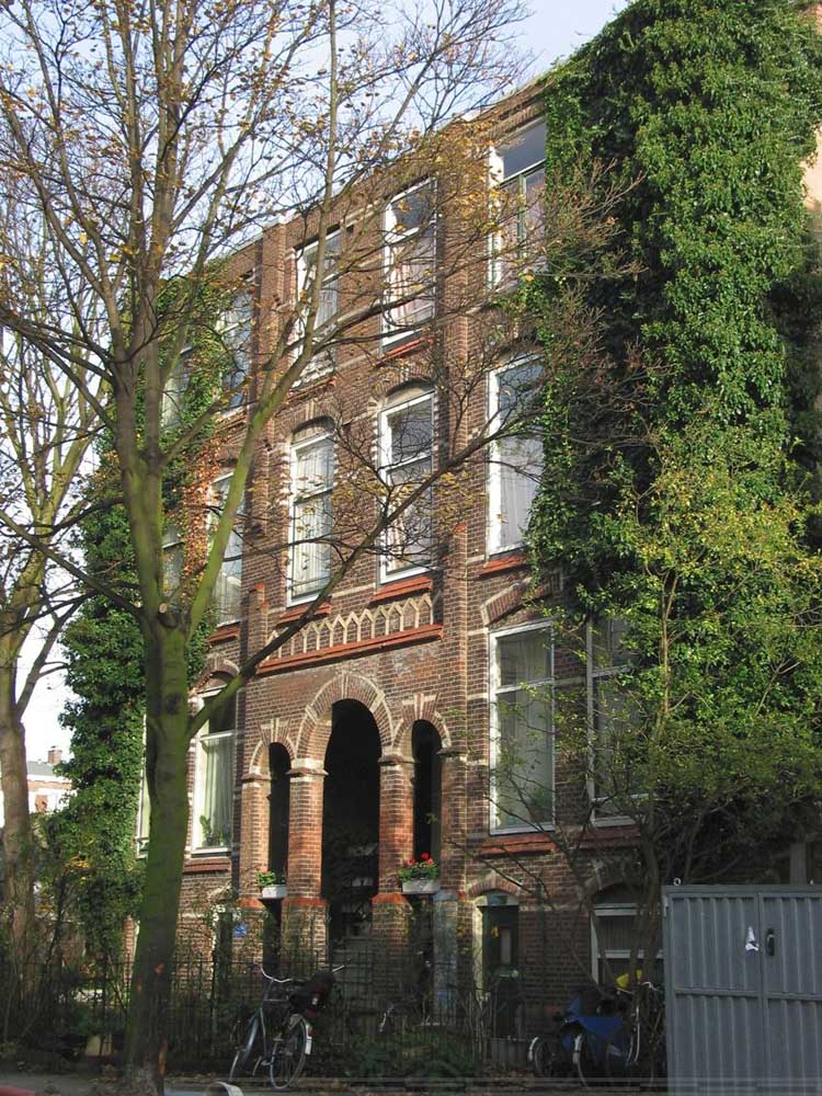 De in een grijze baksteen gemetselde straatwand bestaat uit herenhuizen met op de kop een groepswoning voor studenten.