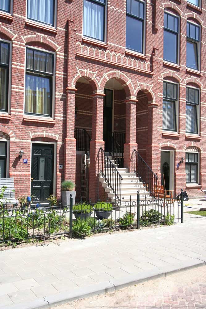 De herenhuizen hebben een bordes met voordeur op de beletage met een toegangstrap zoals we dat van amerikaanse films kennen. voor de toegankelijkheid is een tweede toegang op maaiveld aanwezig waarmee je in de huishoudelijke onderverdieping binnenkomt. mocht je slecht ter been zijn dan zul je in je eigen woning een traplift moeten monteren.