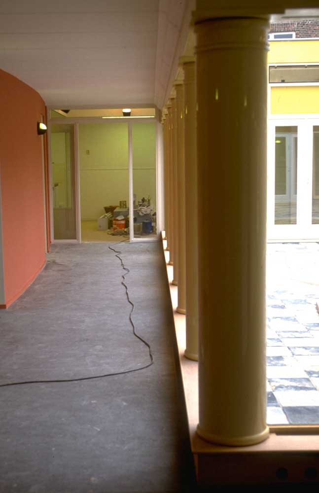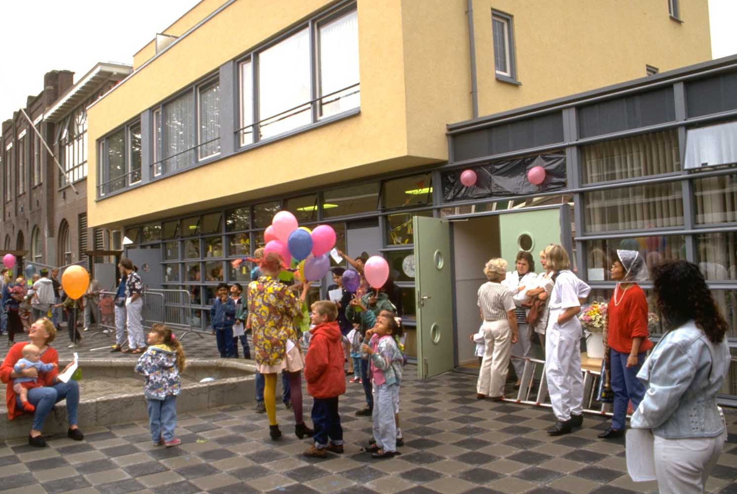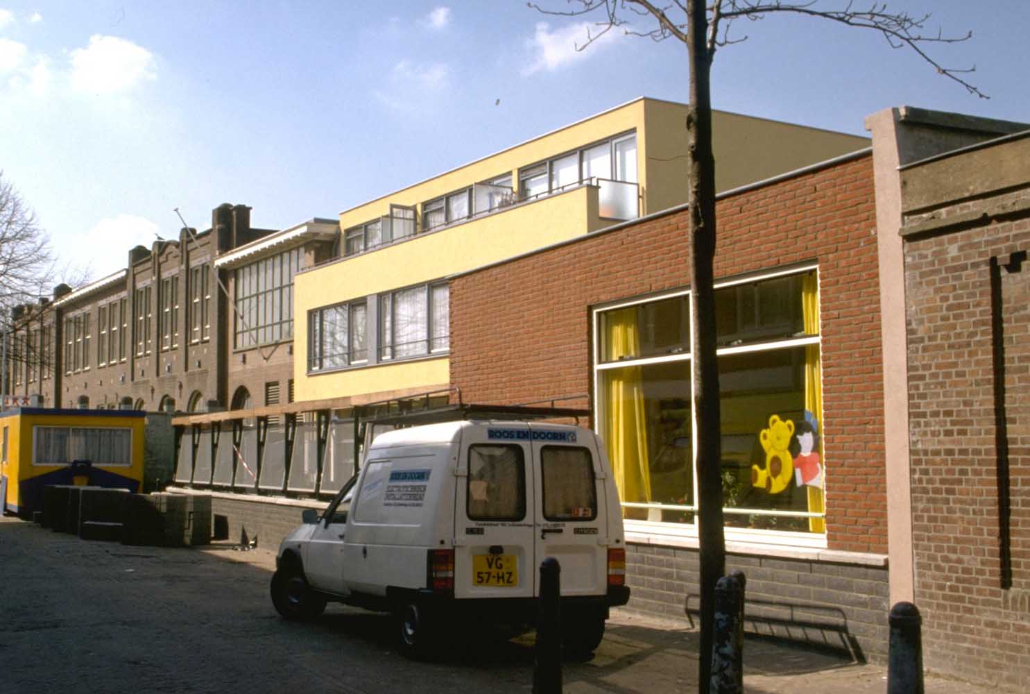 Op een groot binnenterrein –ooit het sportveld van een vlakbij gelegen katholiek scholencomplex– is naast een andere school een kinderdagverblijf met bovenwoningen gebouwd.