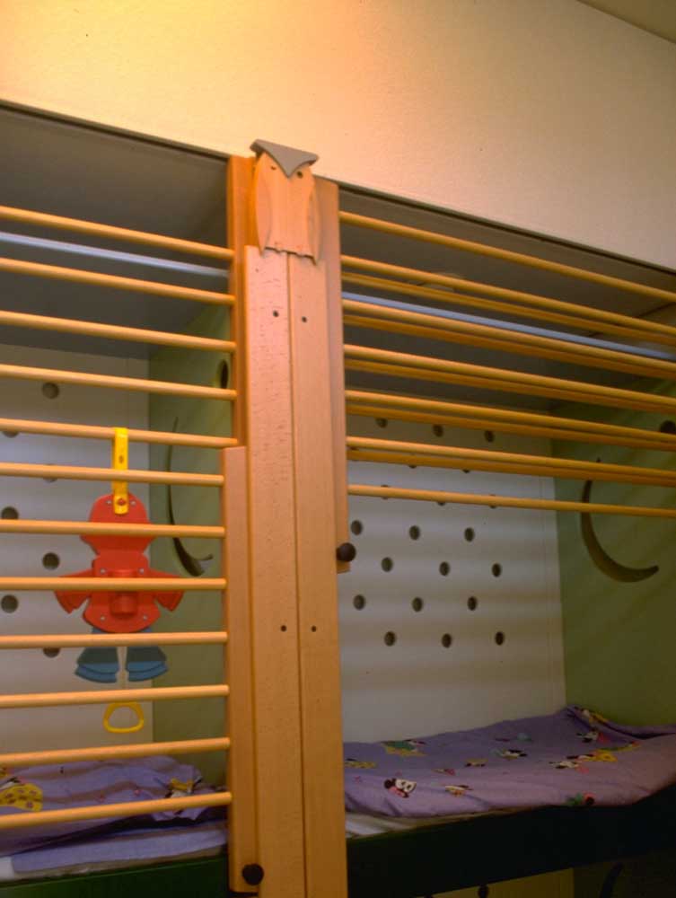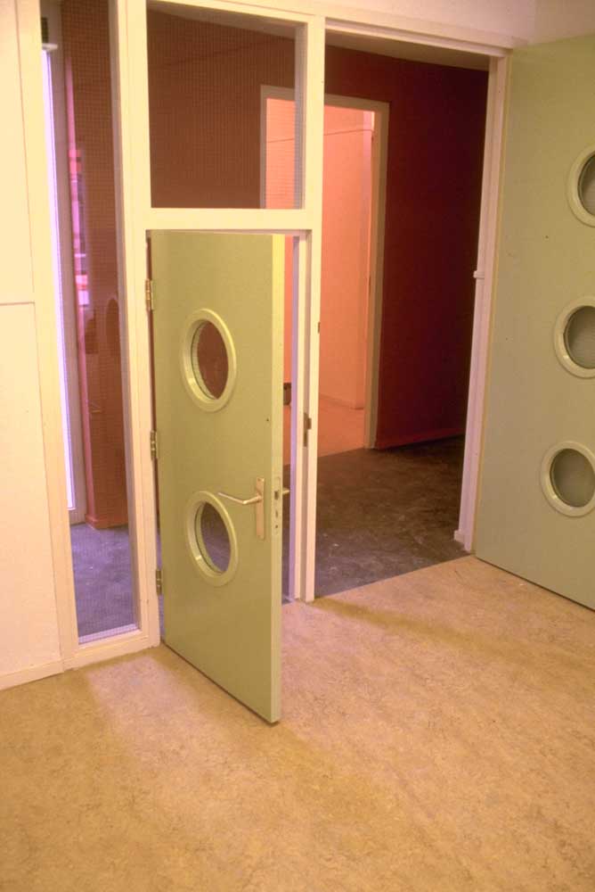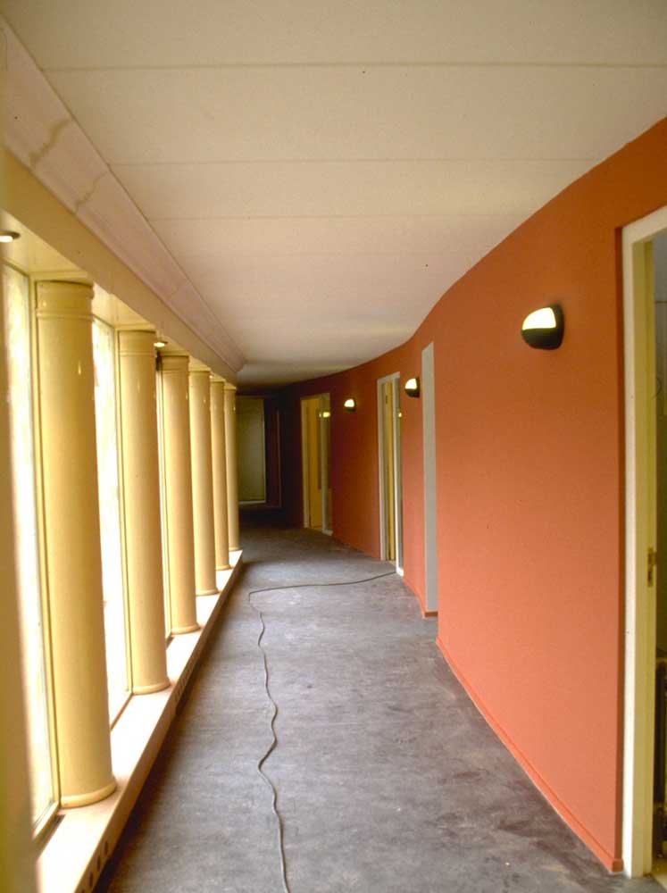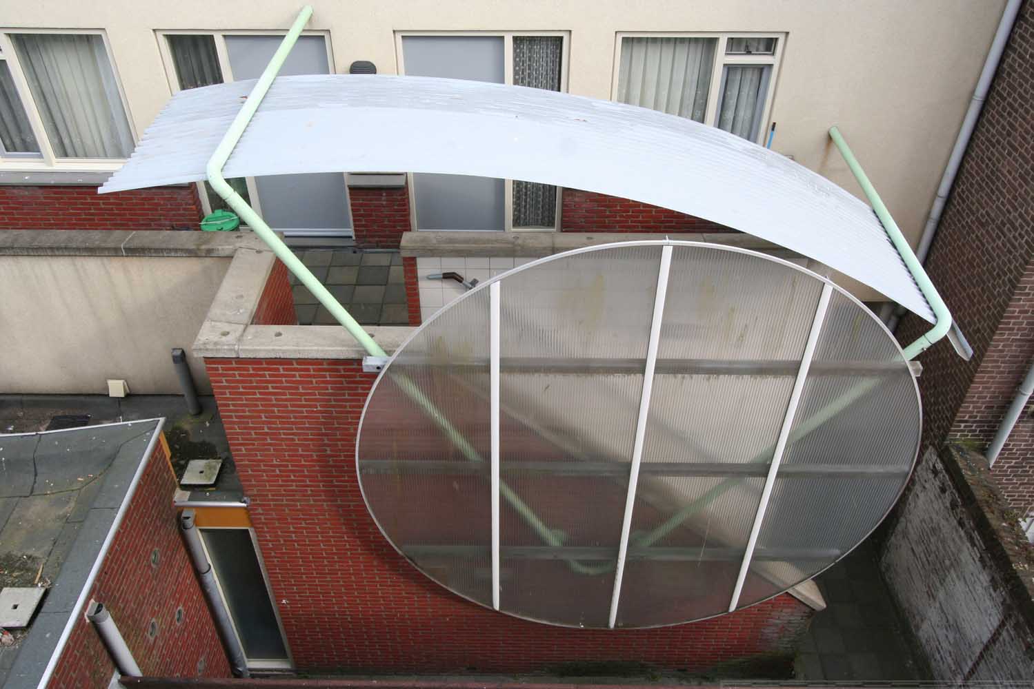 Op een groot binnenterrein –ooit het sportveld van een vlakbij gelegen katholiek scholencomplex– is naast een andere school een kinderdagverblijf met bovenwoningen gebouwd.