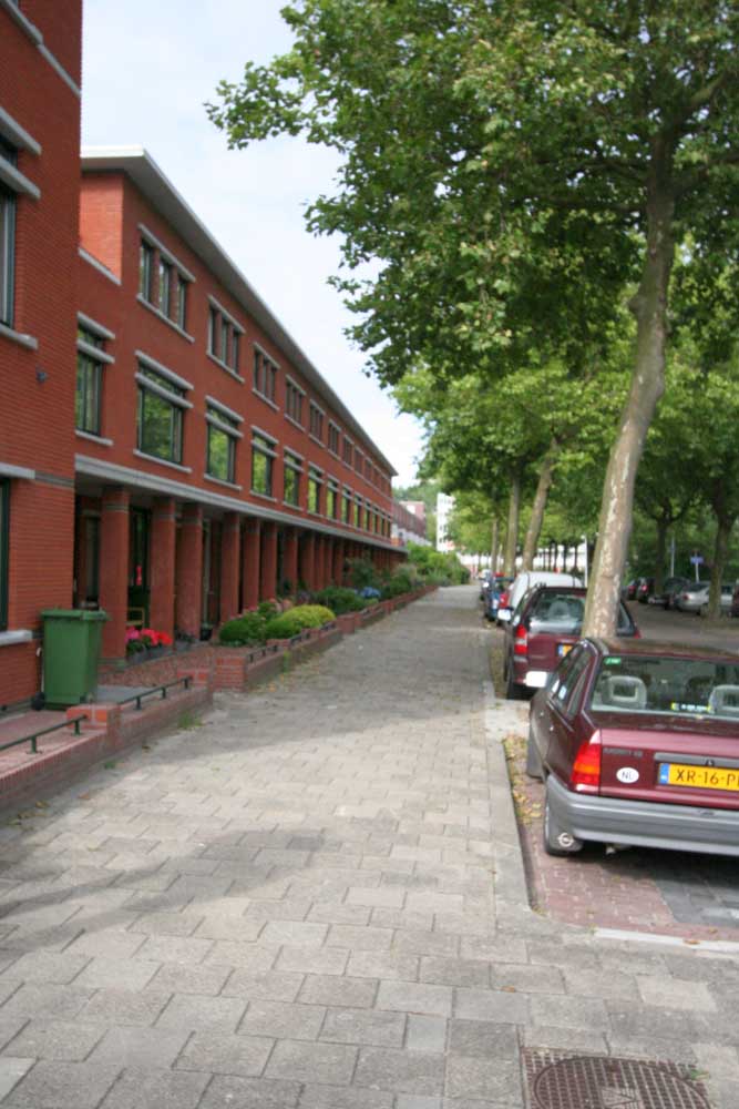 Het plan heeft verandaas aan de straat: de eetkamer heeft hierdoor een beschutte uitloop in de zon. Een karakteristiek dubbel hoekhuis markeert de zijstraat. Ter plaatse van de entree naar het achtererf is een kopwoning met ronde uitbouw voorgesteld. Parkeren op het achtererf gebeurt naar keuze van de bewoners in carports, garages of een achterhuis.