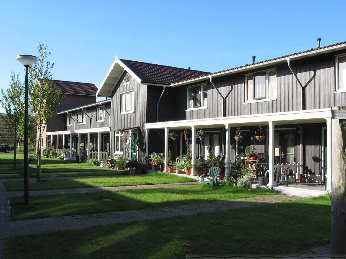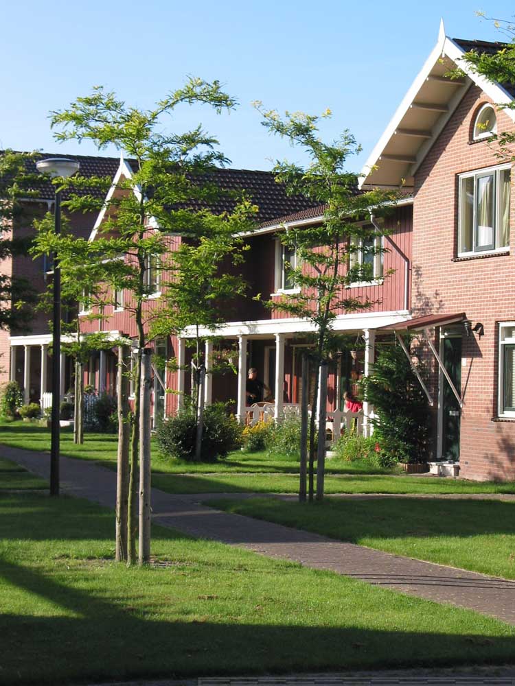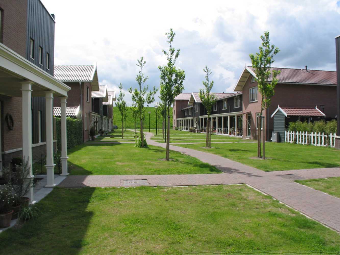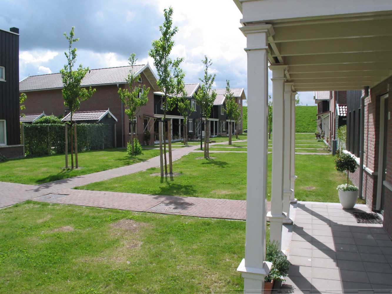 De woningen die hieraan liggen hebben behalve een voordeur een uitloop vanuit de woonkamer dmv een verhoogde veranda. De autotoegankelijkheid is gerealiseerd aan hoven. Via afsluitbare poorten is voor elke woning de eigen parkeerplaats in de achtertuin bereikbaar. Door de bergingen zorgvuldig niet op een rij te zetten en door verschillende dakvormen toe te passen is een kleinschalig informeel binnenerf ontstaan waar een Gammaschutting niet detoneert. De woningen aan de laantjes zijn bekleed met verticale sidings in een palet van Zweeds-rood, Zuidengels-donkerbruin, en Amerikaans-beige. De kopwoningen zijn gemetseld in een rode handvormsteen.