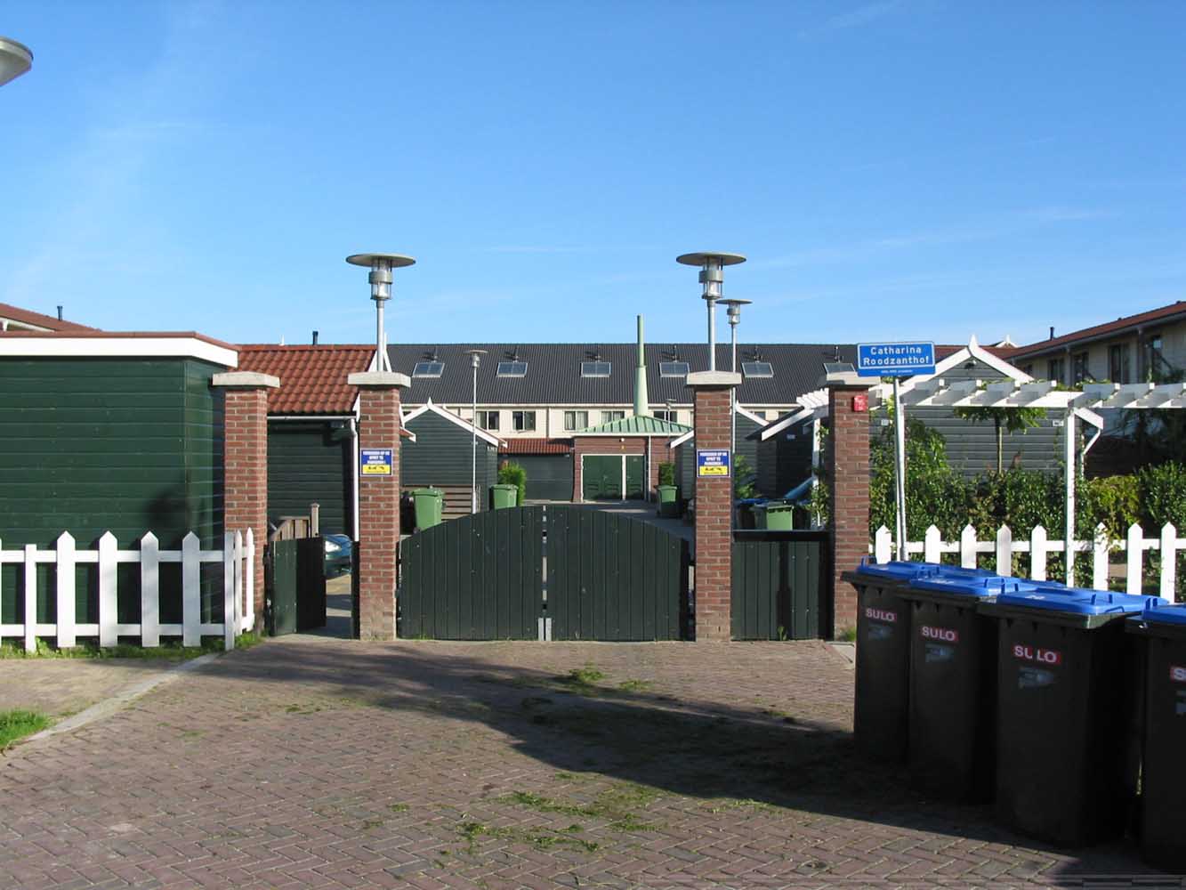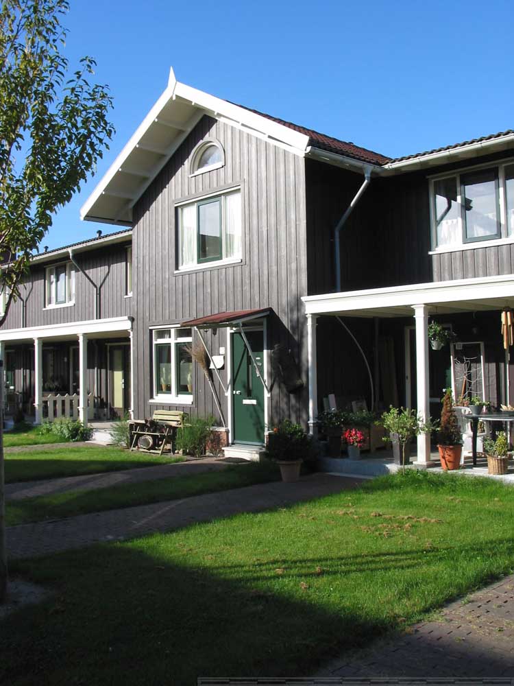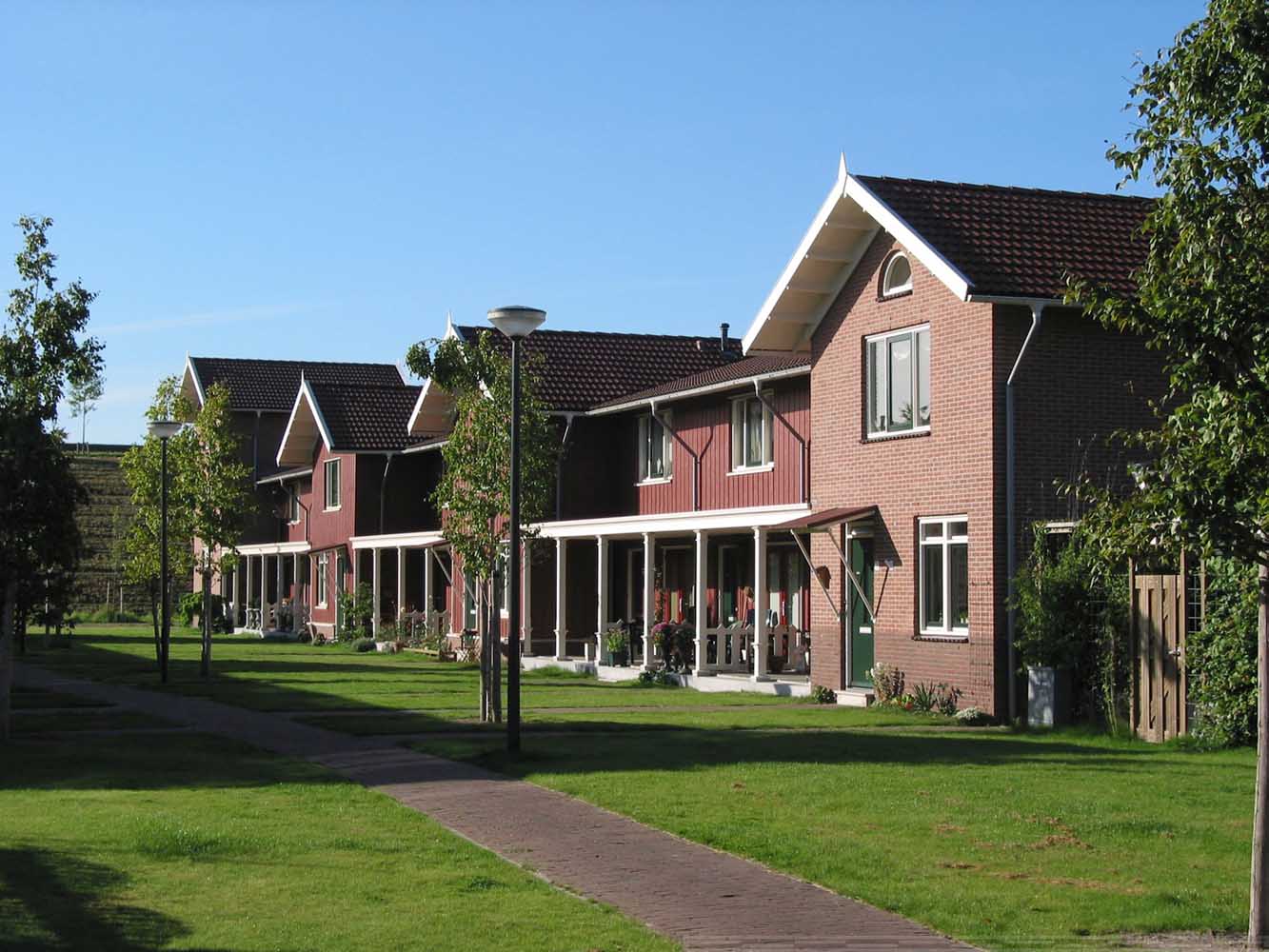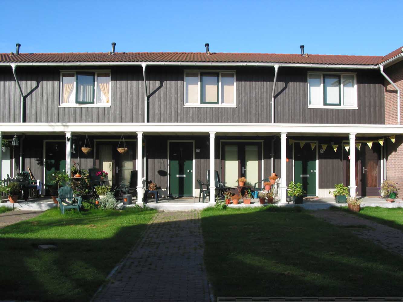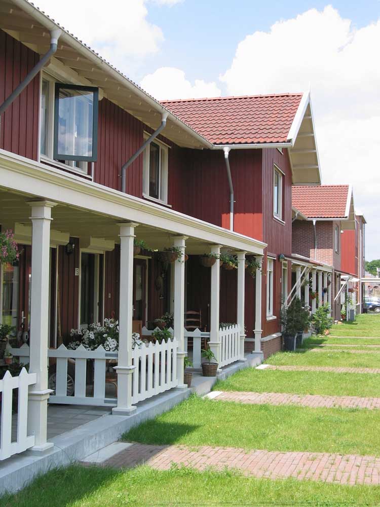 De woningen die hieraan liggen hebben behalve een voordeur een uitloop vanuit de woonkamer dmv een verhoogde veranda. De autotoegankelijkheid is gerealiseerd aan hoven. Via afsluitbare poorten is voor elke woning de eigen parkeerplaats in de achtertuin bereikbaar. Door de bergingen zorgvuldig niet op een rij te zetten en door verschillende dakvormen toe te passen is een kleinschalig informeel binnenerf ontstaan waar een Gammaschutting niet detoneert. De woningen aan de laantjes zijn bekleed met verticale sidings in een palet van Zweeds-rood, Zuidengels-donkerbruin, en Amerikaans-beige. De kopwoningen zijn gemetseld in een rode handvormsteen.