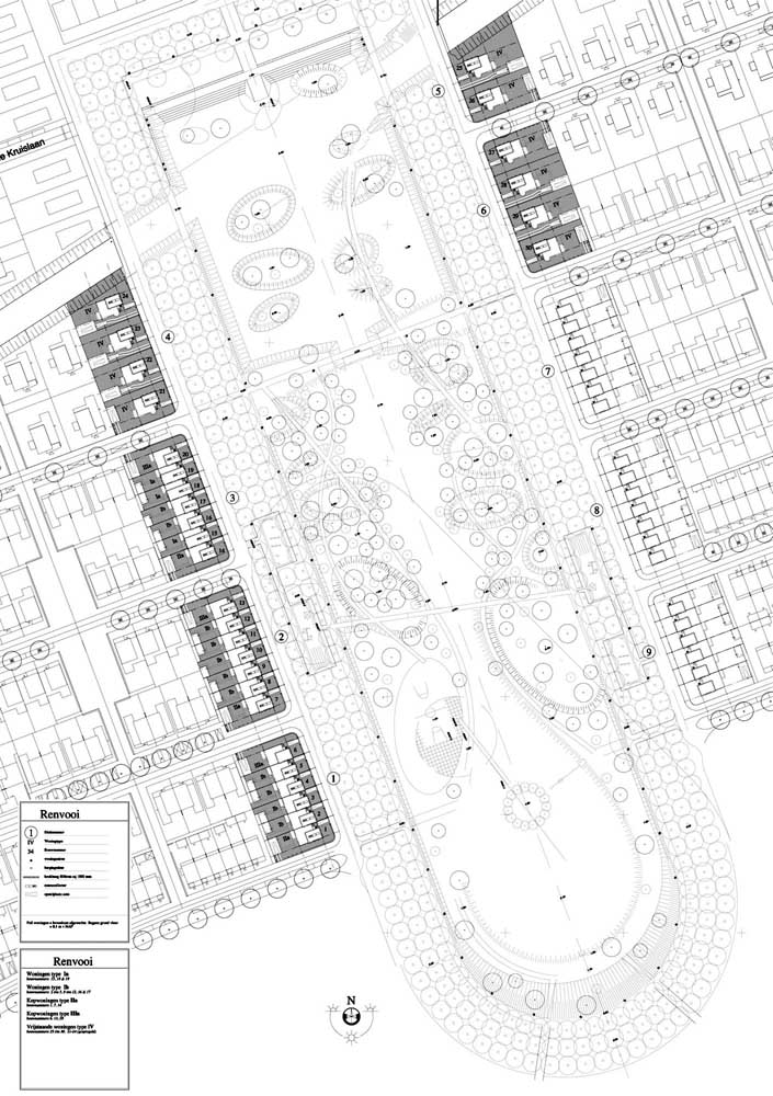 Om de woningen optimaal op het park te oriënteren is de zithoek van de woonkamer verhoogd zodat over de voortuin en de laan zicht is tot diep in het park. Deze getrapte doorsnede levert een royale hoogte op voor de woon- eetkamer aan de tuinzijde. De vrijstaande woningen hebben een spiltrap met vide in een uitgemetseld trappenhuis. Alle woningen kunnen met halve blinden de mate van openheid naar de parkzijde instellen.