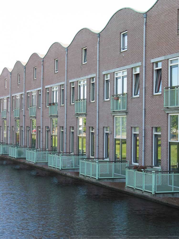 Een woning is uitgewerkt met de woonkamer aan het water op het noord-oosten en de keuken met eetplek aan de tuin op het zuidwesten. Door het nivoverschil met het water in de woning te leggen is een hoge woonkamer met buitenruimte aan het water ontstaan, een inpandige eetplak en een extra plek aan de tuin. Het gevelbeeld benadrukt de woningen als zelfstandige woningen naast elkaar met een beeld als een pakhuis of ‘dock’ gebouw.